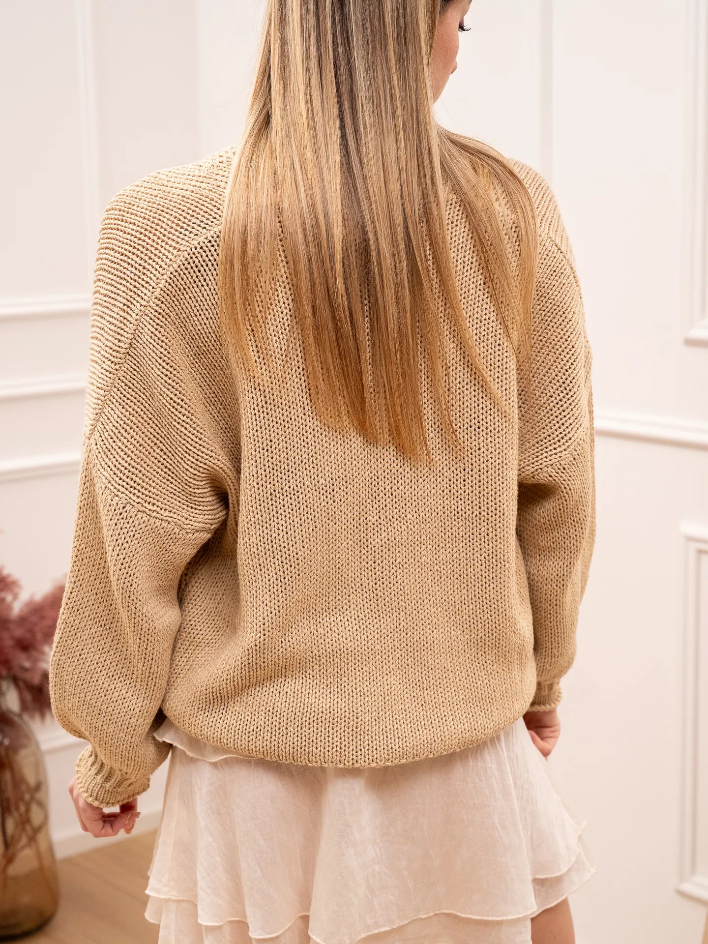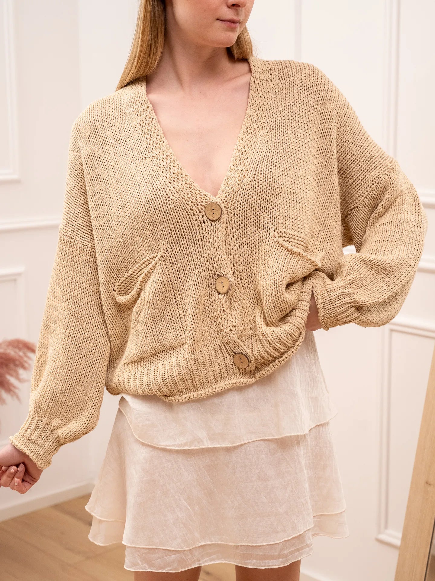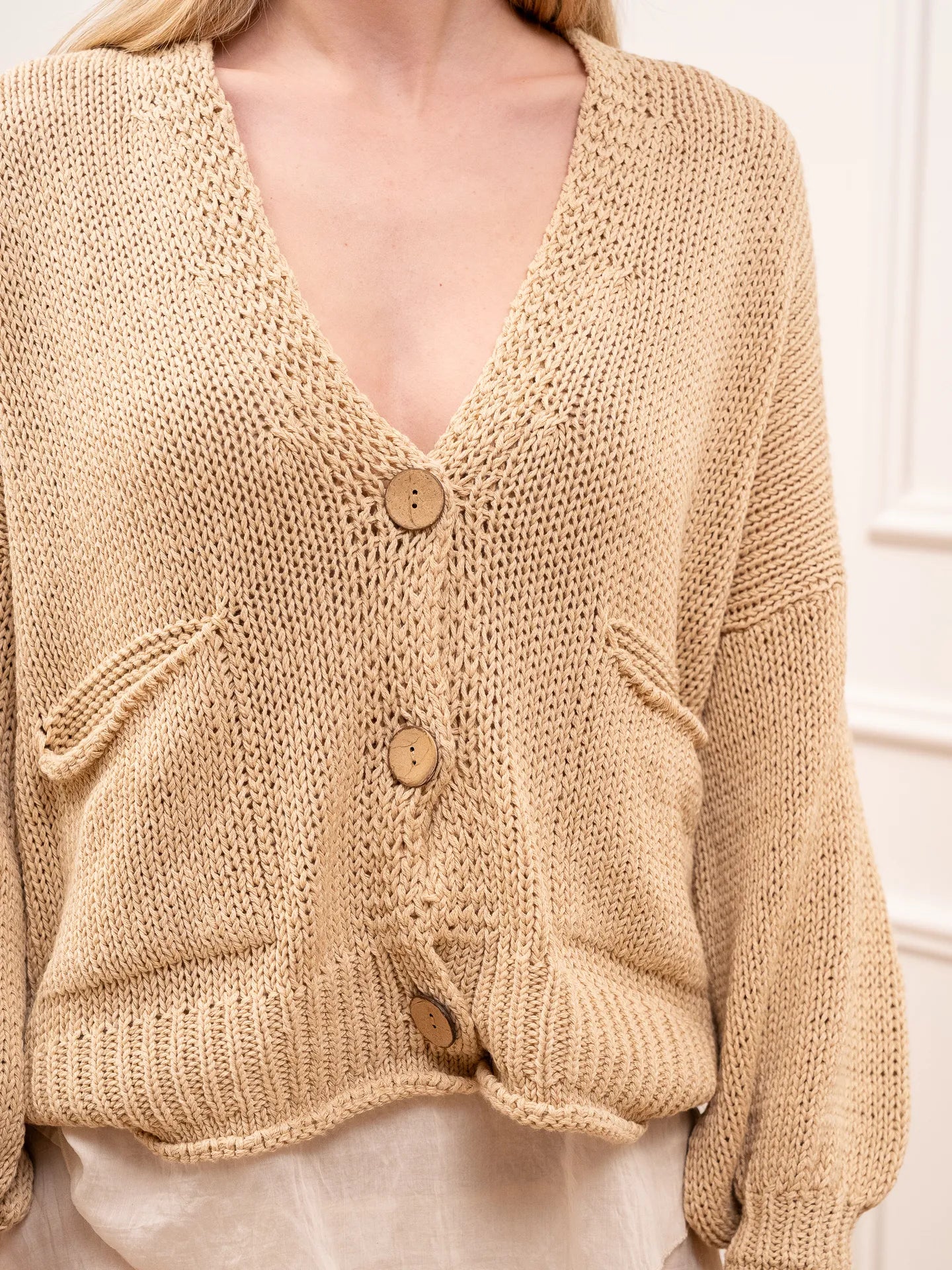 Cardigan color corda in cotone HaveOne. Modello fit morbido scollo a v, chiusura con bottoni in legno e dettaglio di bordi con ricciolo. Taschine frontali.