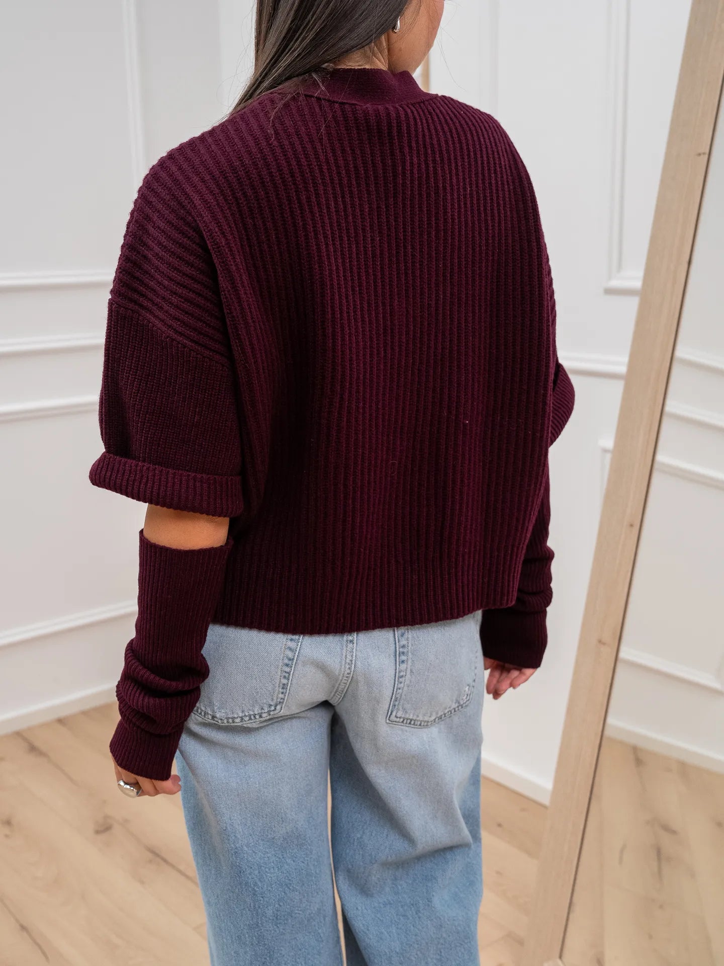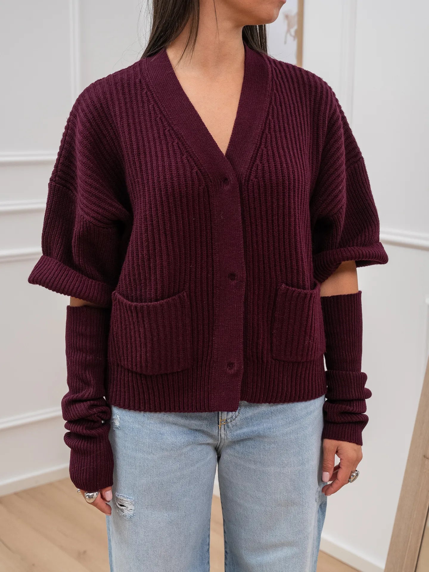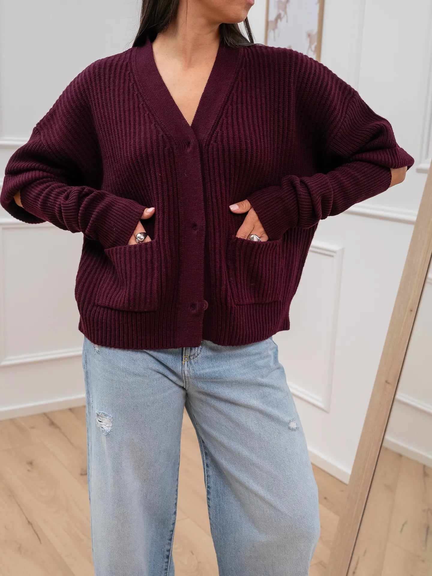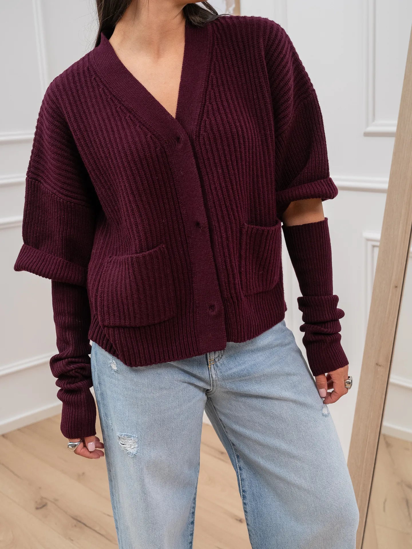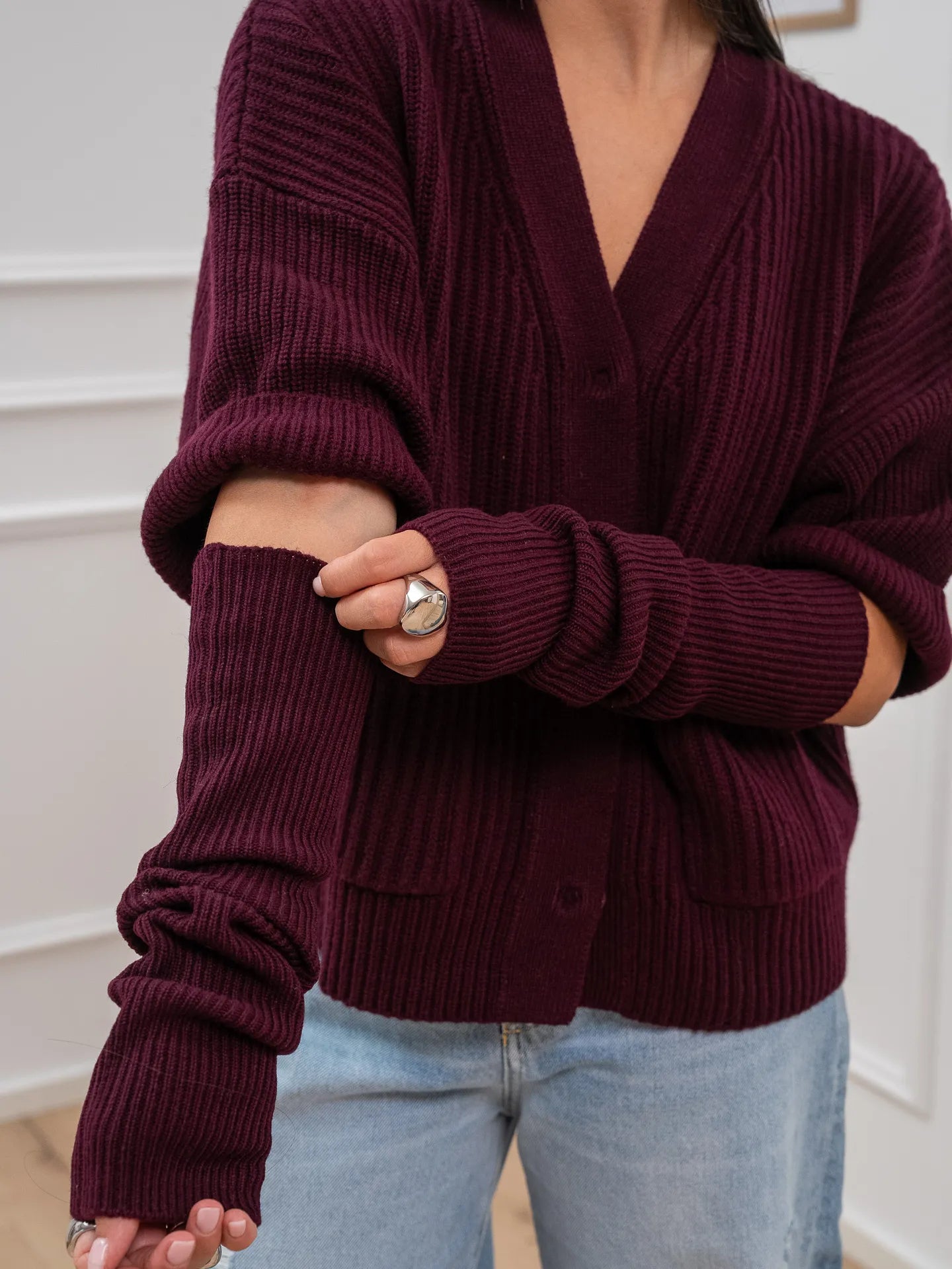 Cardigan color chianti in 100% lana Vicolo. Modello con scollo a v e mezza manica con risvolto. Dettaglio di manicotti e tasche frontali. Chiusura frontale con bottoni nascosti a pressione.
