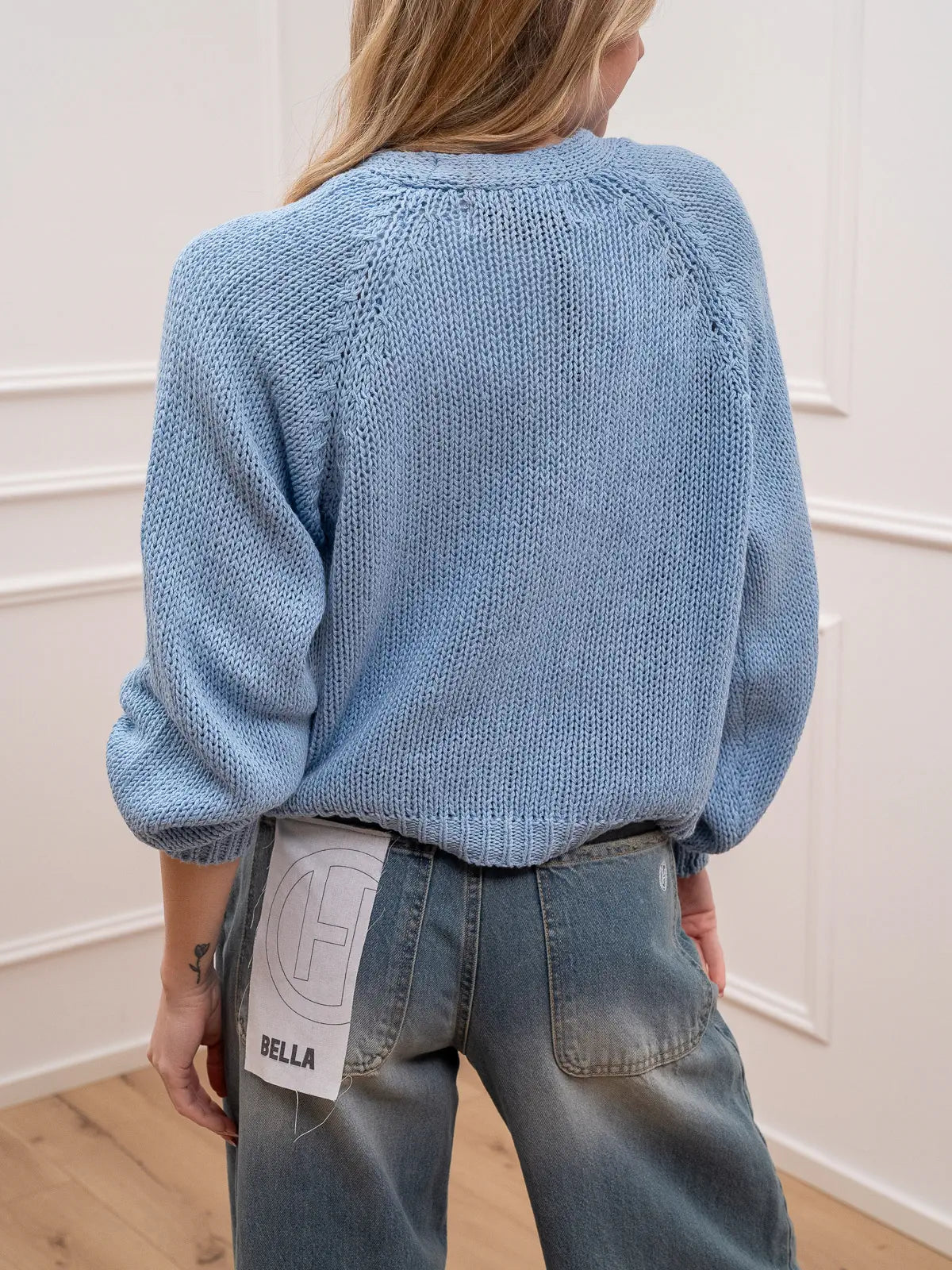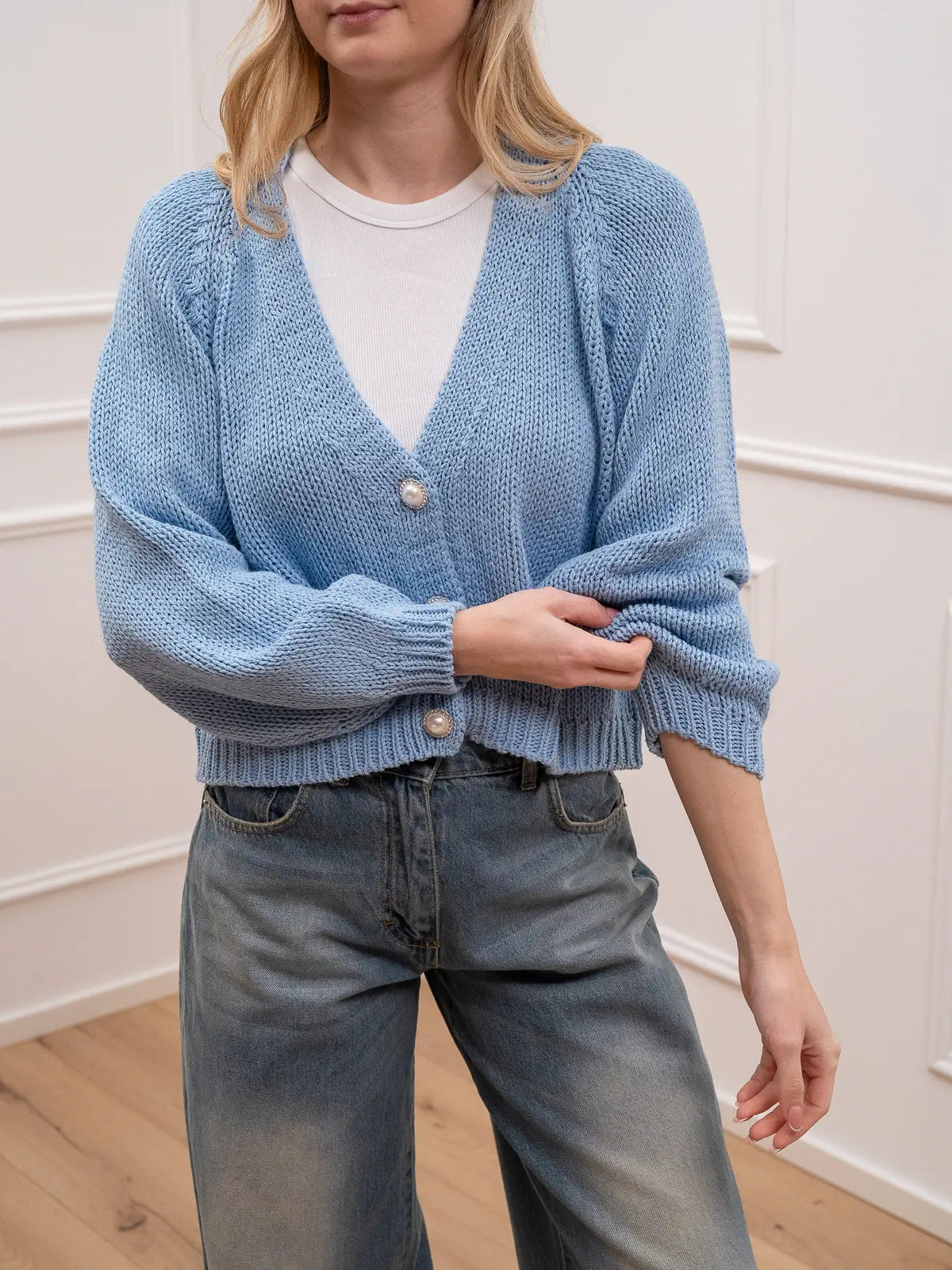 Cardigan color cielo in misto cotone HaveOne. Modello basic con scollo a v e dettaglio di chiusura con bottoni gioiello. Manica lunga a palloncino con polsino sul fondo.