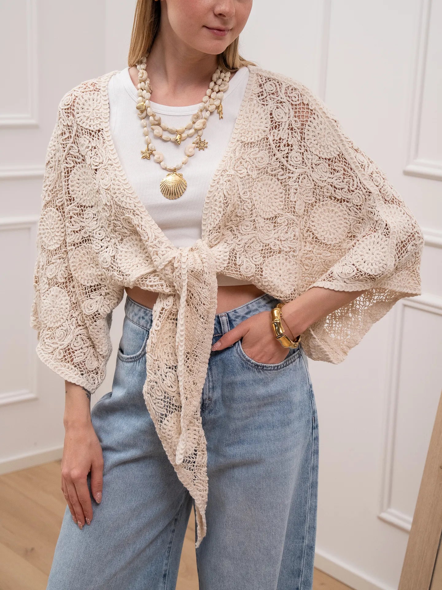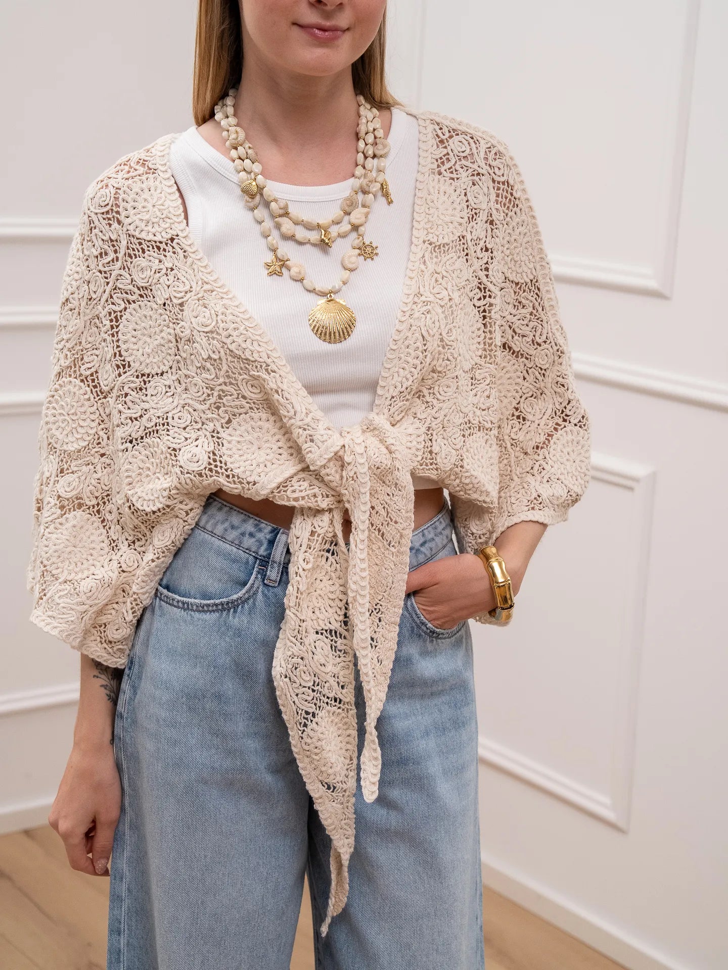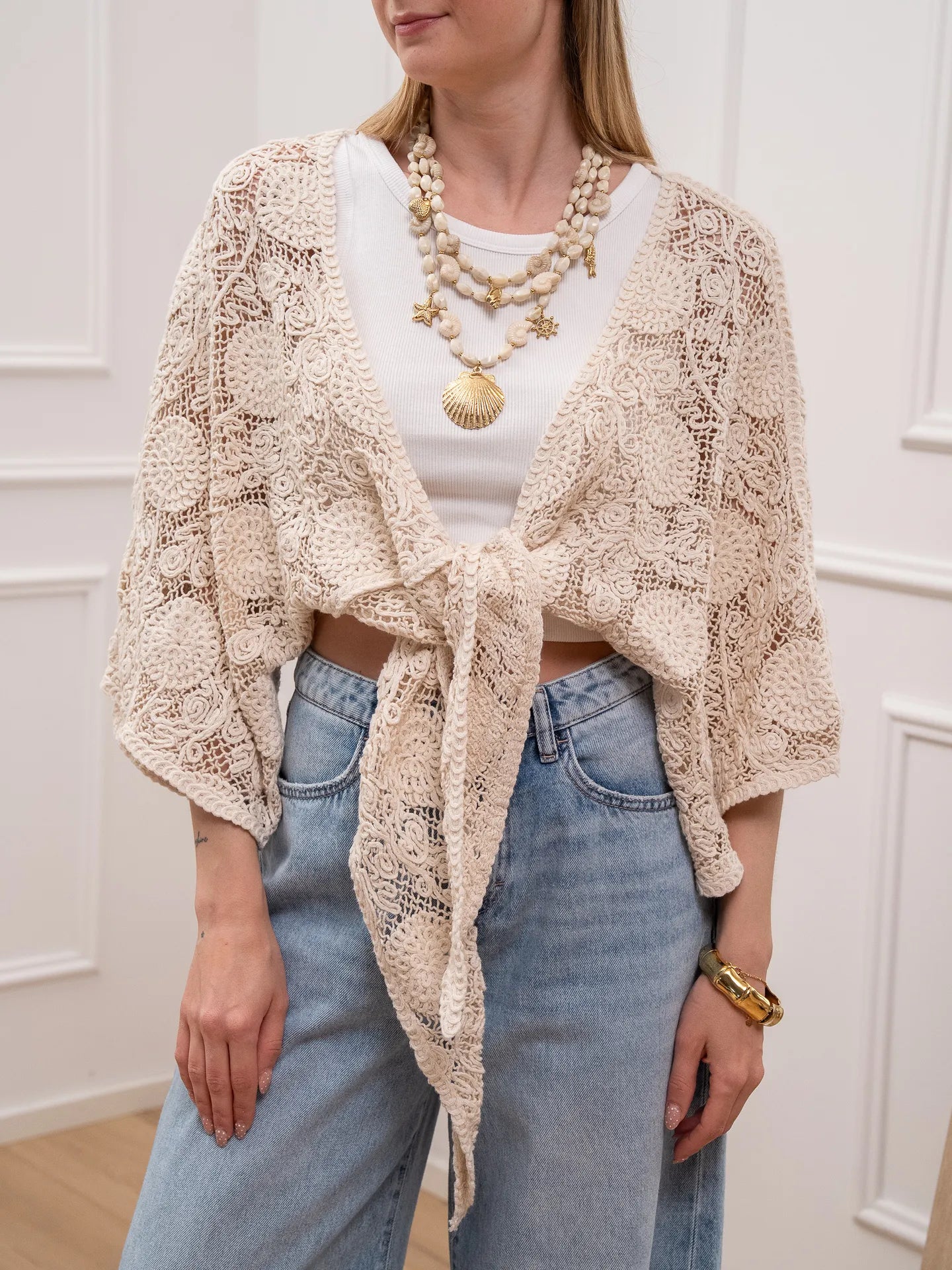 Cardigan crochet naturale con nodo - HaveOne