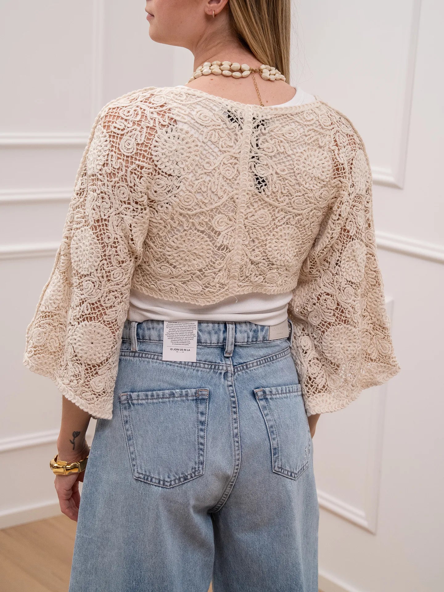 Cardigan crochet color naturale HaveOne. Modello fit cropped con maxi scollo a v e nodo frontale. Manica ampia a 3/4.