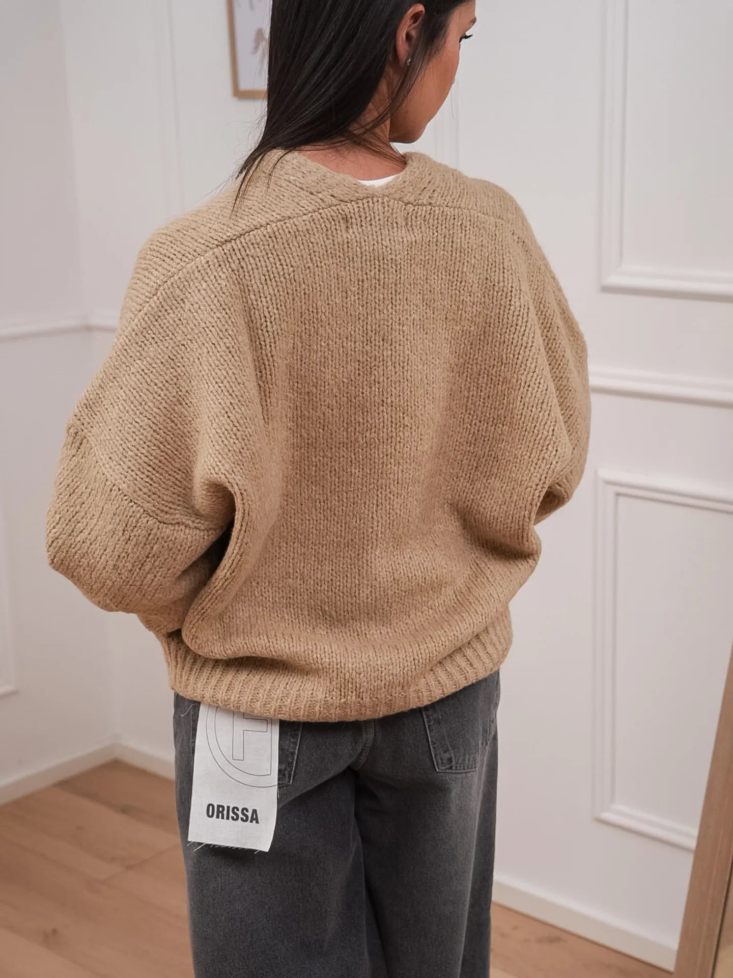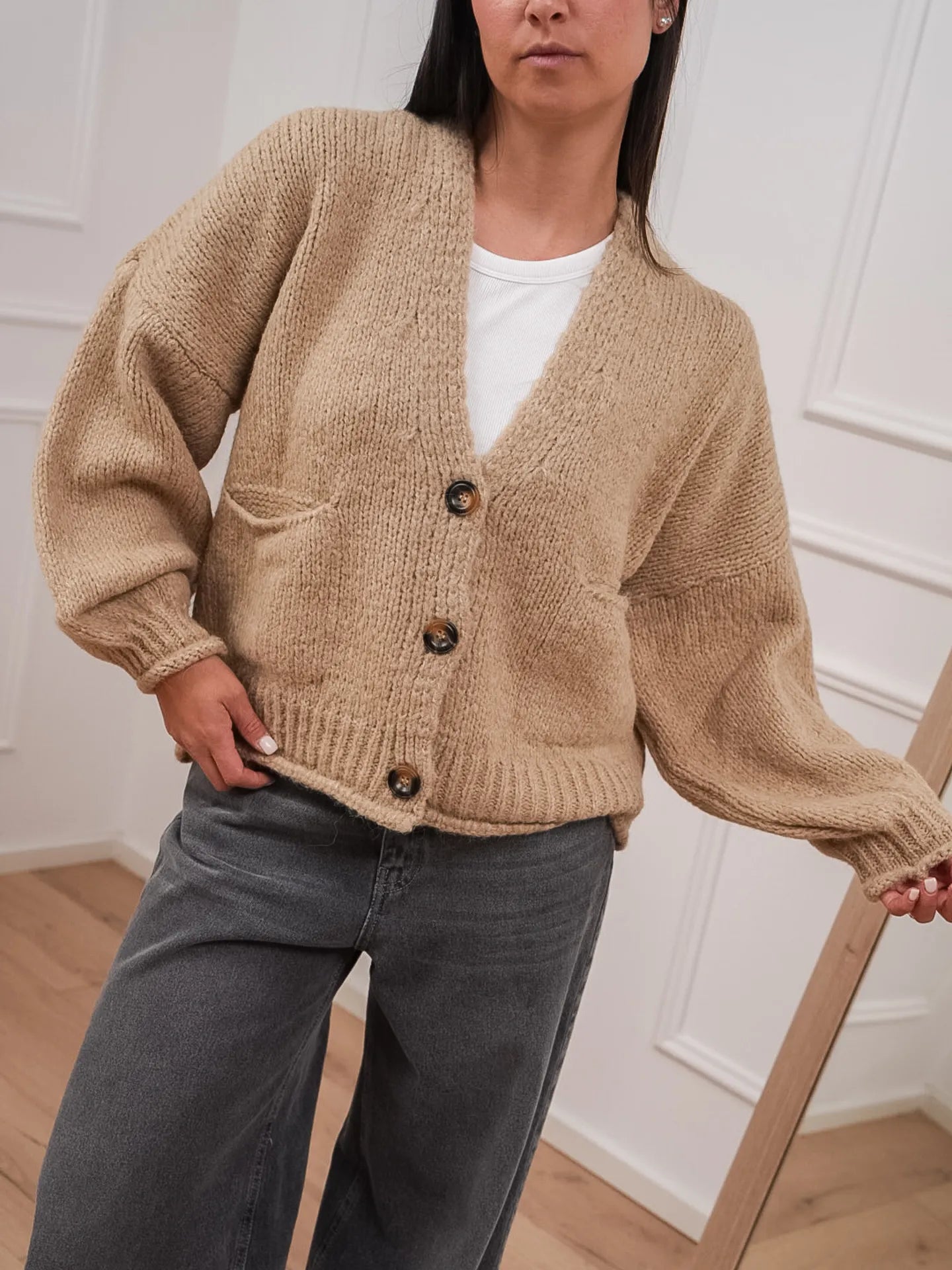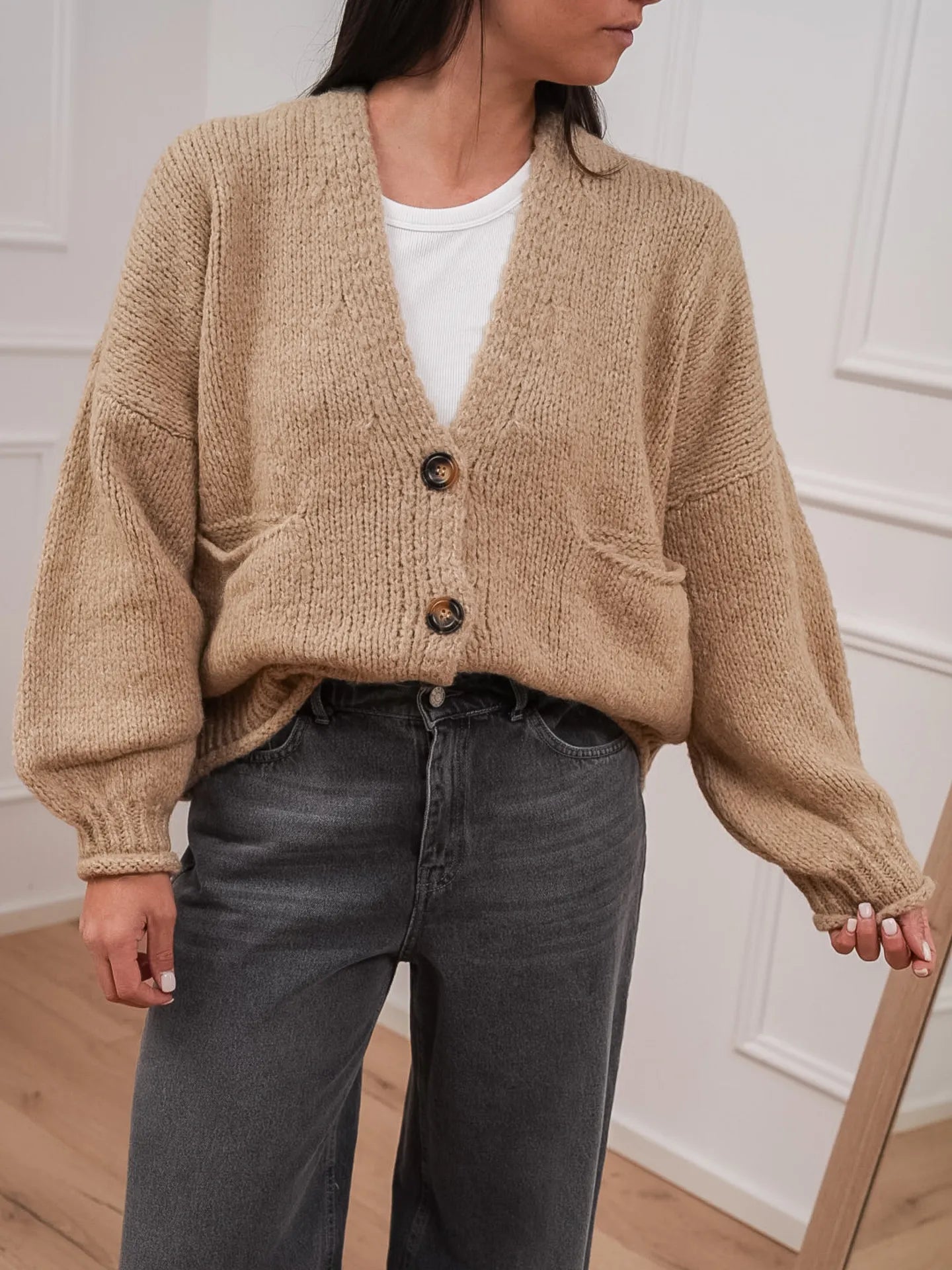 Cardigan color tortora HaveOne. Modello fit morbido con scollo a v e chiusura frontale a tre bottoni e dettaglio di taschine. Manica lunga a palloncino con spalla scesa e ricciolo sul polso.