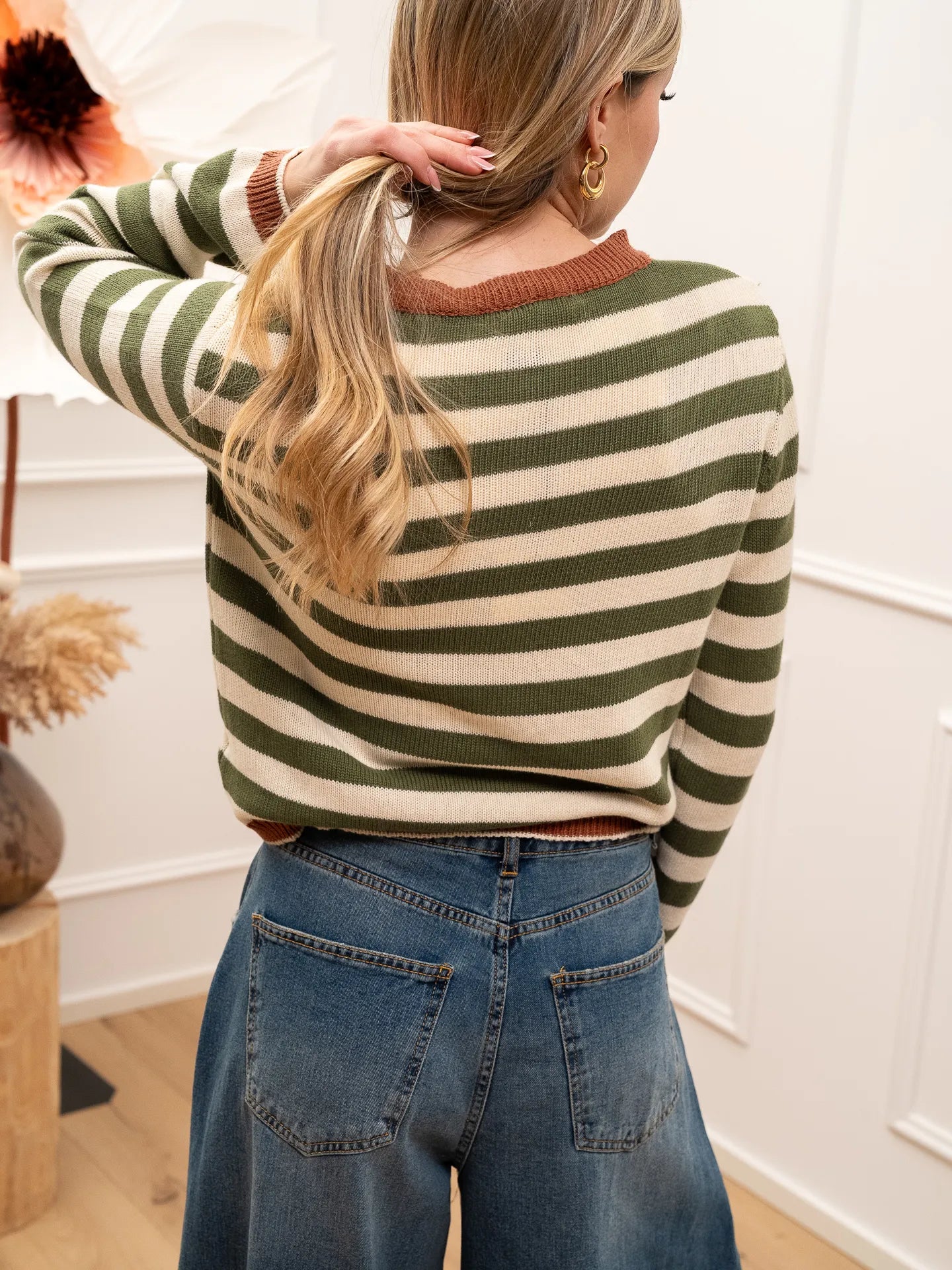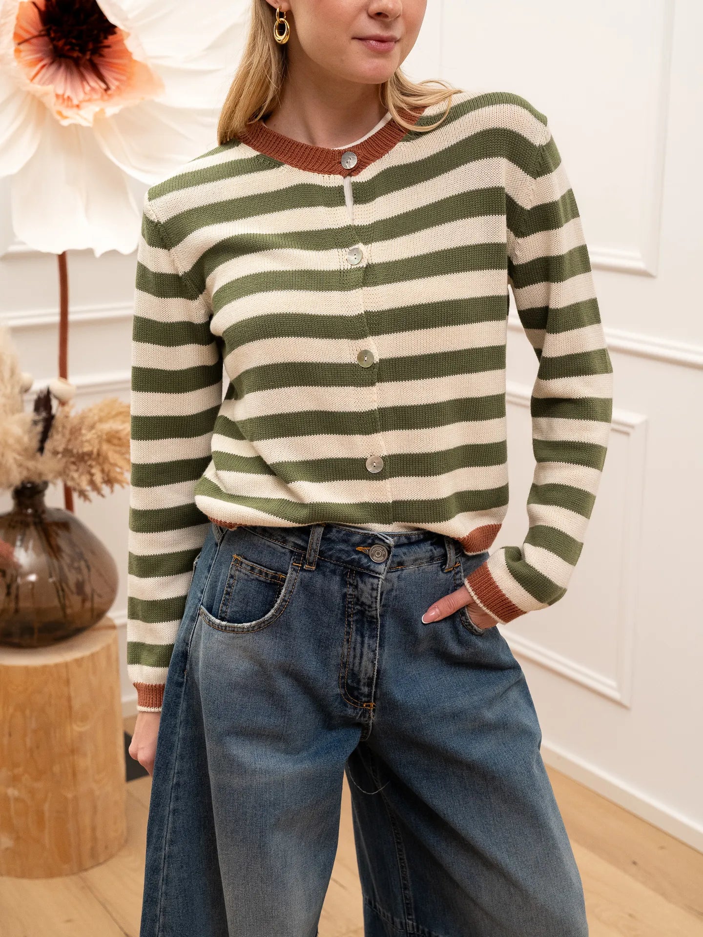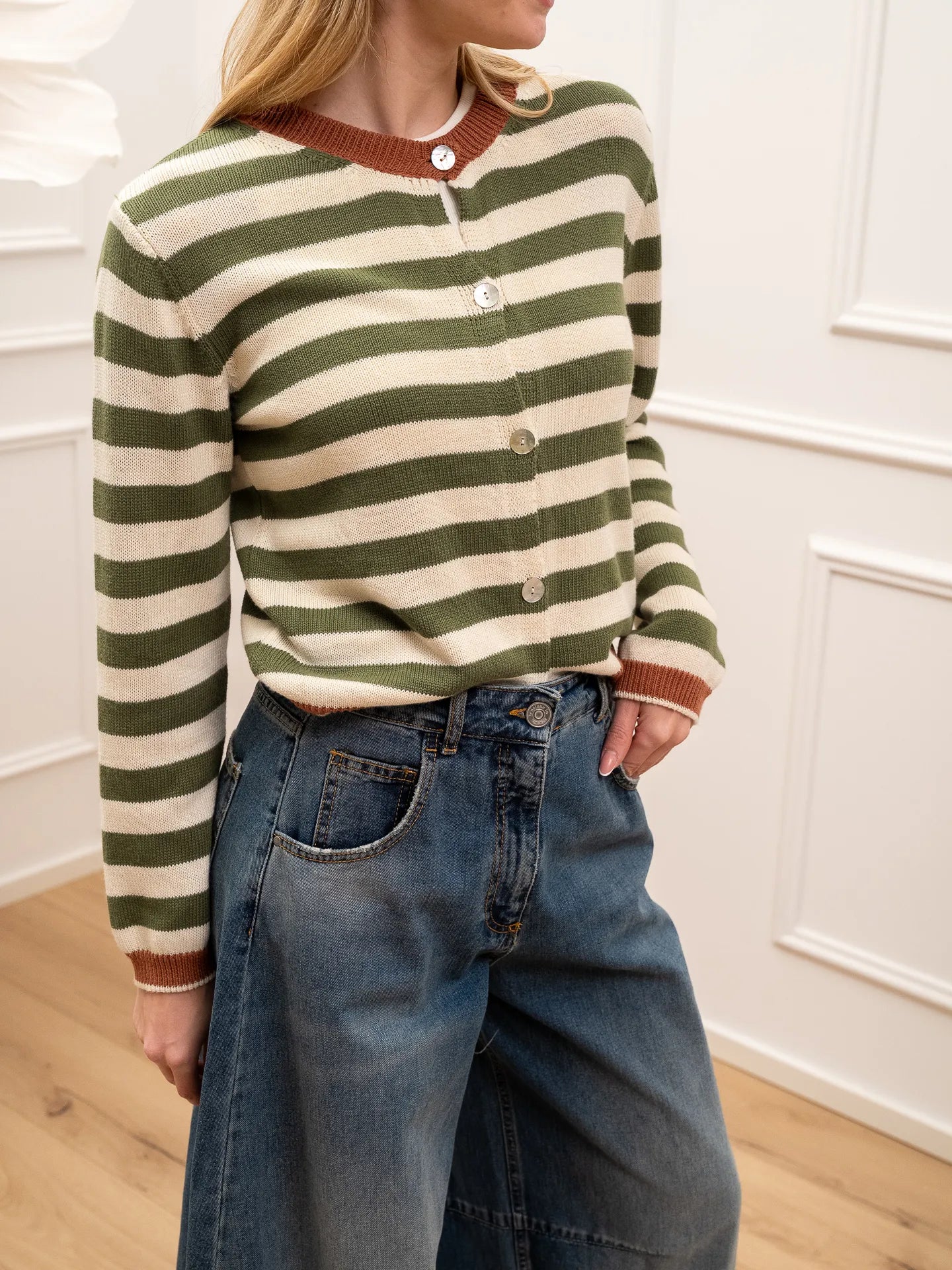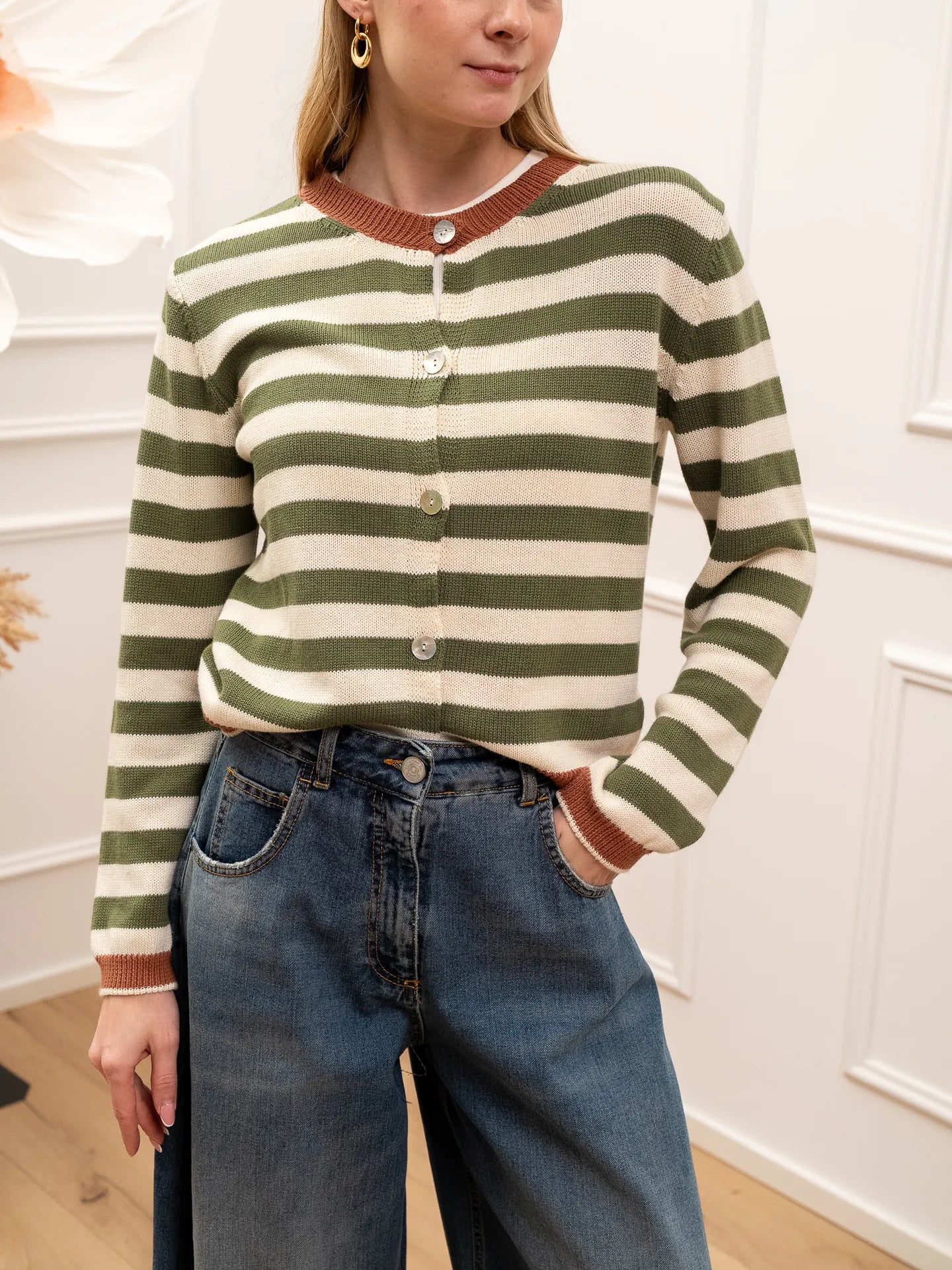 Cardigan girocollo rigato verde, burro e cuoio con bottoni - Crispy