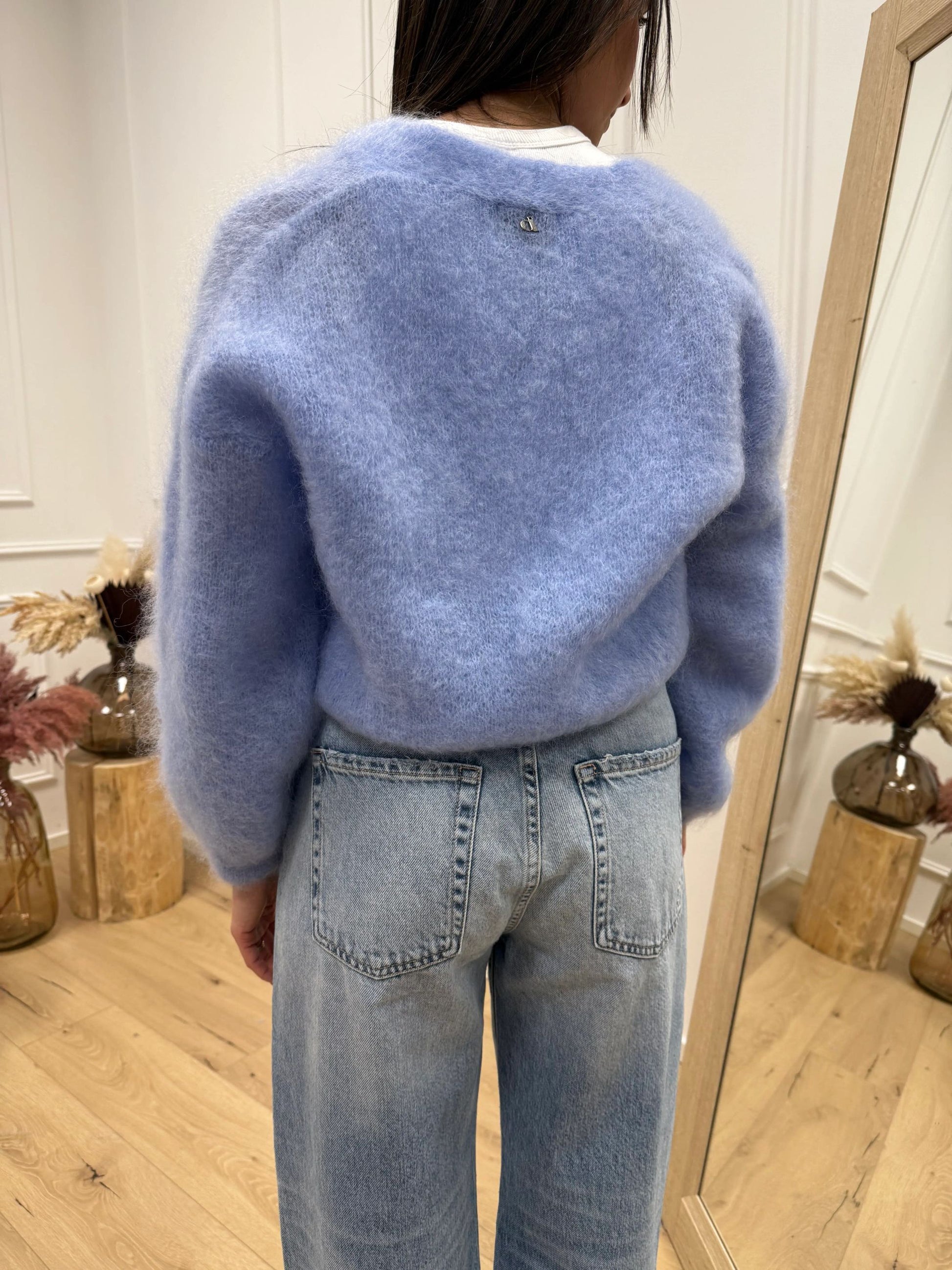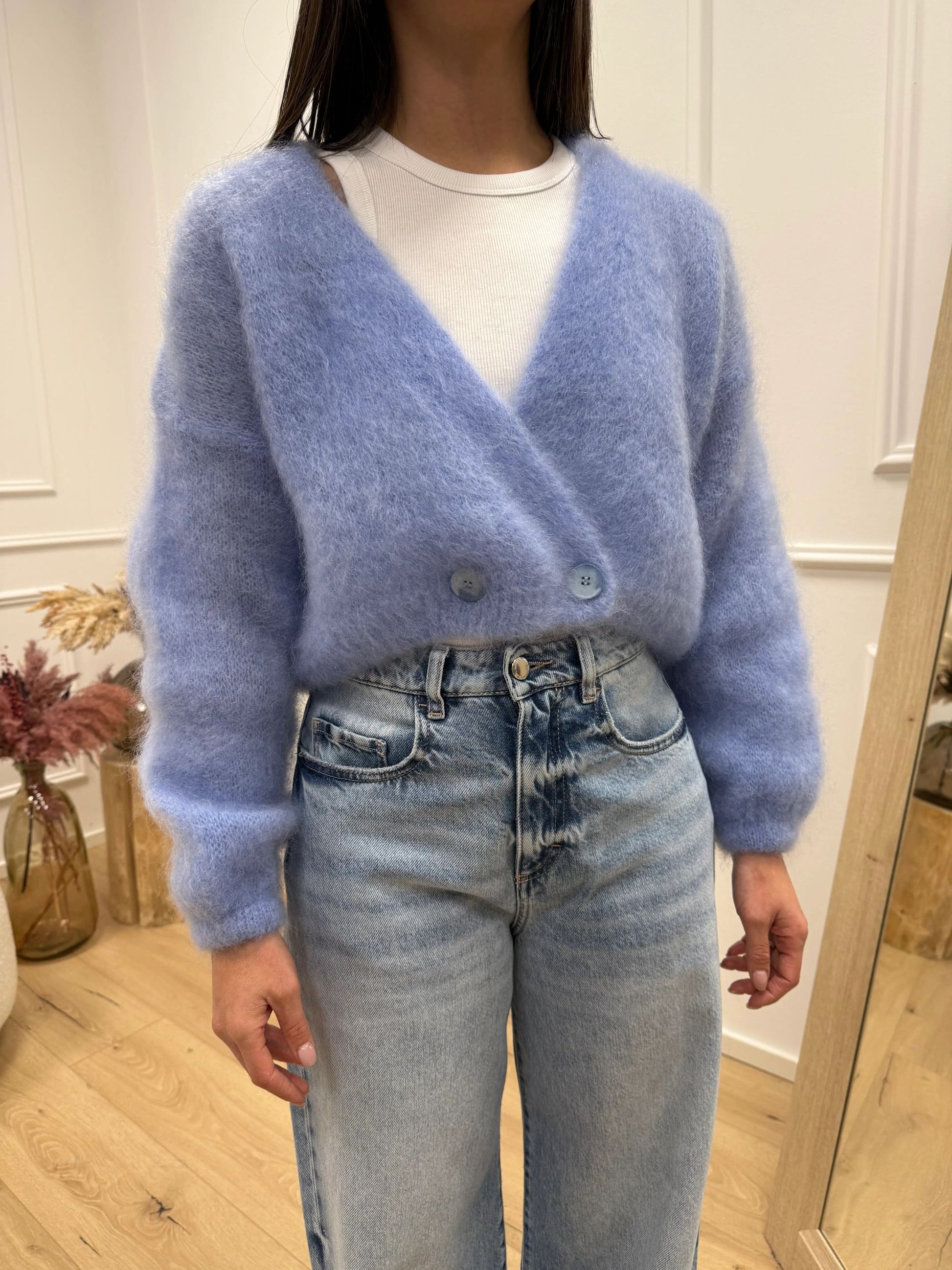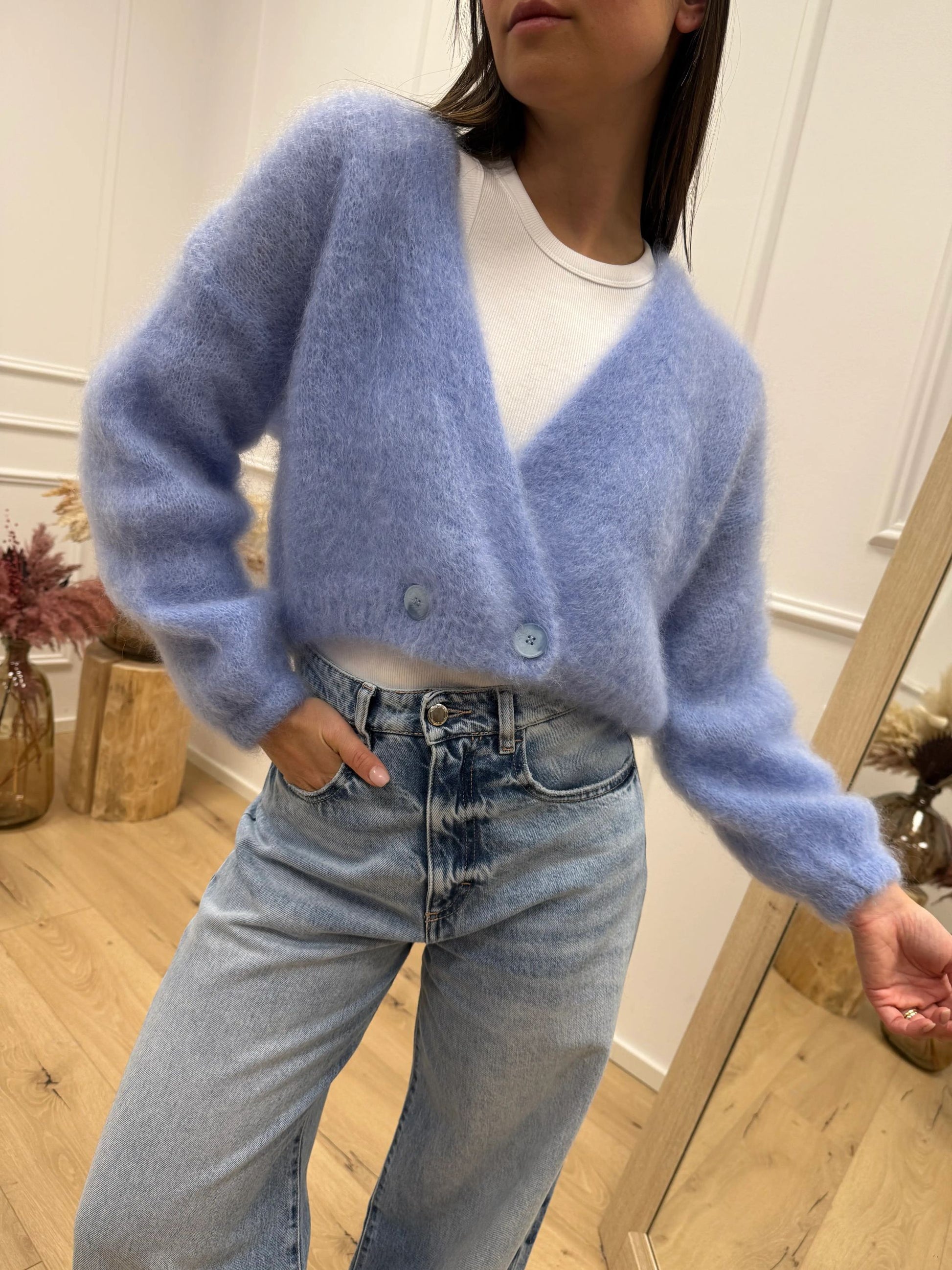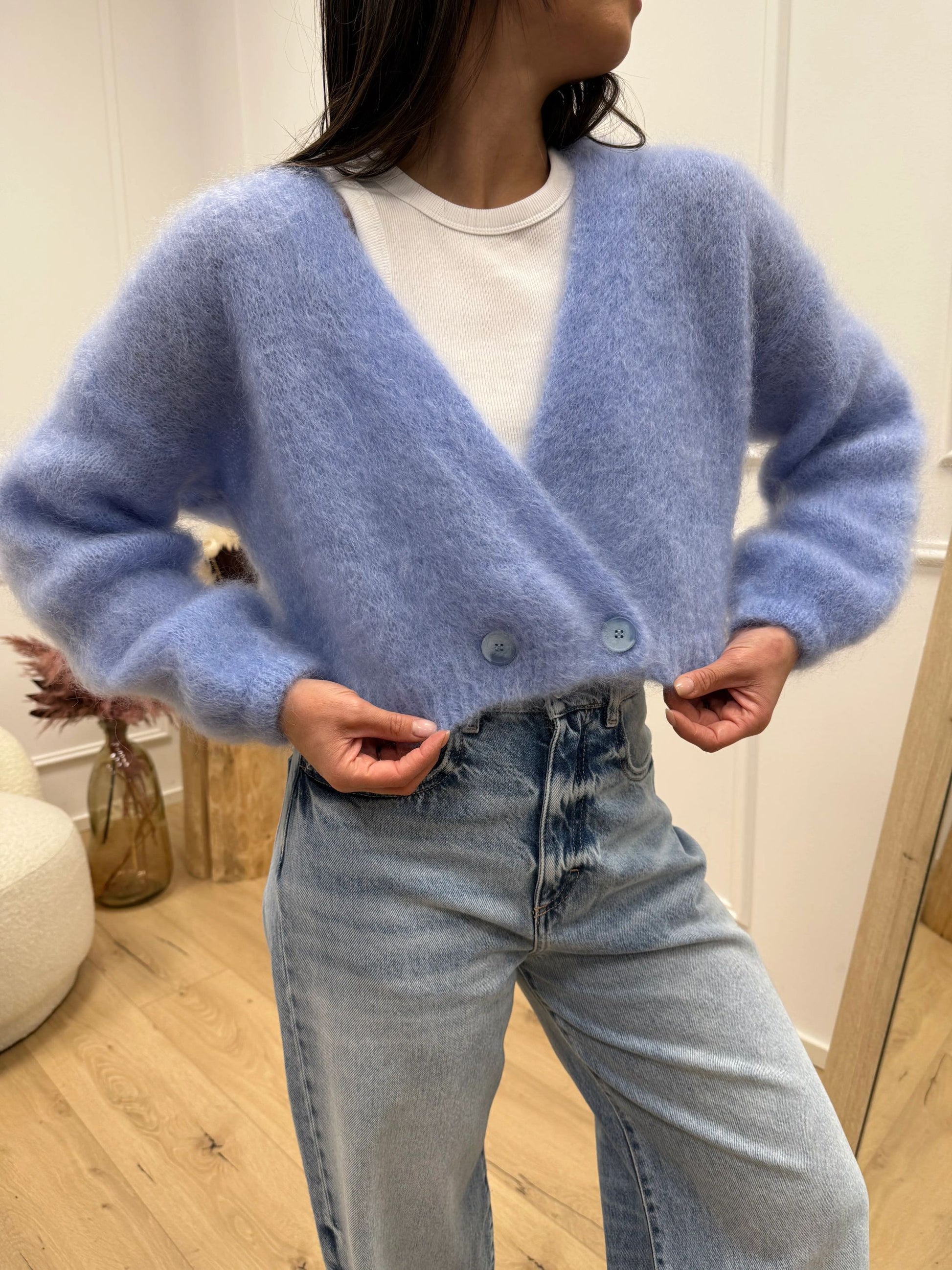Cardigan misto kid mohair color celeste Dixie. Modello fit crop effetto a palloncino, scollo a v e doppio bottone sul fondo. Manica balloon.