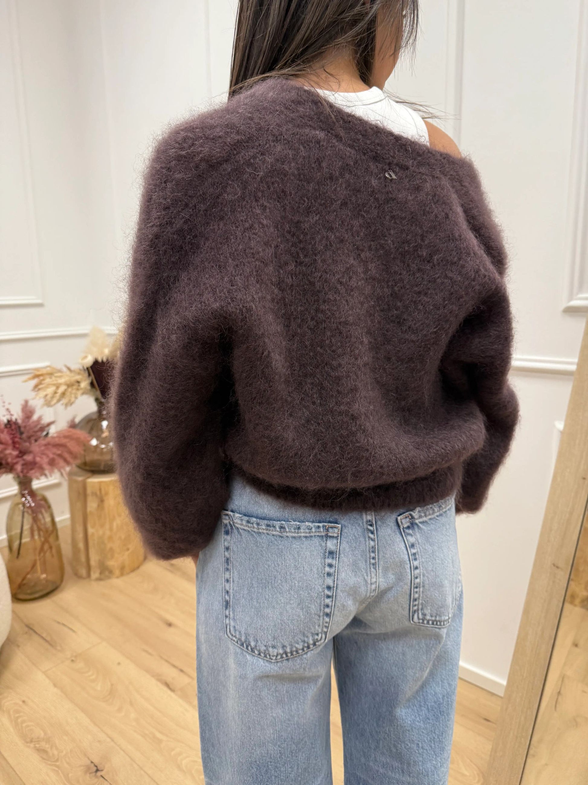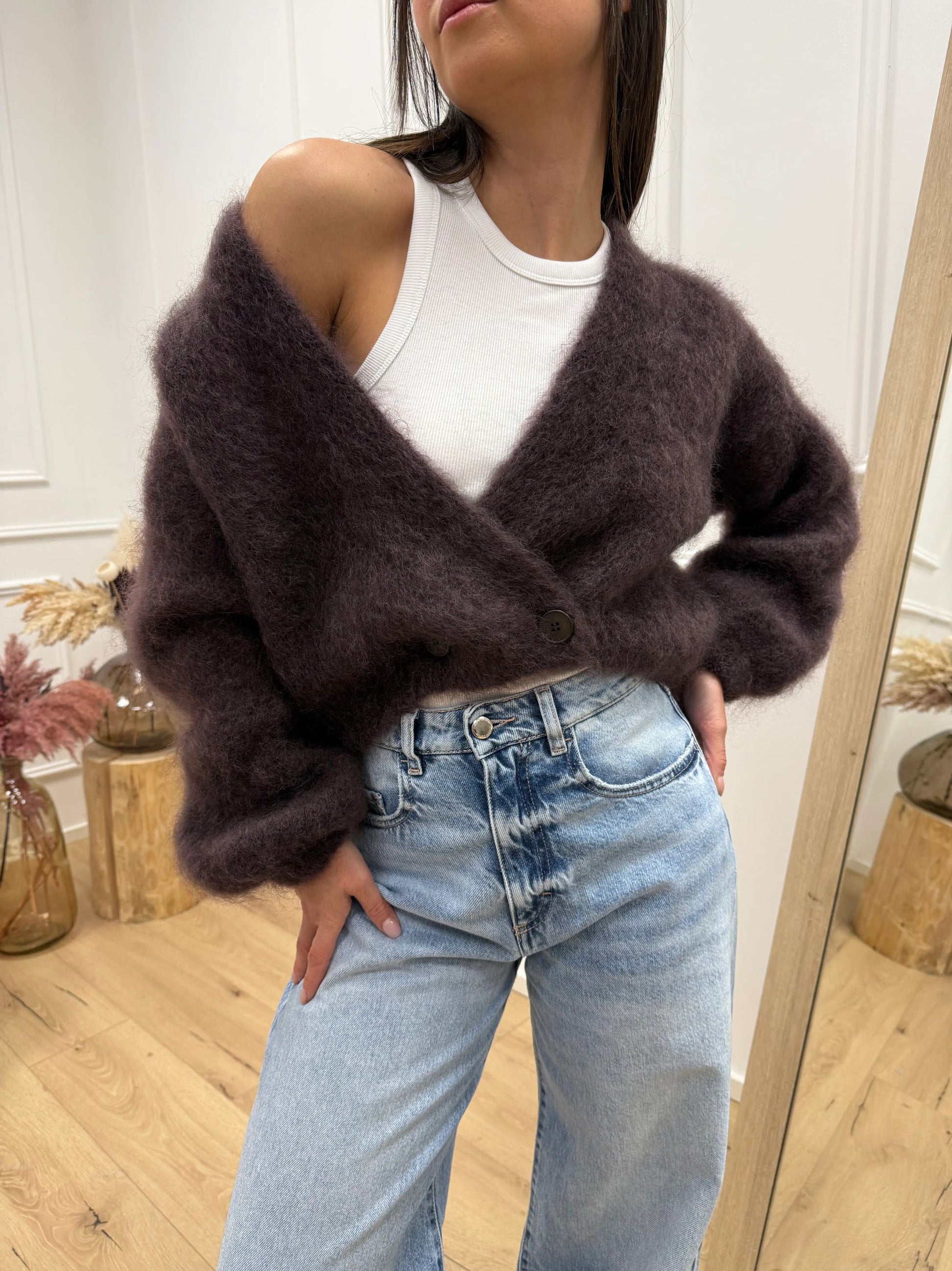 Cardigan misto kid mohair color moro Dixie. Modello fit crop effetto a palloncino, scollo a v e doppio bottone sul fondo. Manica balloon.