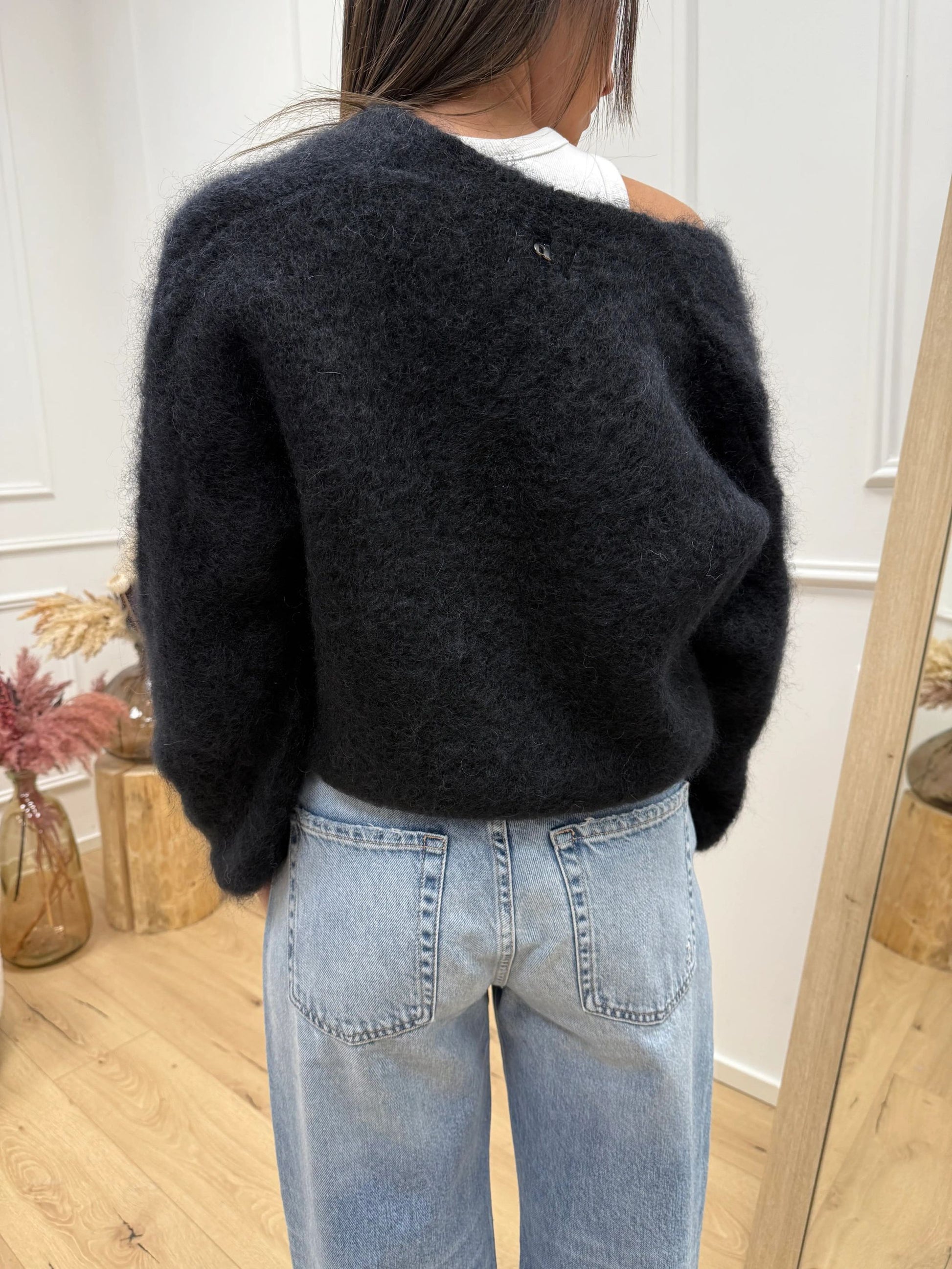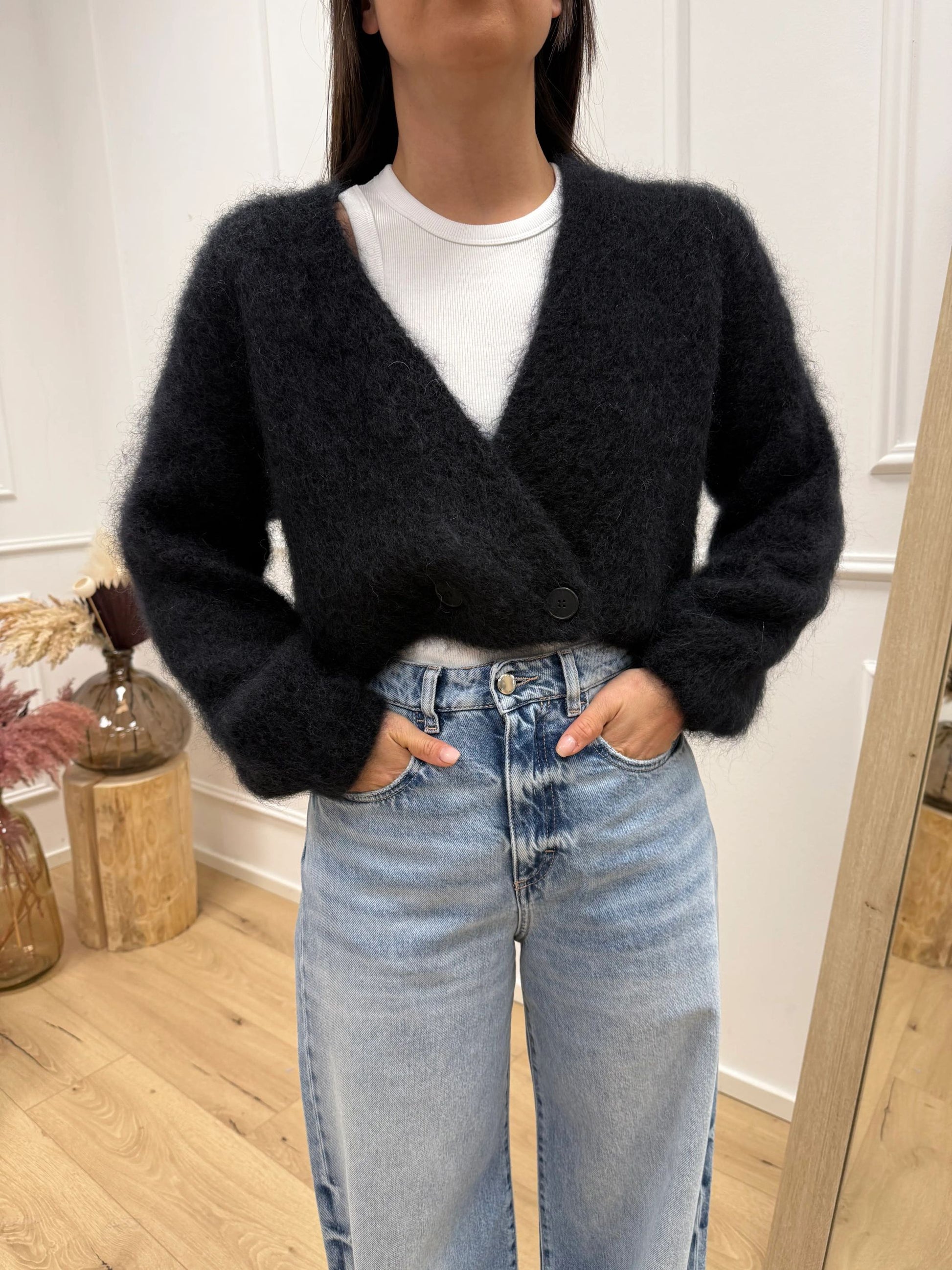 Cardigan misto kid mohair color nero Dixie. Modello fit crop effetto a palloncino, scollo a v e doppio bottone sul fondo. Manica balloon.