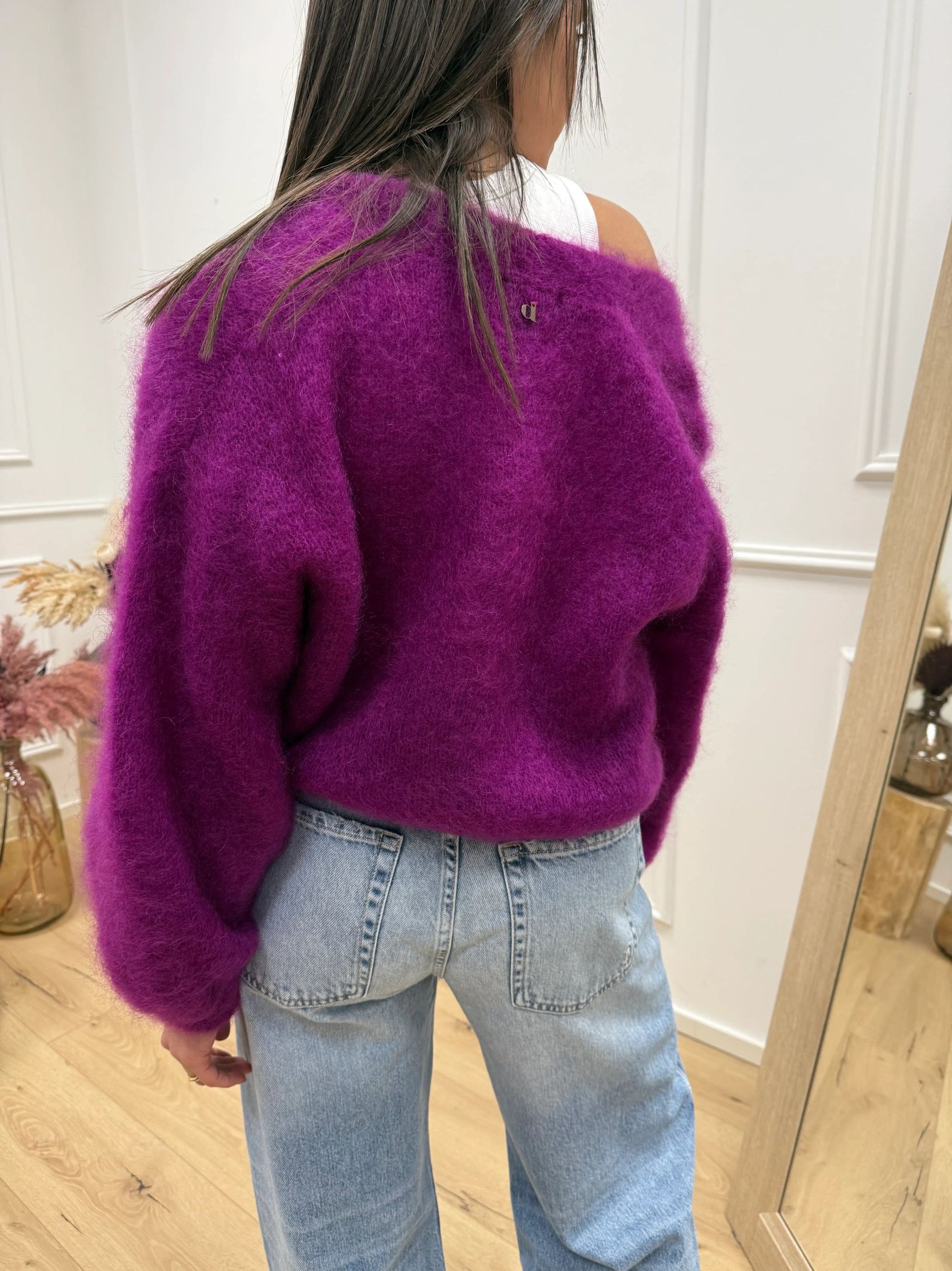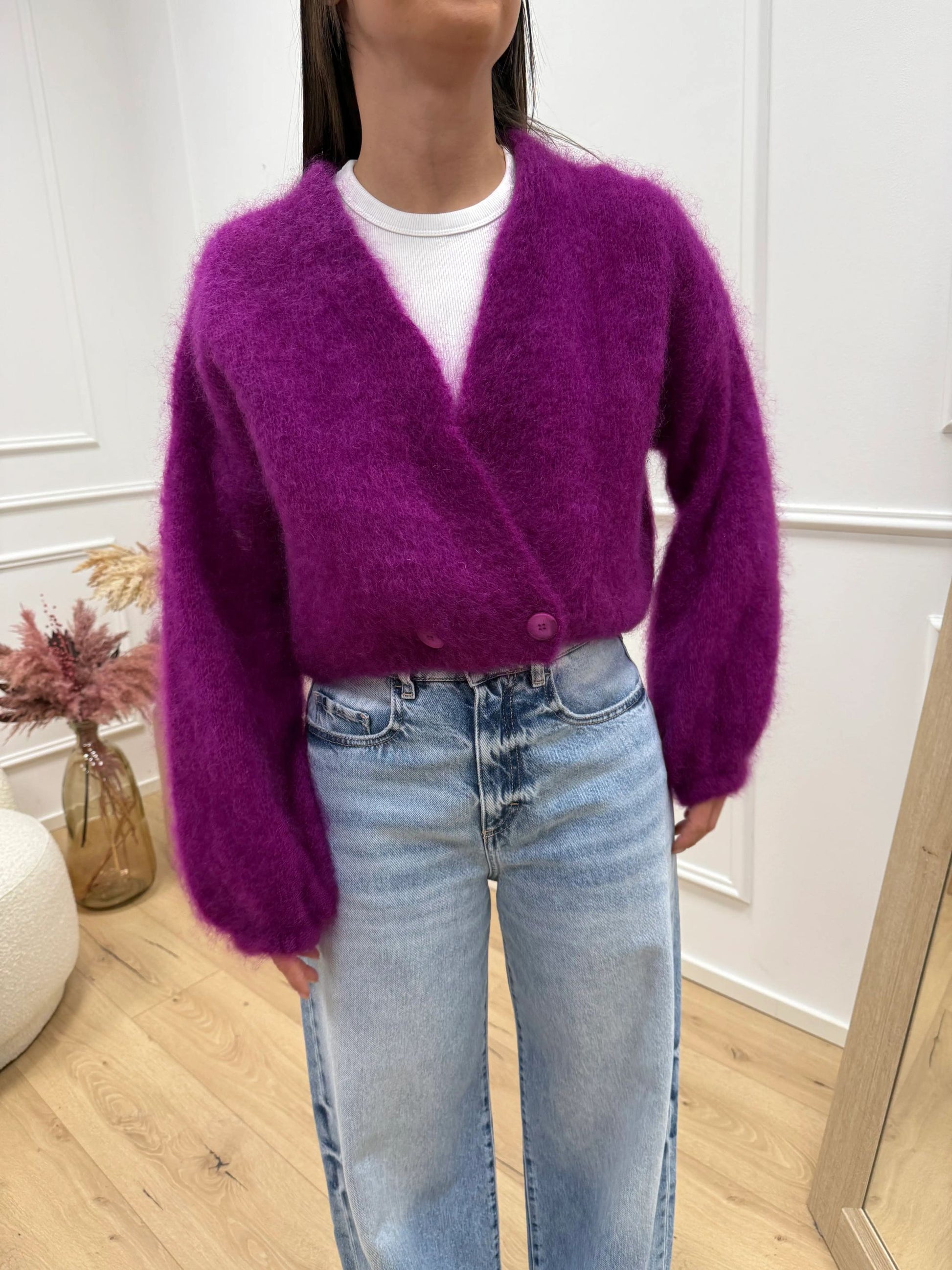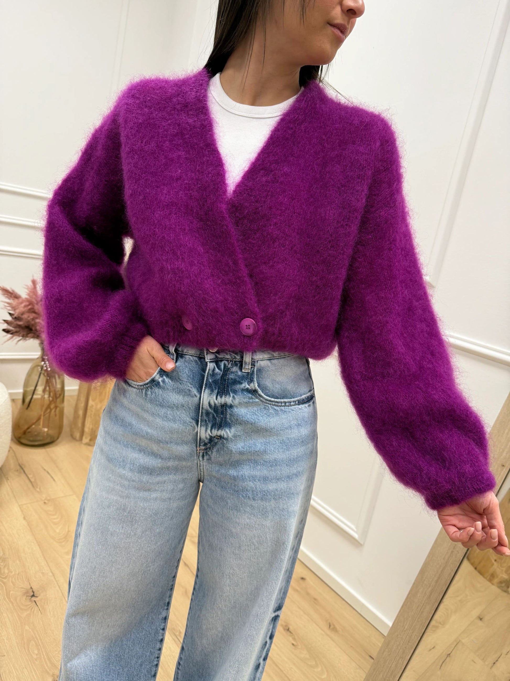 Cardigan misto kid mohair color ortensia Dixie. Modello fit crop effetto a palloncino, scollo a v e doppio bottone sul fondo. Manica balloon.