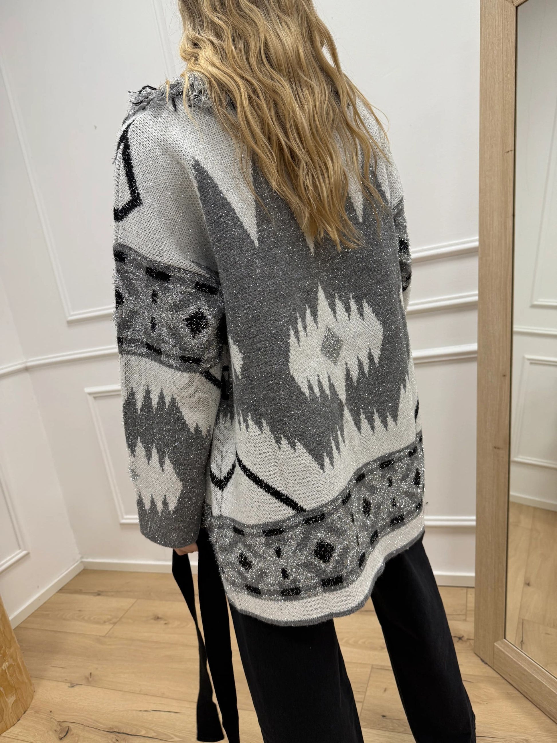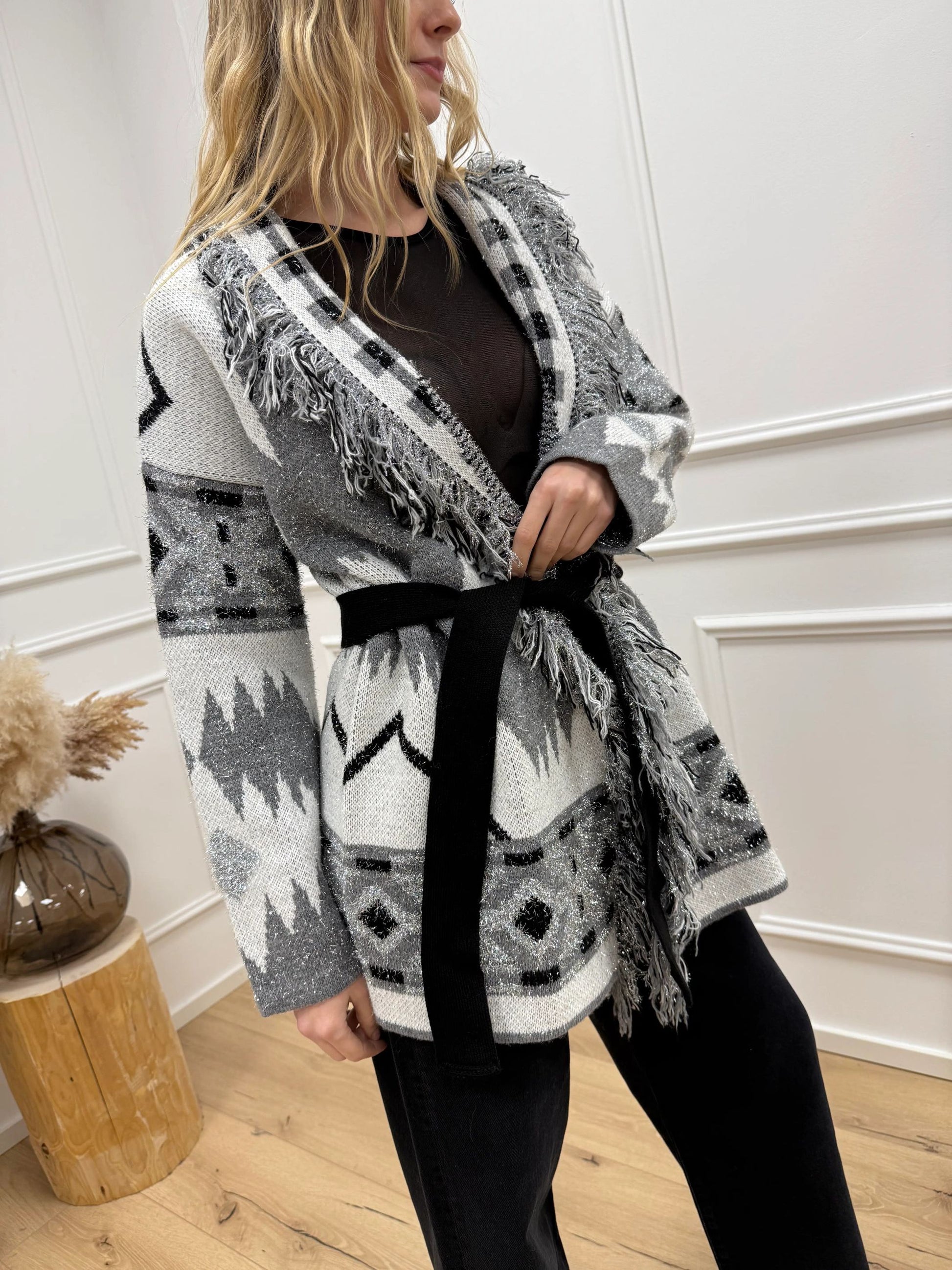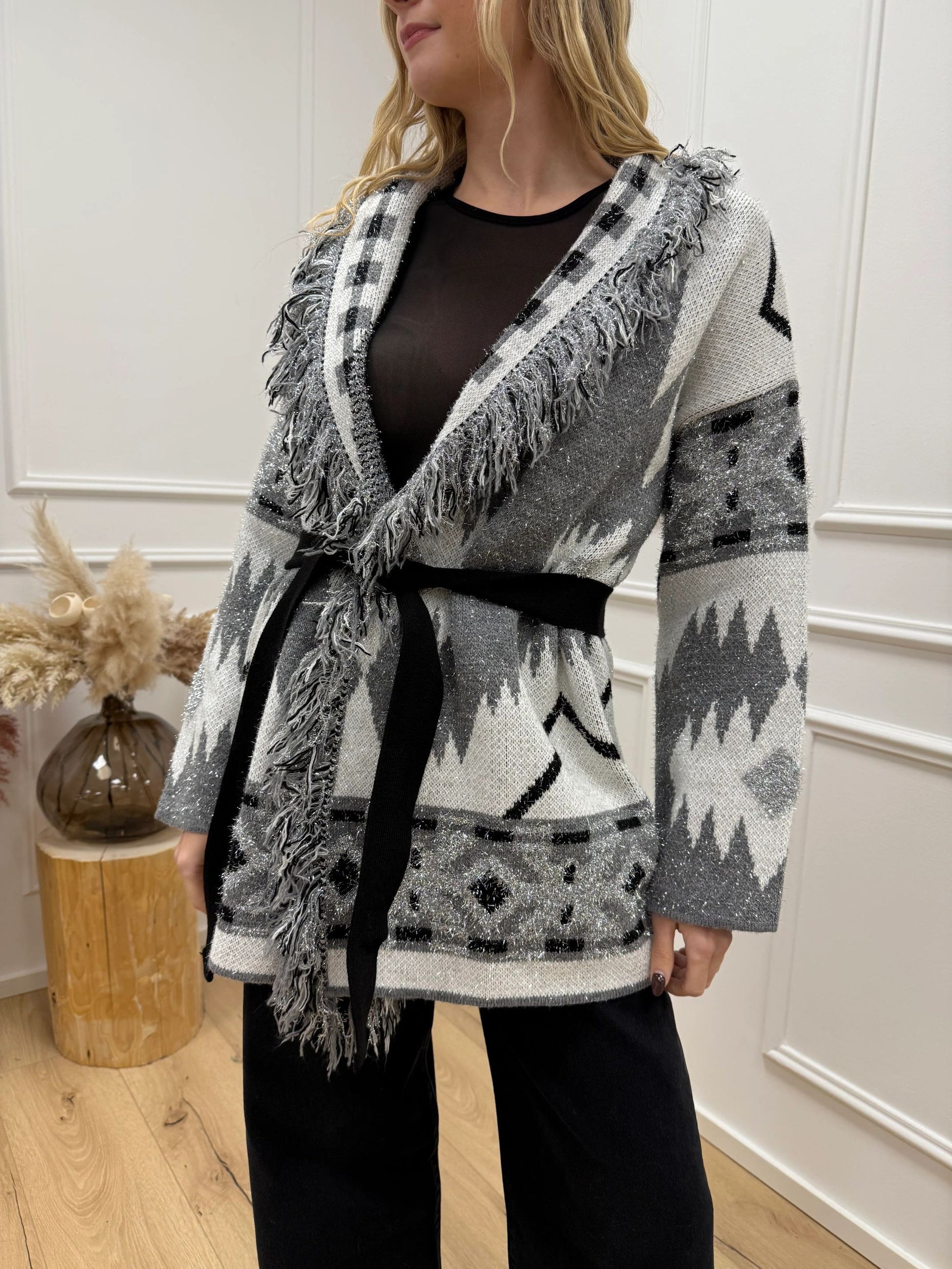 Cardigan Livigno sui toni del bianco e grigio con filo laminato Vicolo. Modello stile alanui fit over con bordi sfrangiati e cintura da annodare in vita.