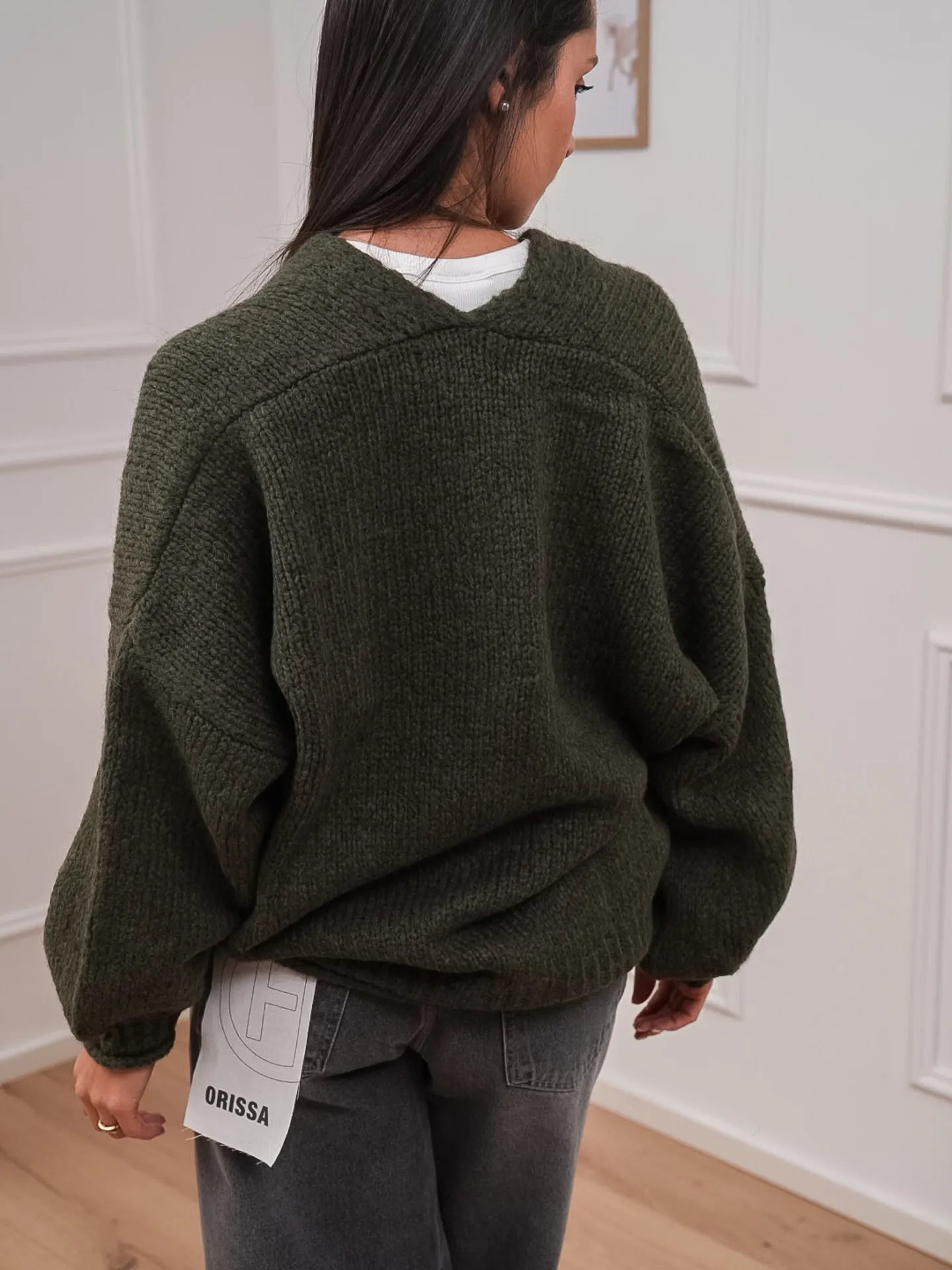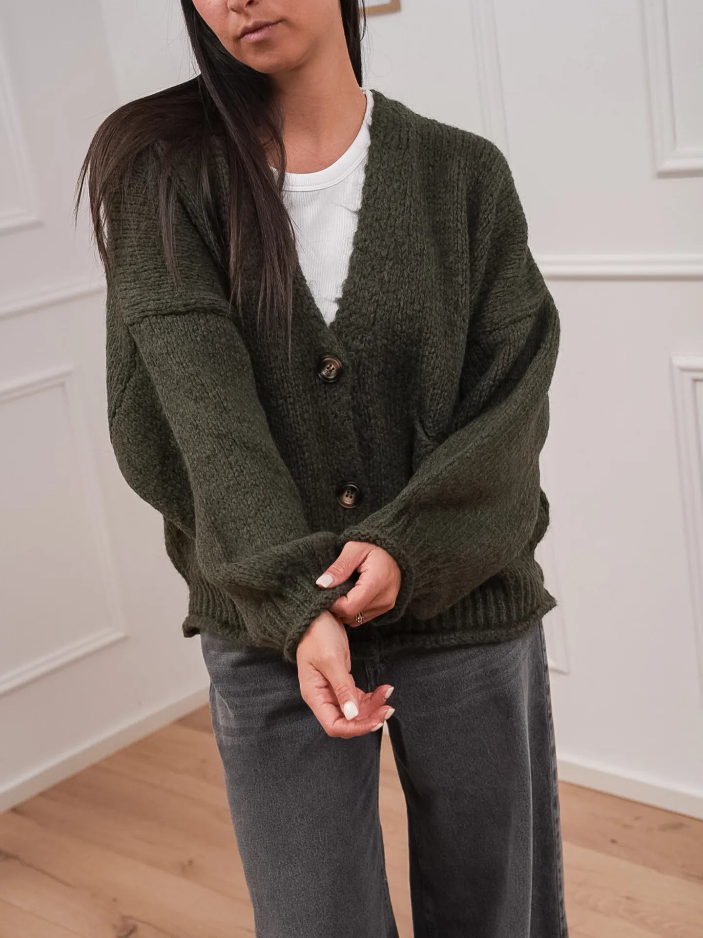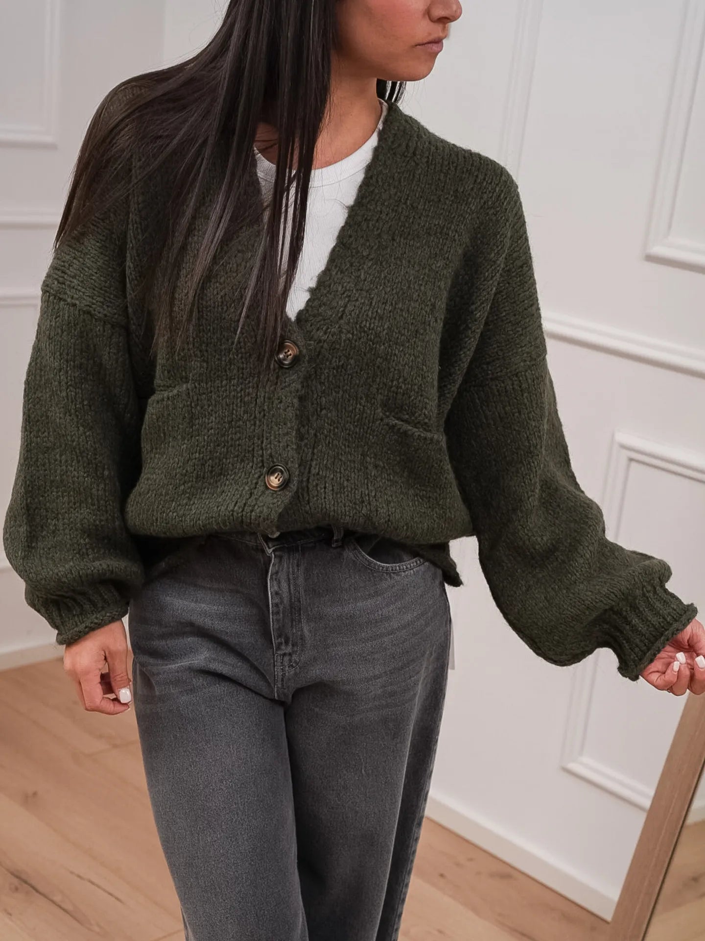 Cardigan color militare HaveOne. Modello fit morbido con scollo a v e chiusura frontale a tre bottoni e dettaglio di taschine. Manica lunga a palloncino con spalla scesa e ricciolo sul polso.