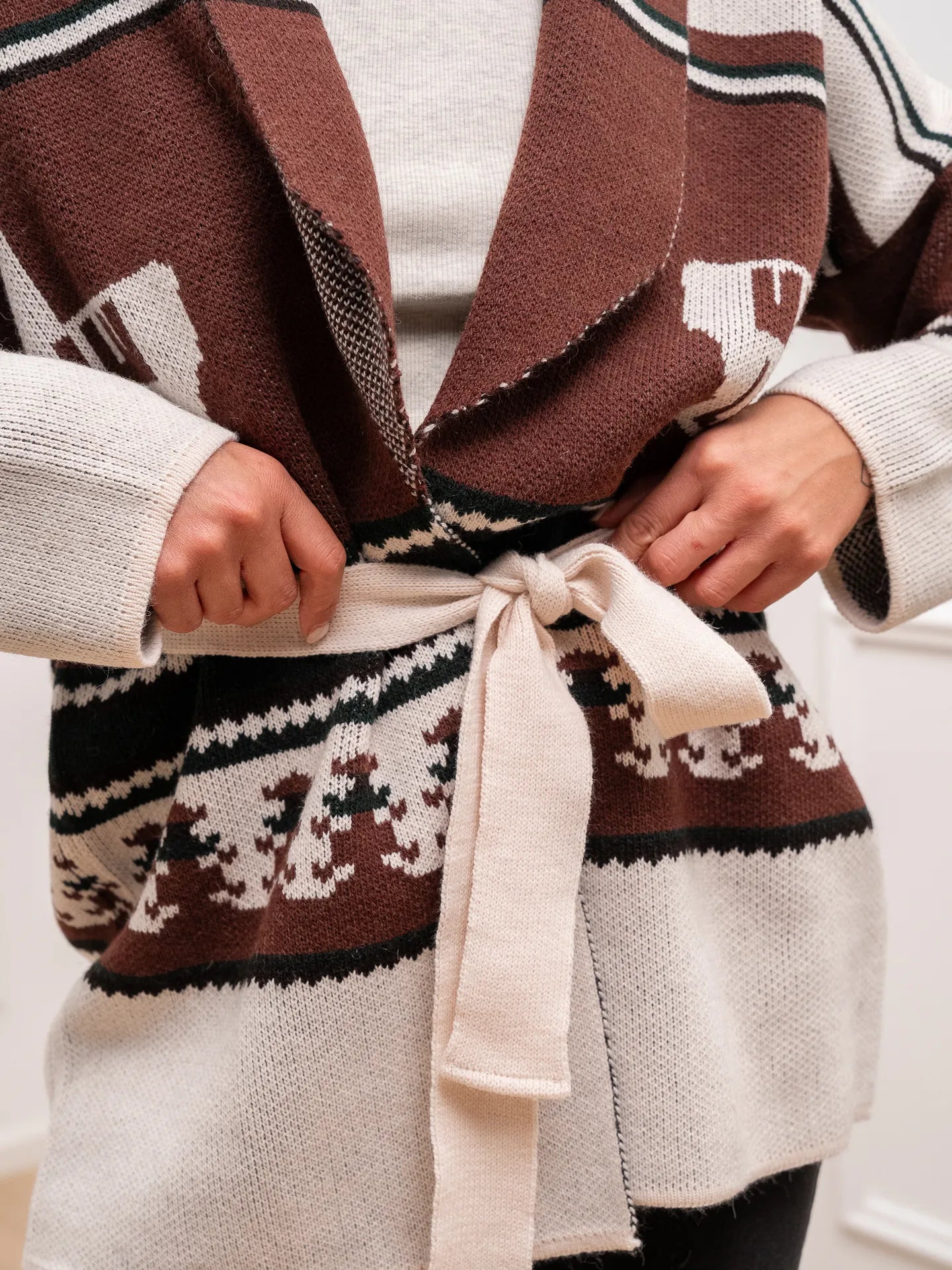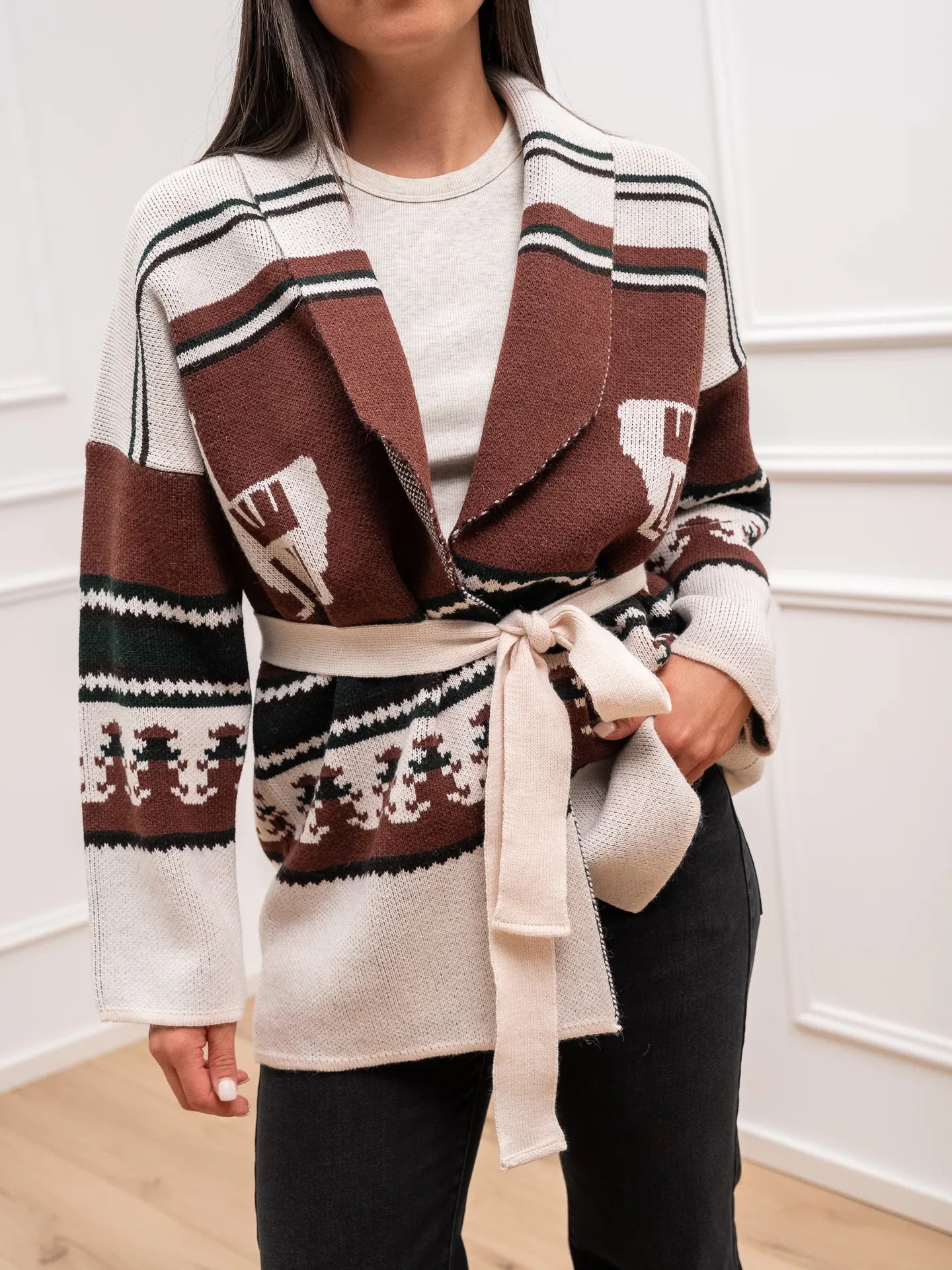 Cardigan Montana burro, bosco, gianduia Vicolo. Modello fit oversize con collo sciallato e cinturina in vita da annodare.