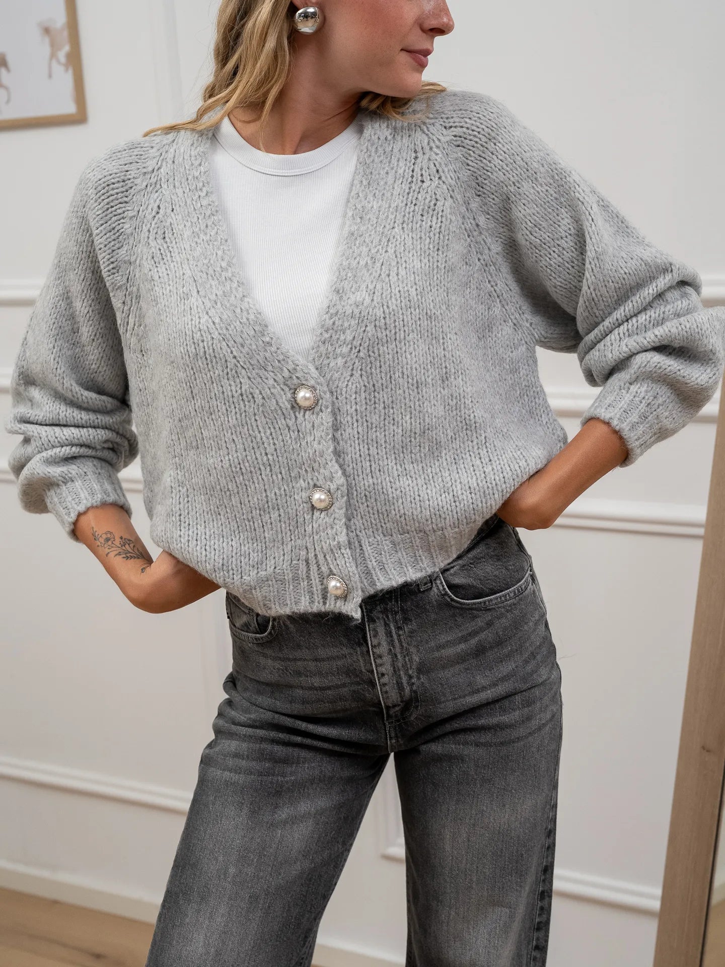 Cardigan color perla HaveOne. Modello fit corto regolare con scollo a v e chiusura frontale con tre bottoni gioiello. Maniche lunghe con polsino sul fondo.