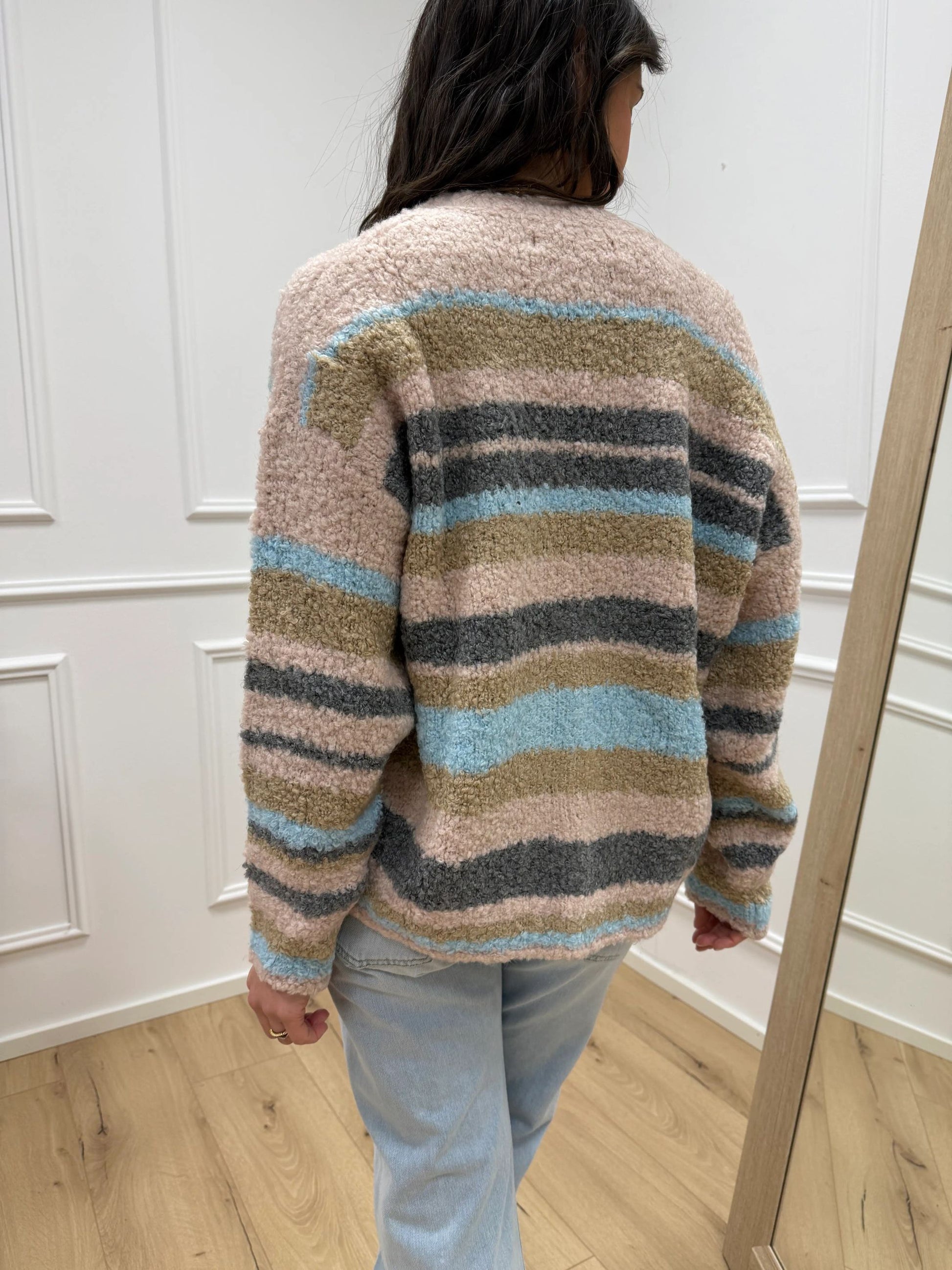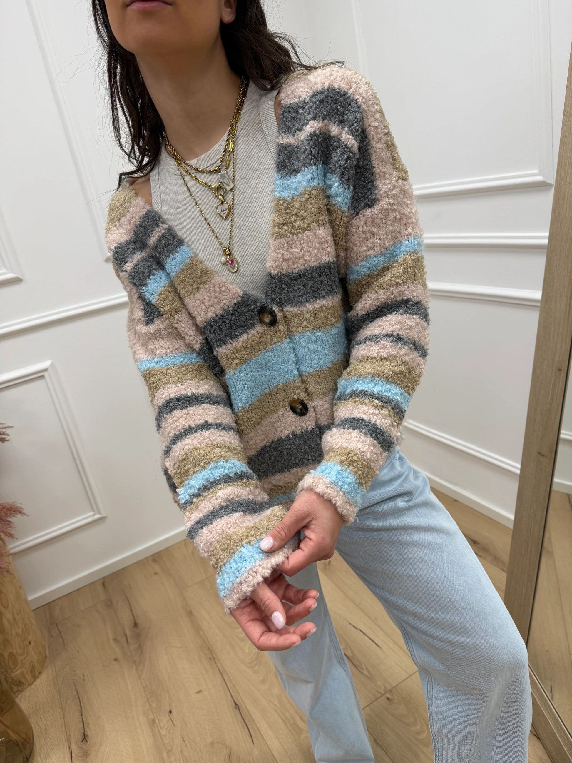 Cardigan rigato cipria HaveOne. Modello fit morbido con scollo a v e chiusura frontale a tre bottoni.