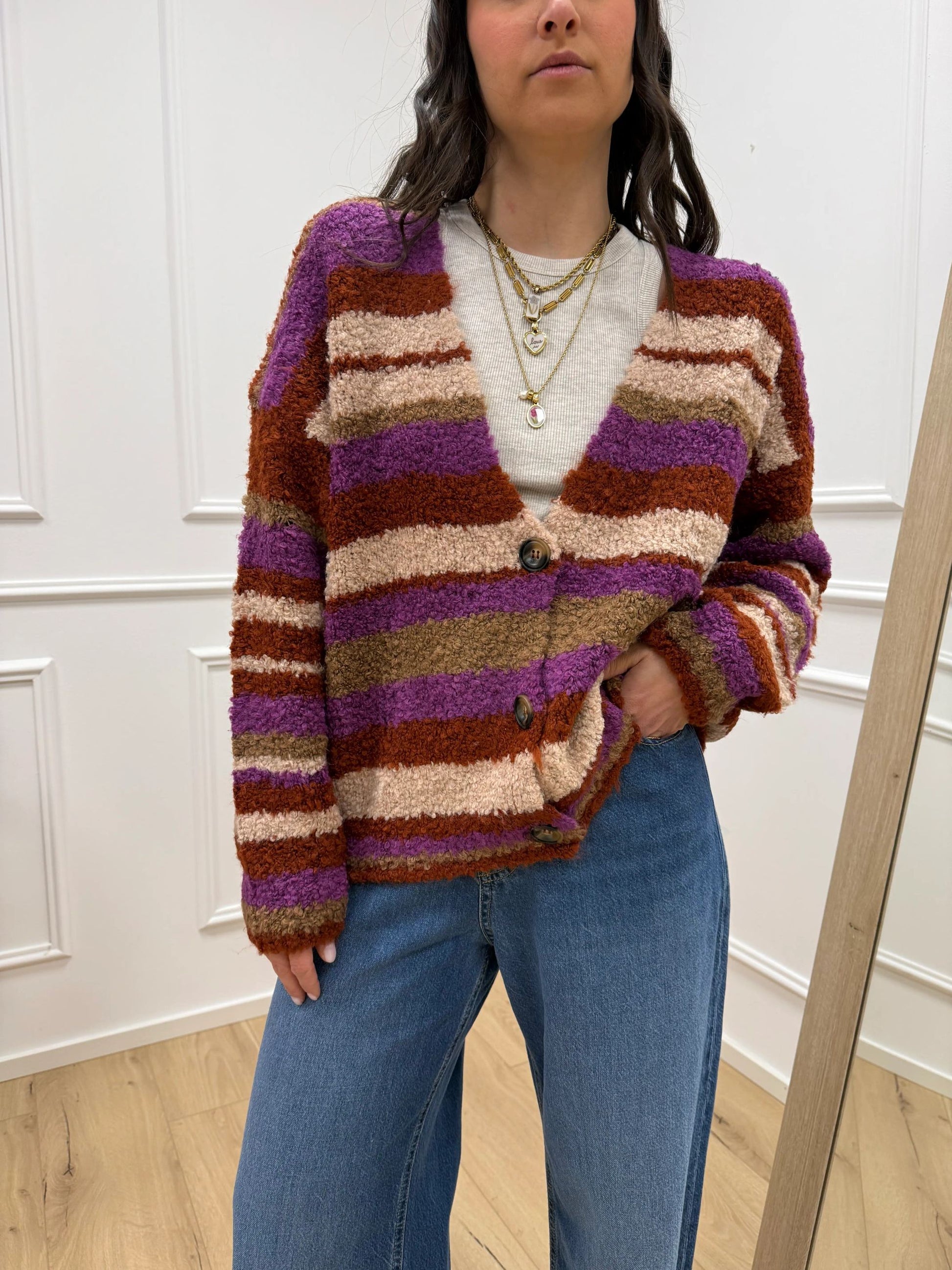 Cardigan rigato ruggine HaveOne. Modello fit morbido con scollo a v e chiusura frontale a tre bottoni.