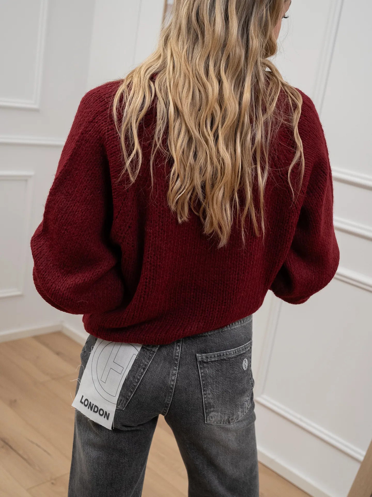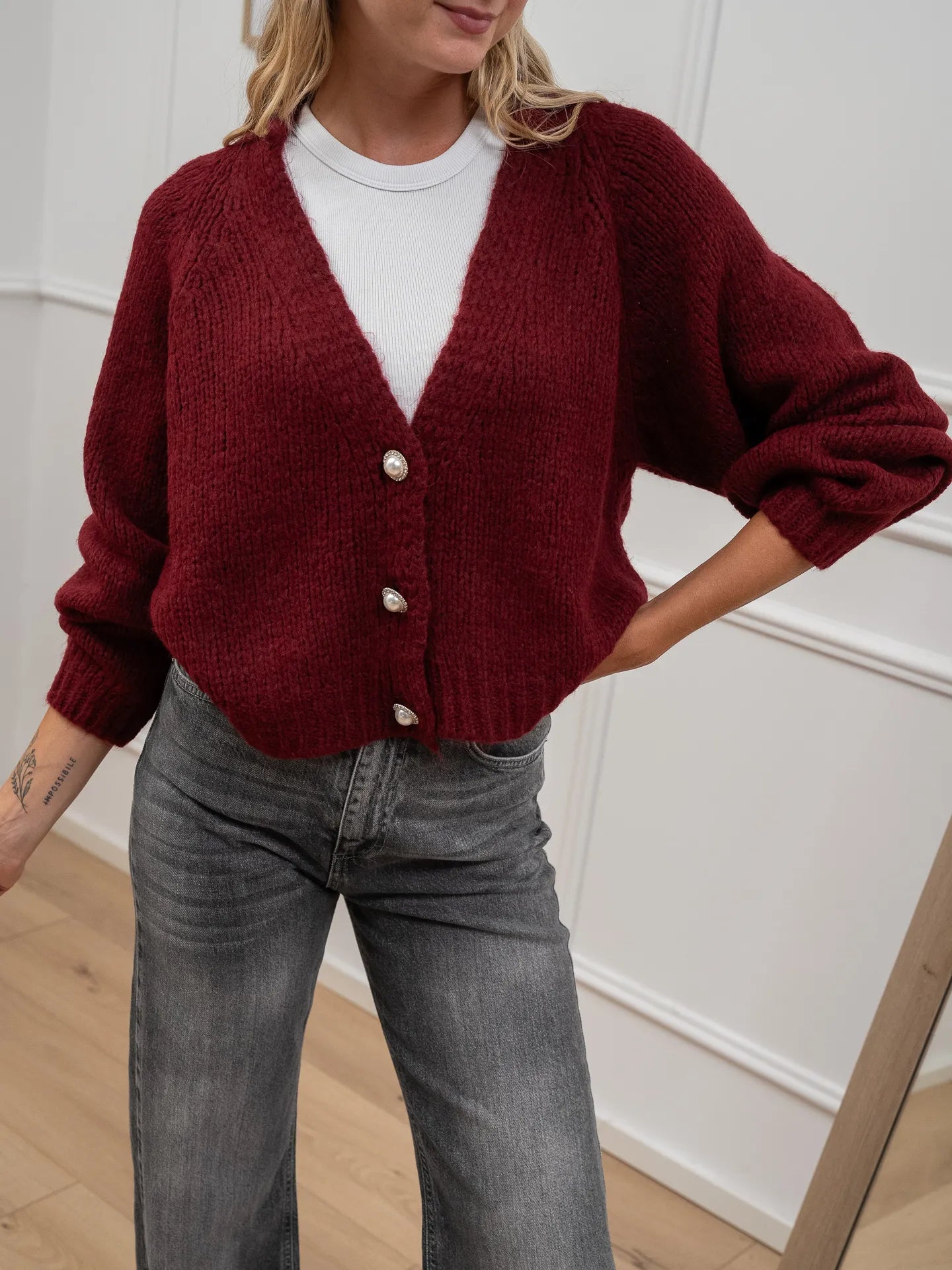 Cardigan color vino HaveOne. Modello fit corto regolare con scollo a v e chiusura frontale con tre bottoni gioiello. Maniche lunghe con polsino sul fondo.