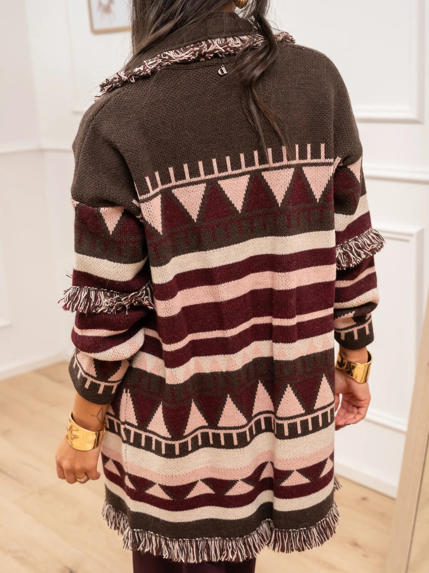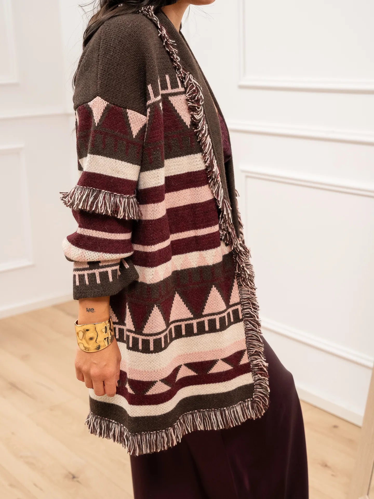 Cardigan Zurigo alanui moro, rosa, bordeaux Dixie. Modello fit morbido con dettagli sfrangiati, Cinturina da annodare in vita.