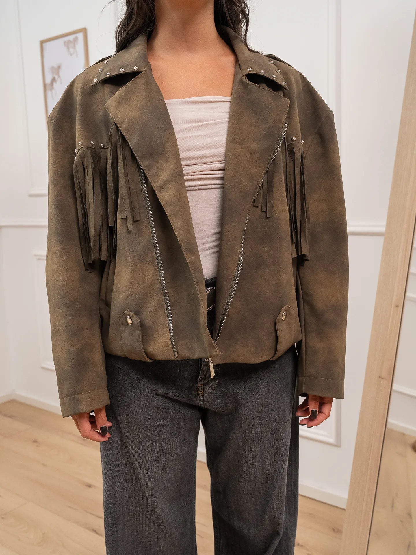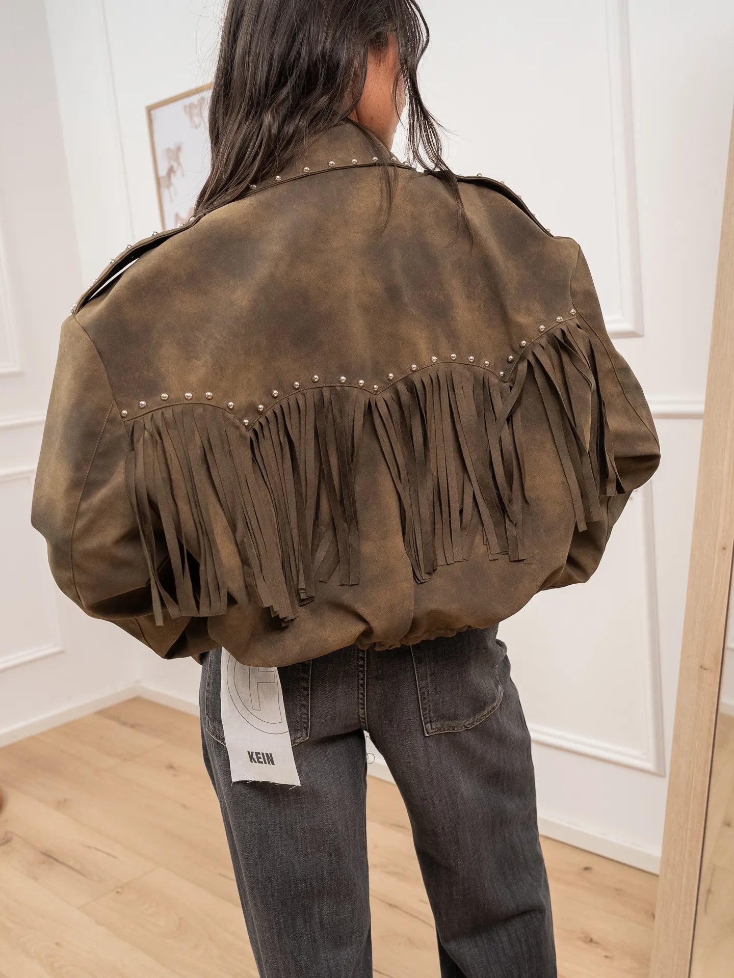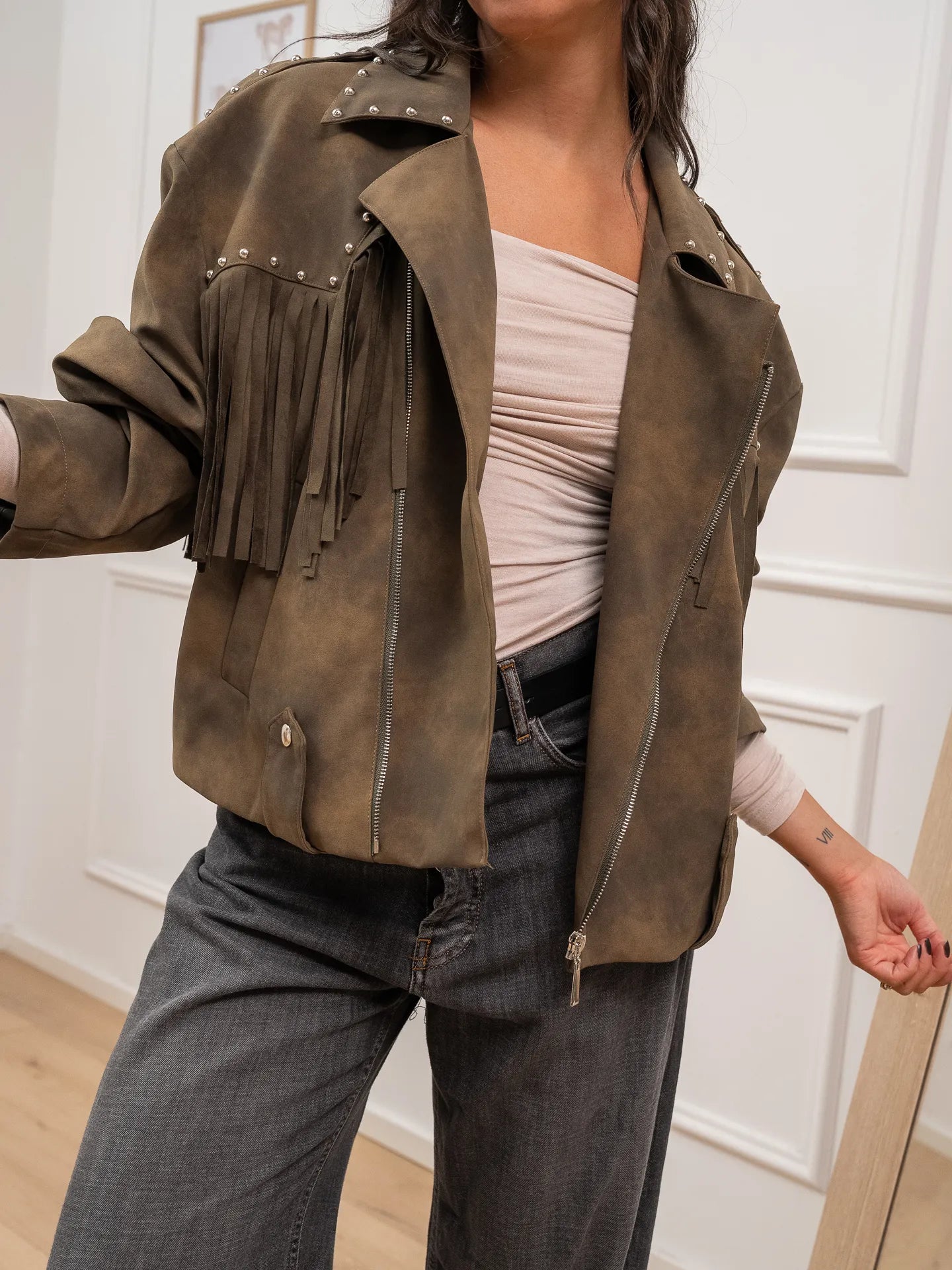 Chiodo scamosciato color verde militare HaveOne. Modello fit regolare con chiusura zip frontale. Dettaglio di borchie argento e frange.