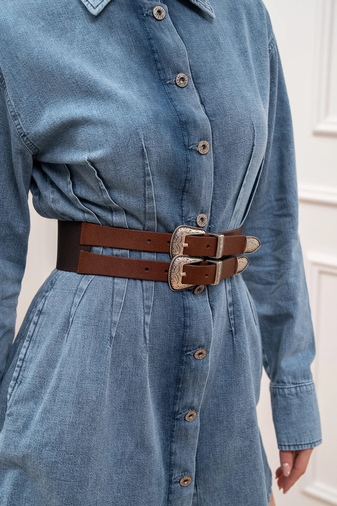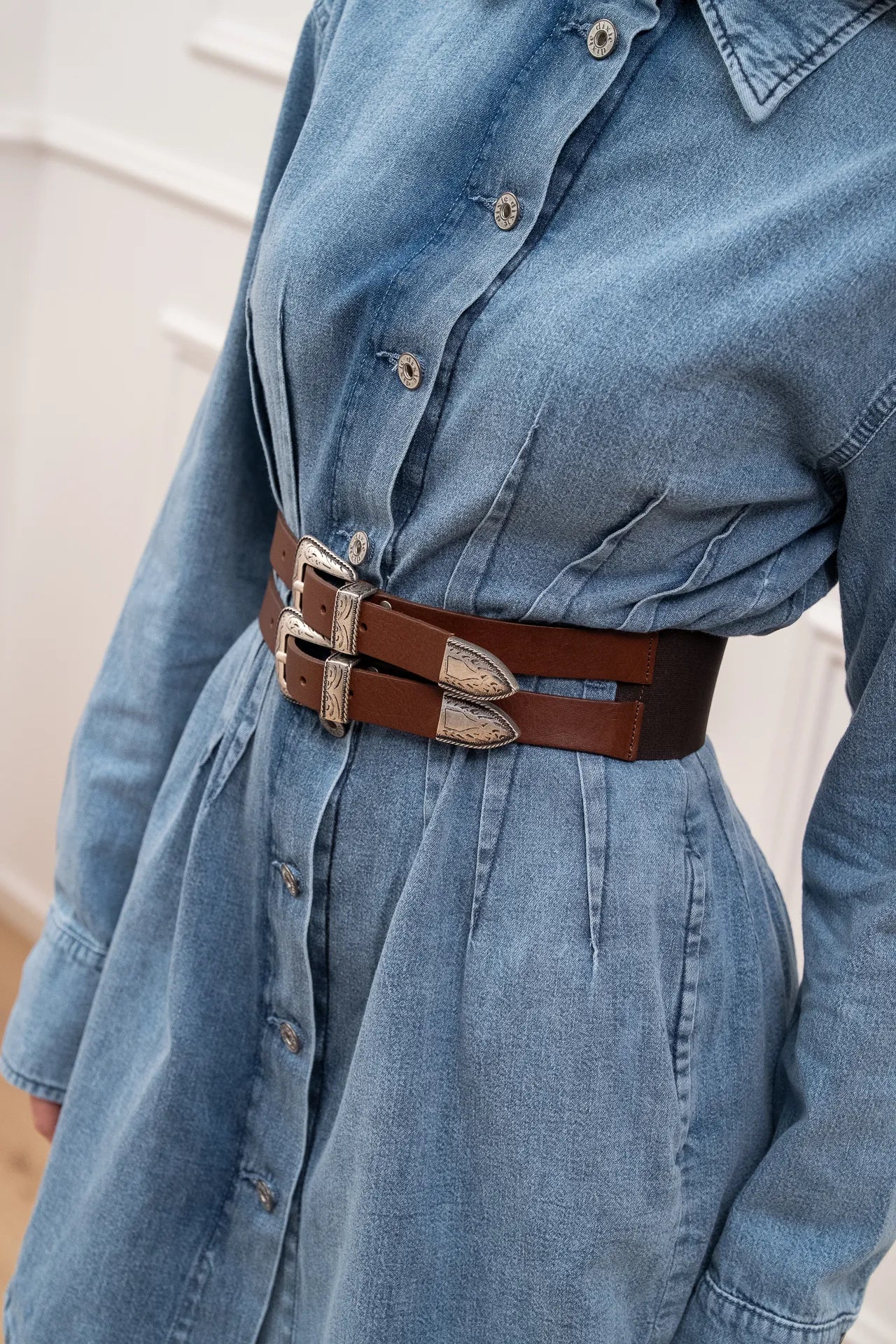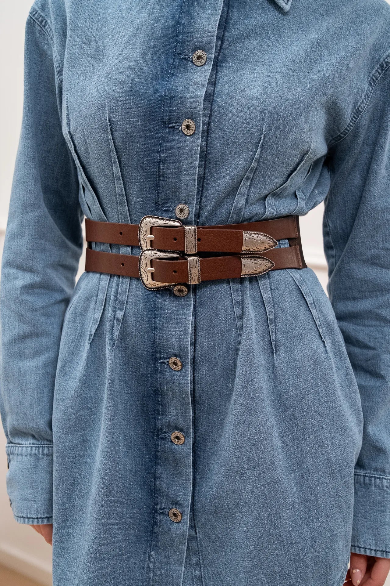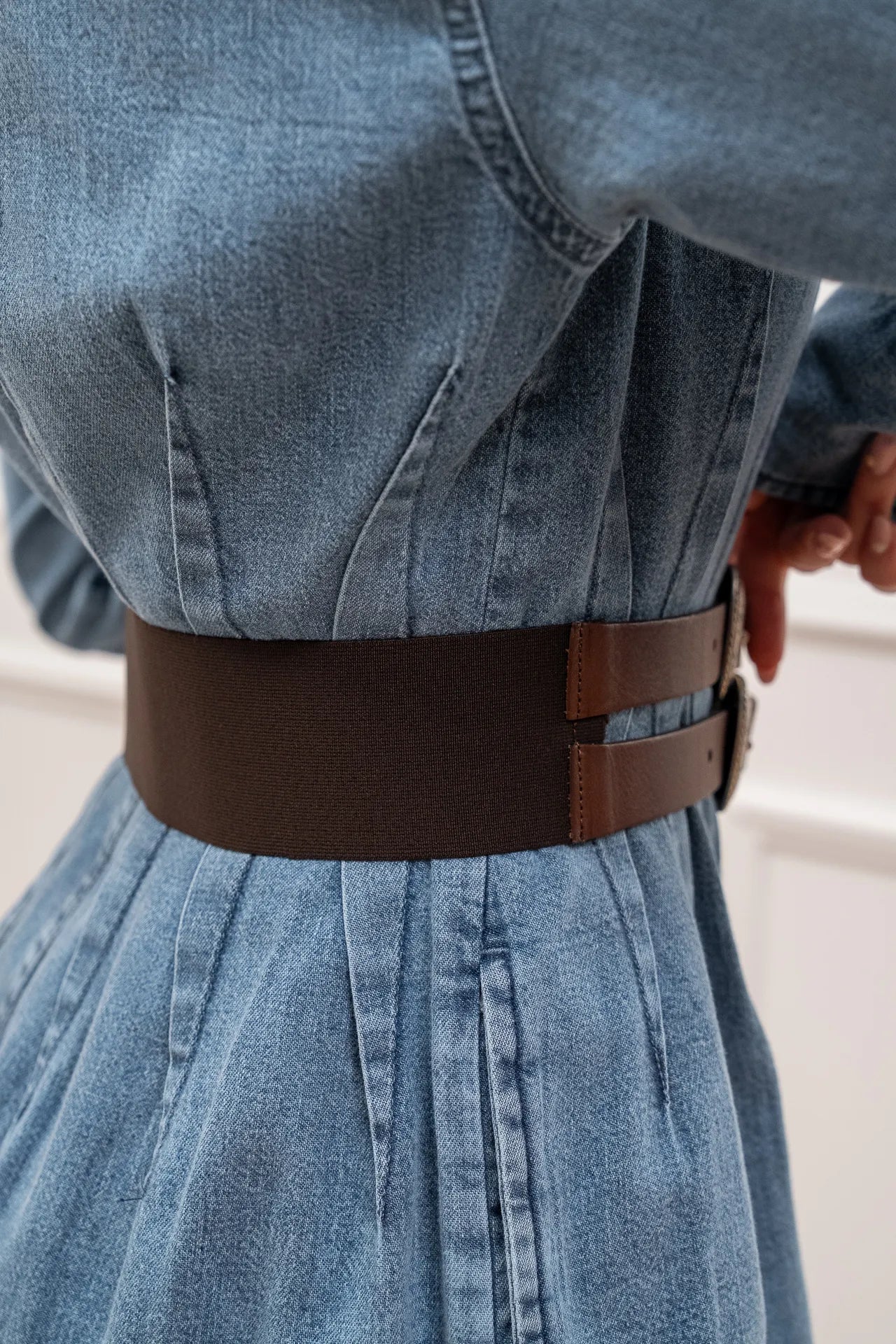 Cintura doppia color moro Philia Loft. Modello doppio con fibbia regolabile e banda elastica sul retro.