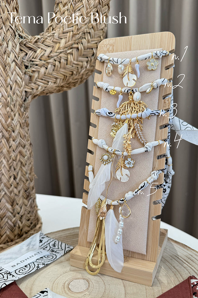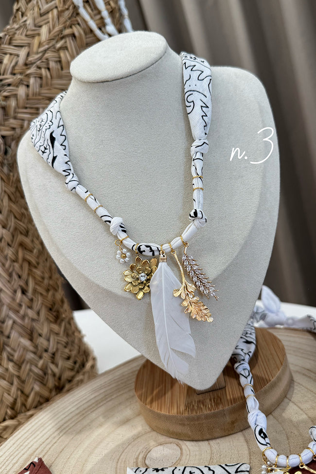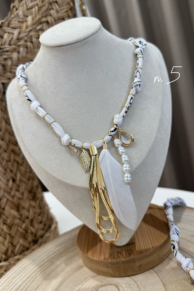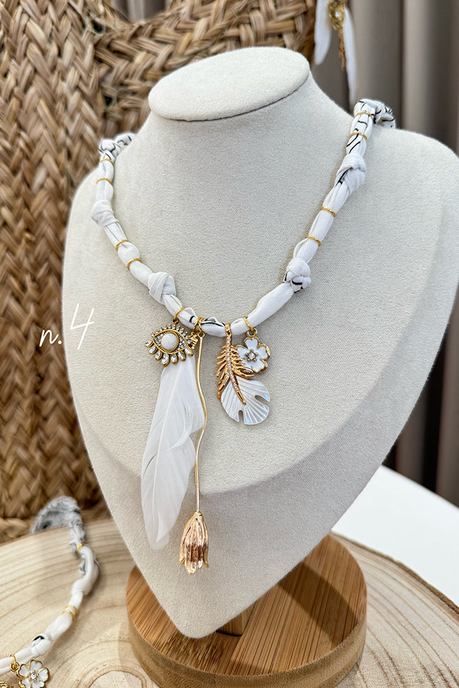 Collana in cotone color bianco Badhnati. Sono 5 modelli con ognuno i suoi talismani. Da portare attorno al collo, al polso o alla caviglia.