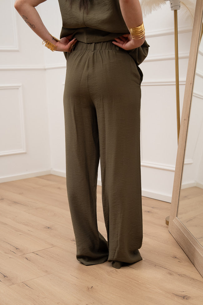 Completo in misto viscosa e lino color verde militare Dixie. Modello con capospalla gilet fit oversize, scollo a v profondo e chiusura monopetto. Pantaloni a gamba dritta vita alta con passati e molla sul retro. Chiusura bottone e zip.