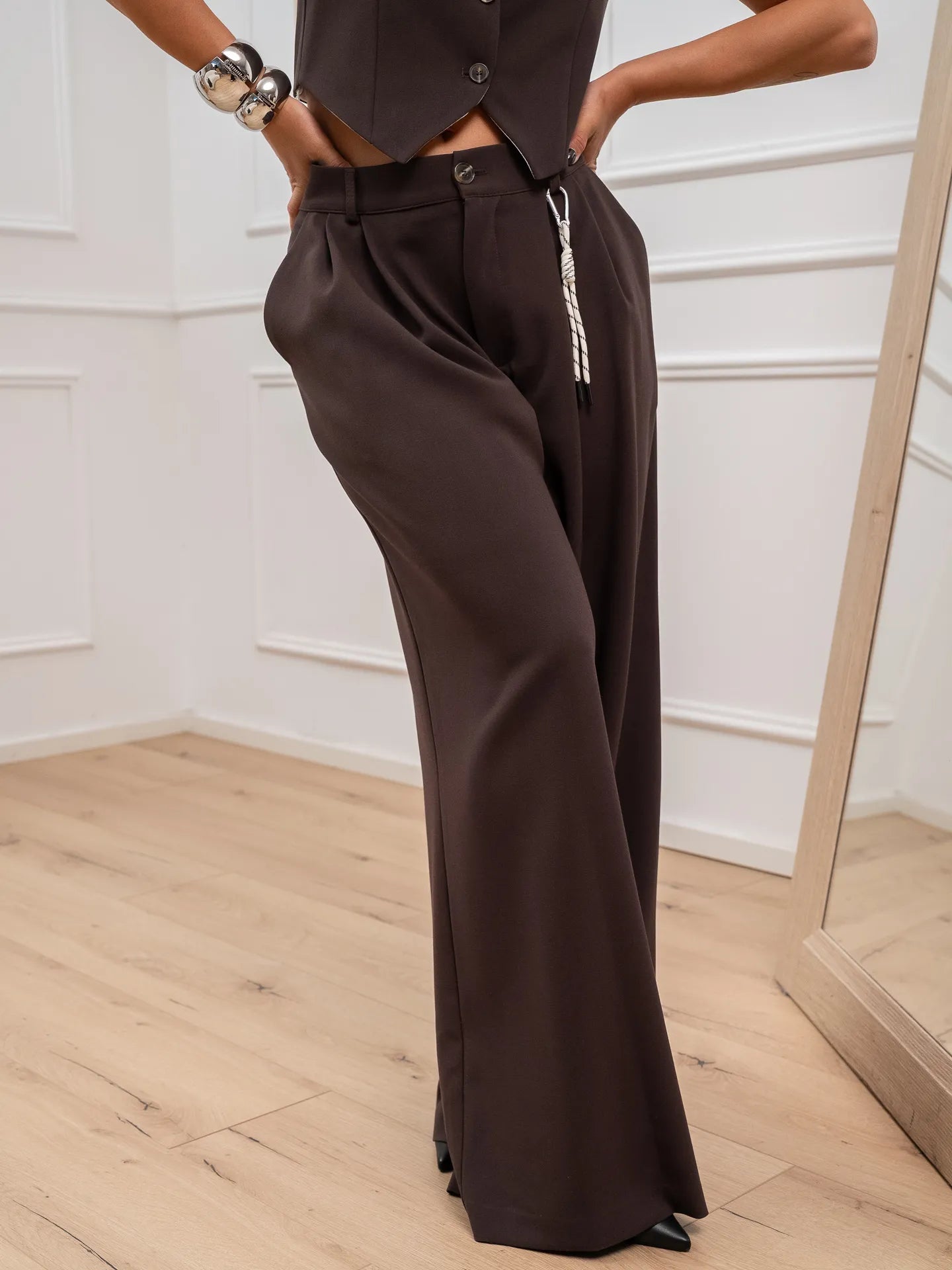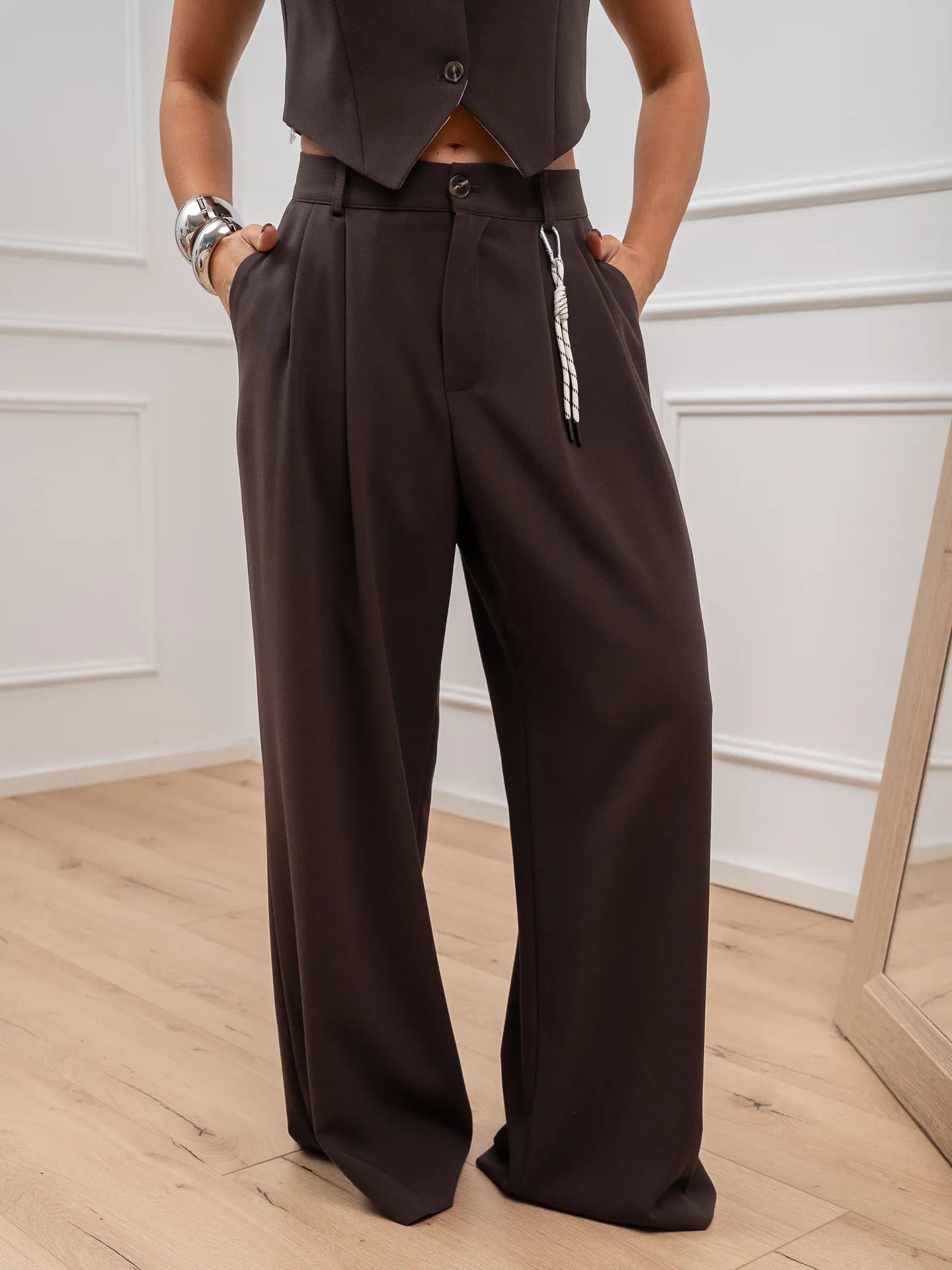 Completo gilet e pantalone color moro misto viscosa Philia Loft. Gilet modello crop, scollo a v e chiusura con bottoni. Pantaloni a palazzo con vita alta, Pinces frontali e tasche laterali. Chiusura con zip e bottone. Dettaglio di charms rimovibile.