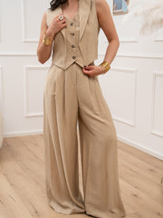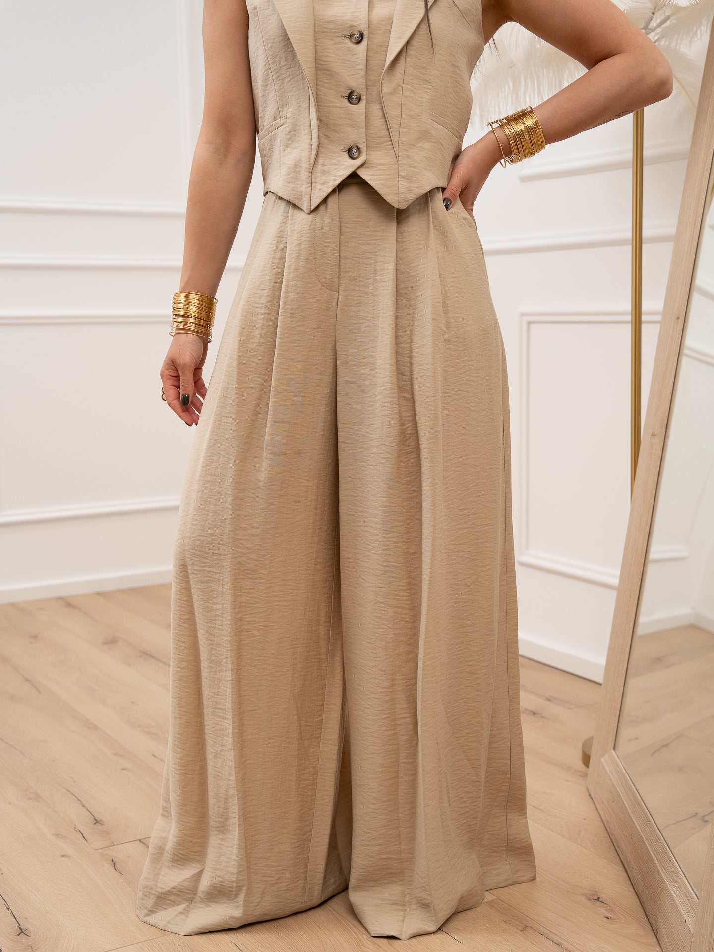 Completo in misto viscosa e lino color beige Dixie. Modello con capospalla gilet e simil panciotto. Chiusura frontale con bottoni, fit slim regolare. Pantaloni a palazzo con vita alta, doppia pinces frontale e chiusura con bottone e zip.