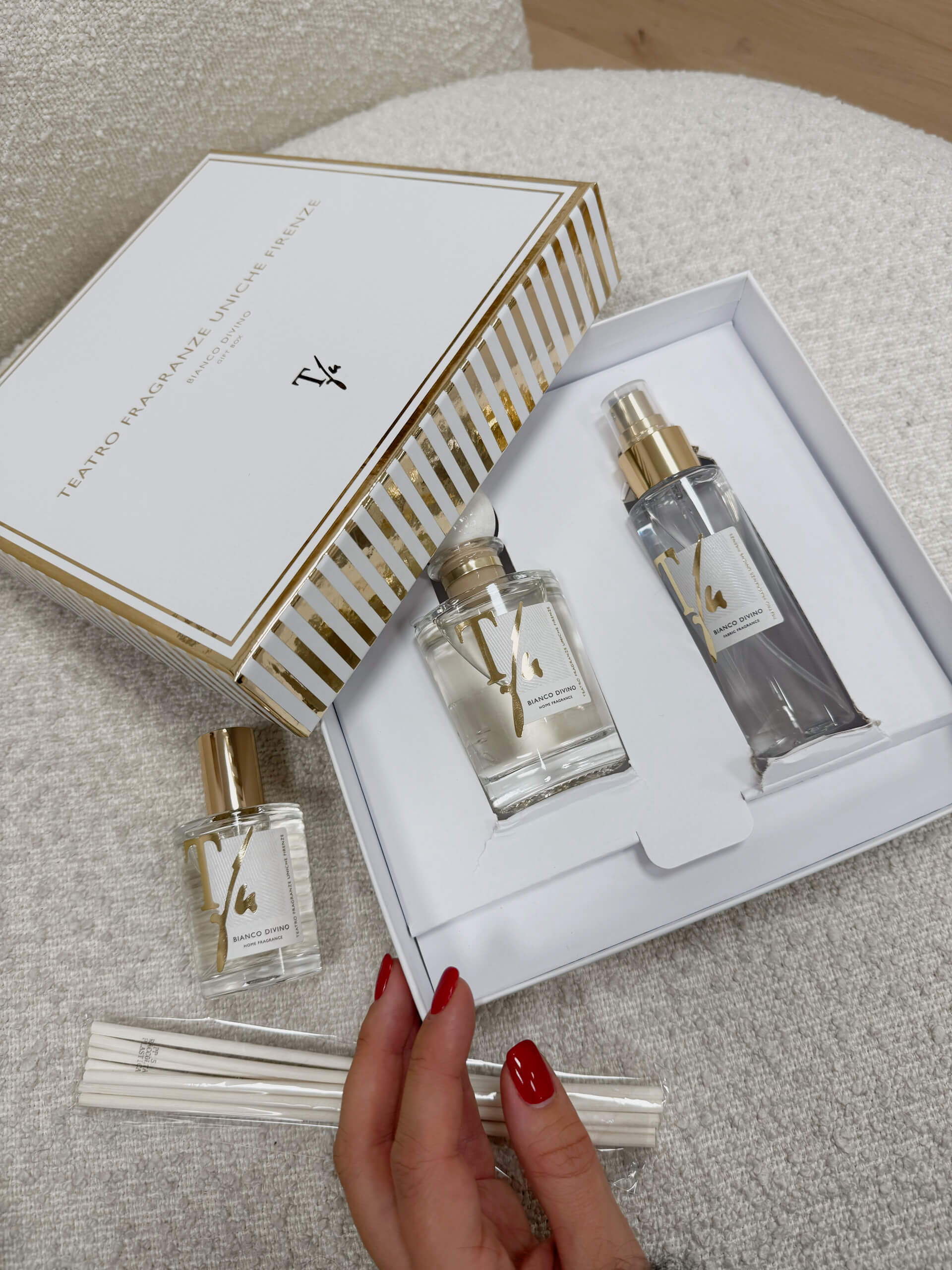 Confezione regalo Bianco Divino Teatro Fragranze Uniche. Profumatore ambiente formato 100 ml con bastoncini + spray per tessuti 100 ml.