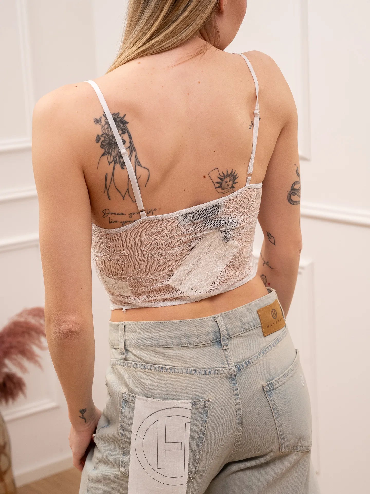 Corsetto lingerie in pizzo bianco HaveOne. Modello fit cropped stile corsetto con ferretto a v e stecche. Spalline sottili regolabili.