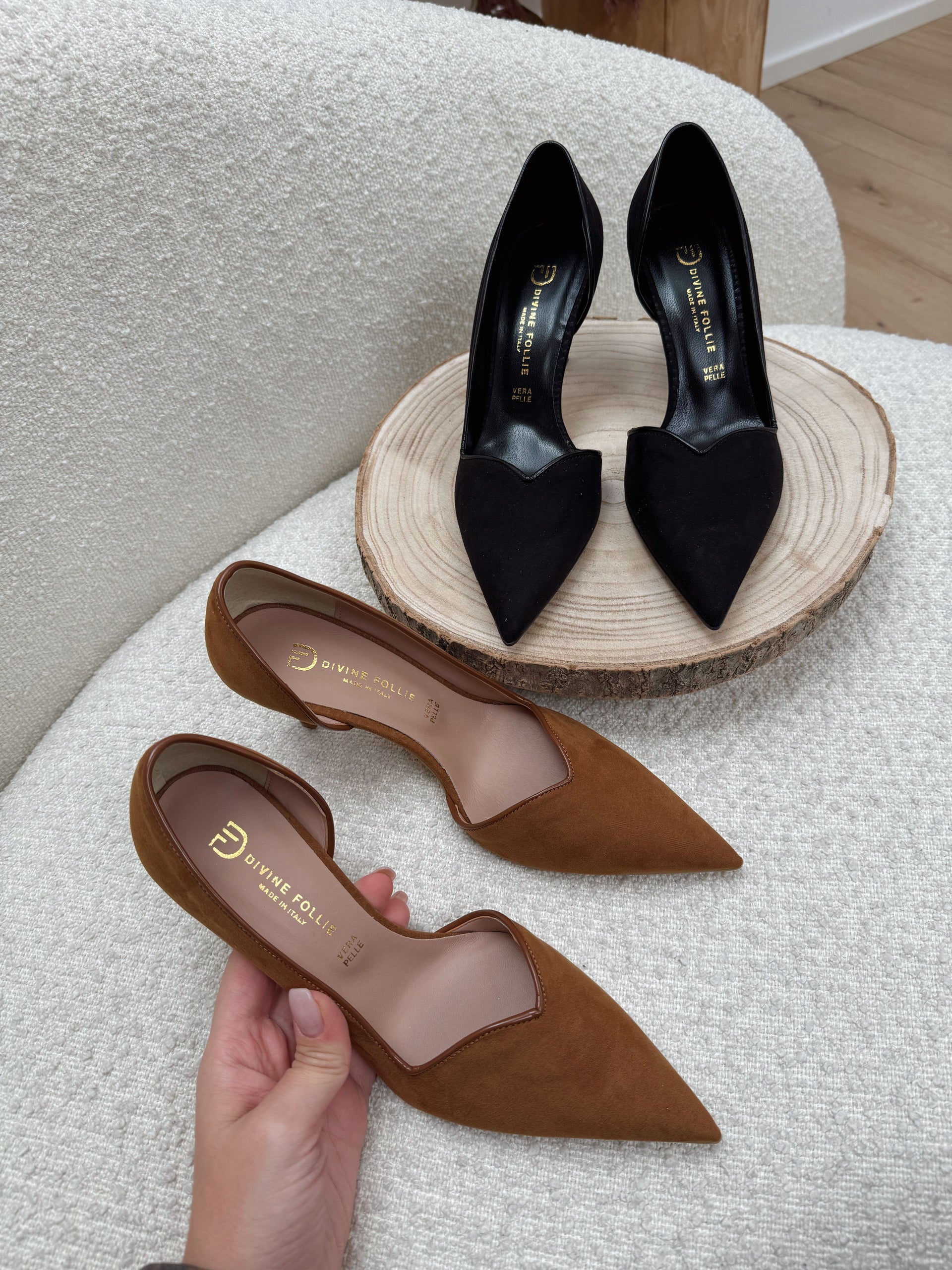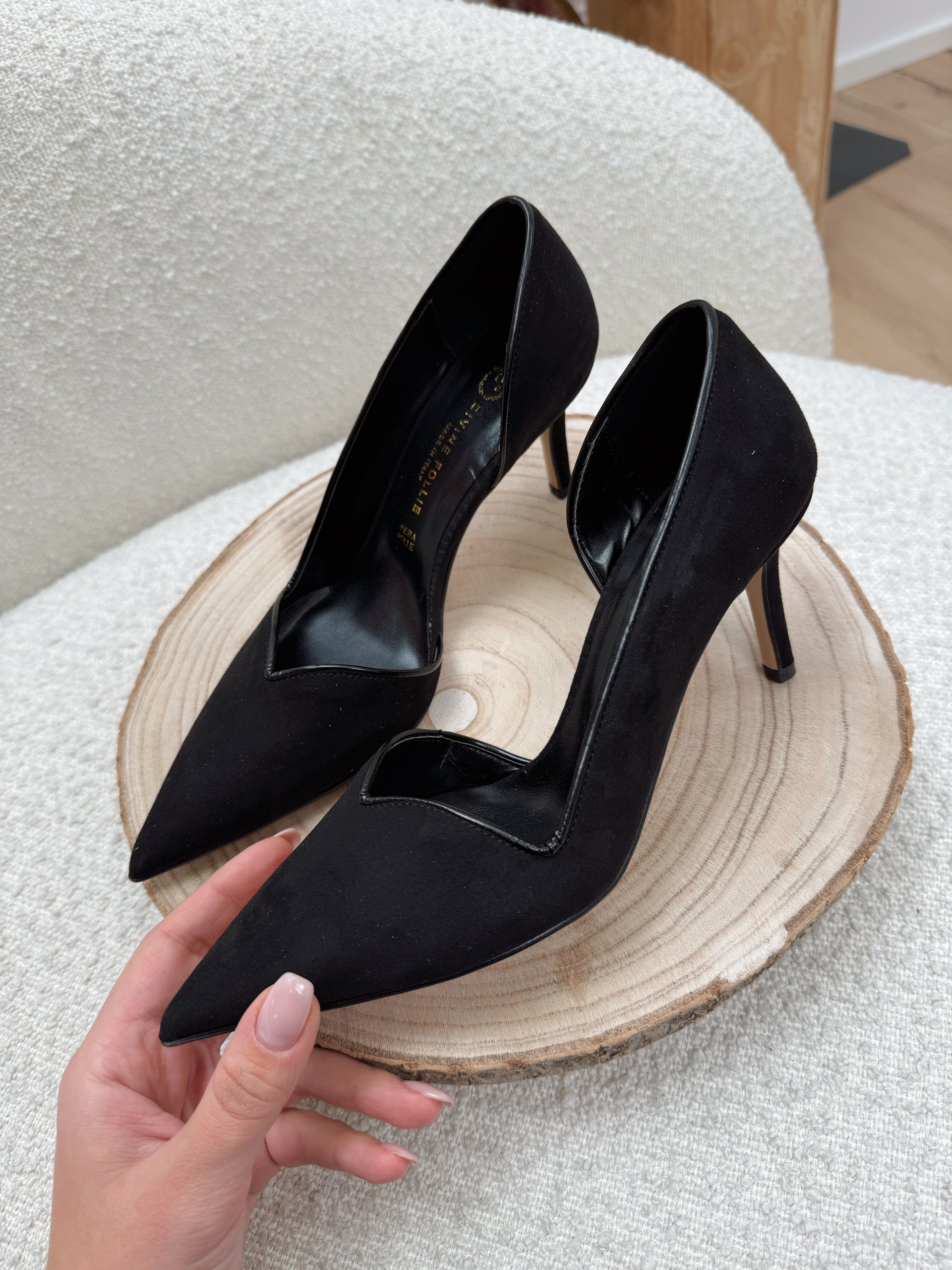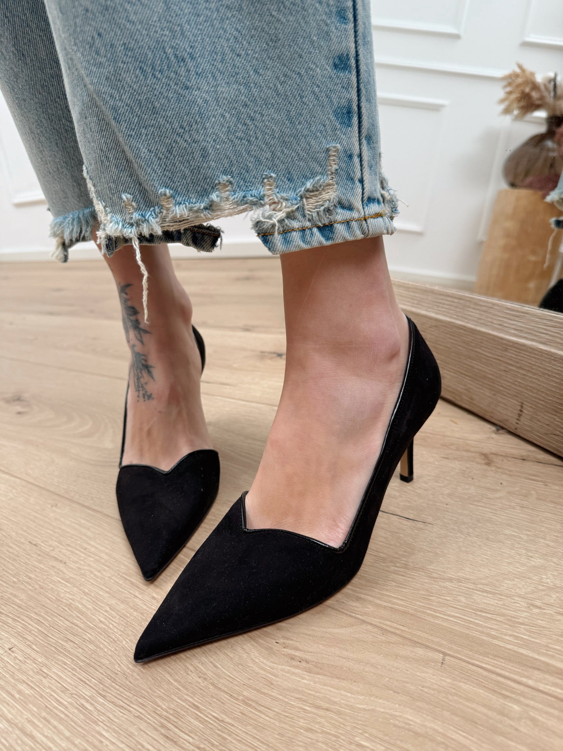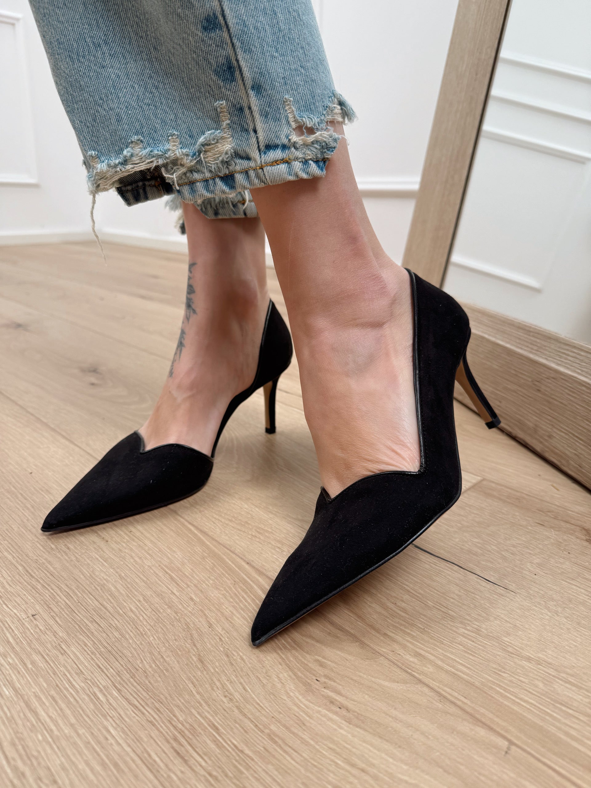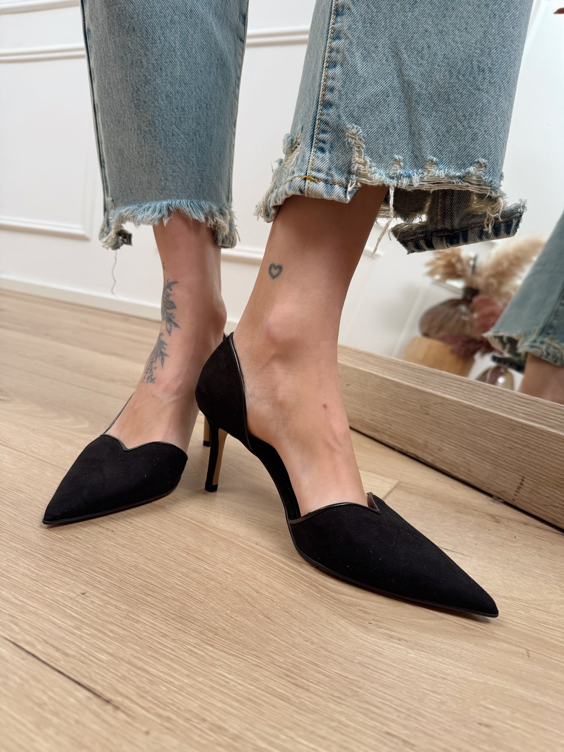 Décolleté Heart nero scamosciato. Modello a punta con scollo a cuore e dettaglio di lato interno aperto. Tacco a spillo. Bordi in vernice.