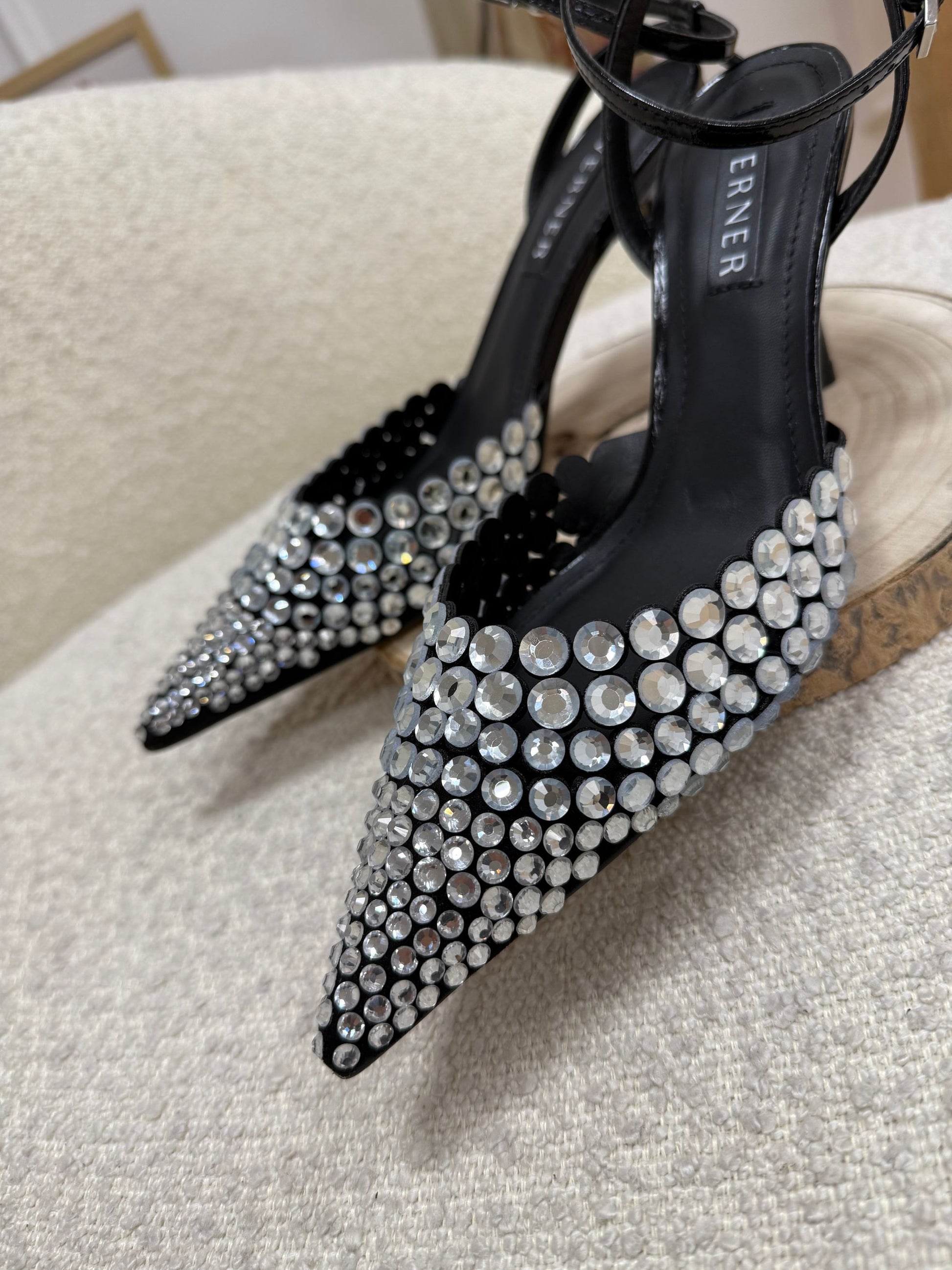 Décolleté color nero Werner. Modello a punta con tacco, dettaglio di strass sulla parte frontale. Laccetto alla caviglia regolabile.