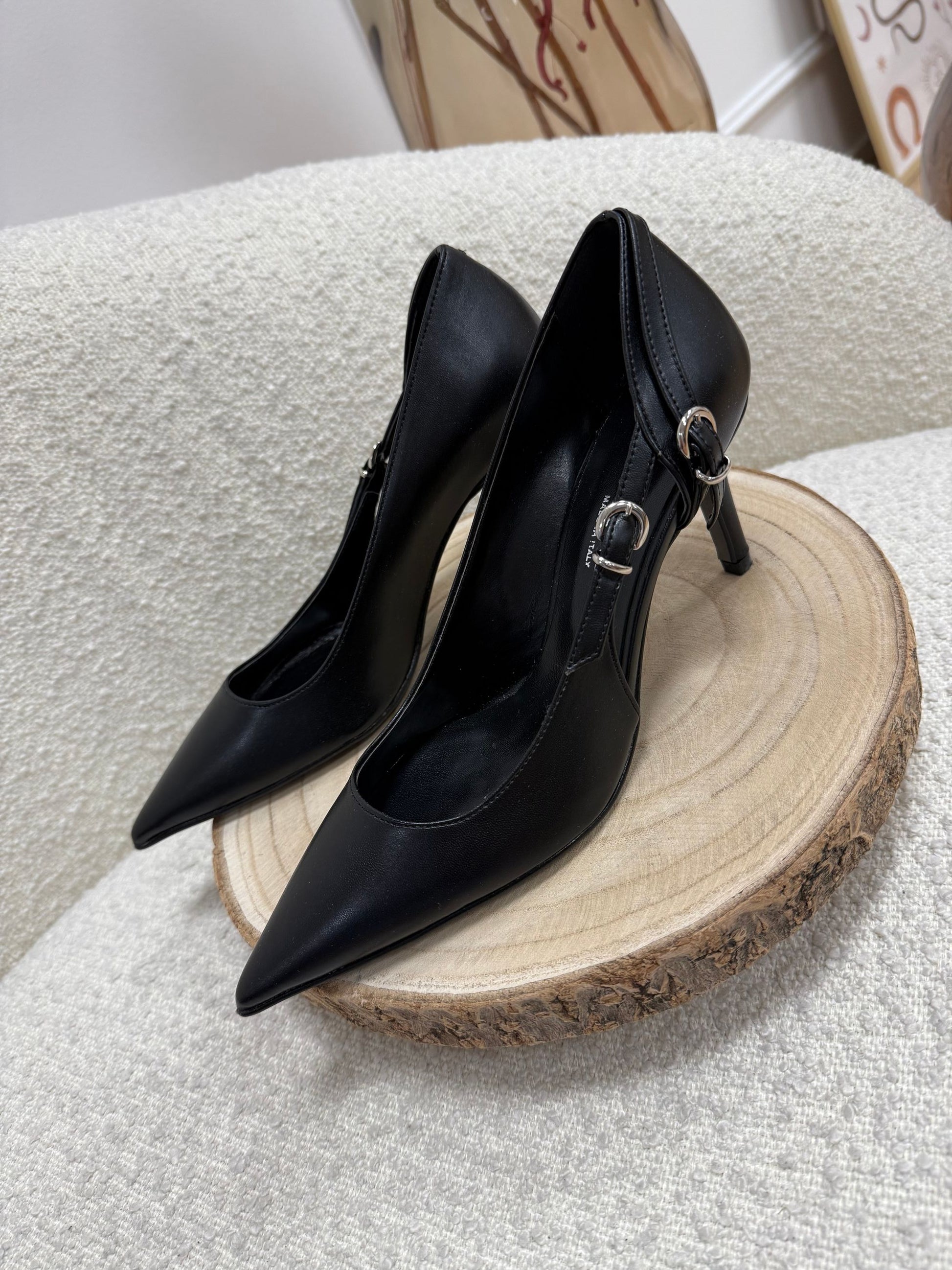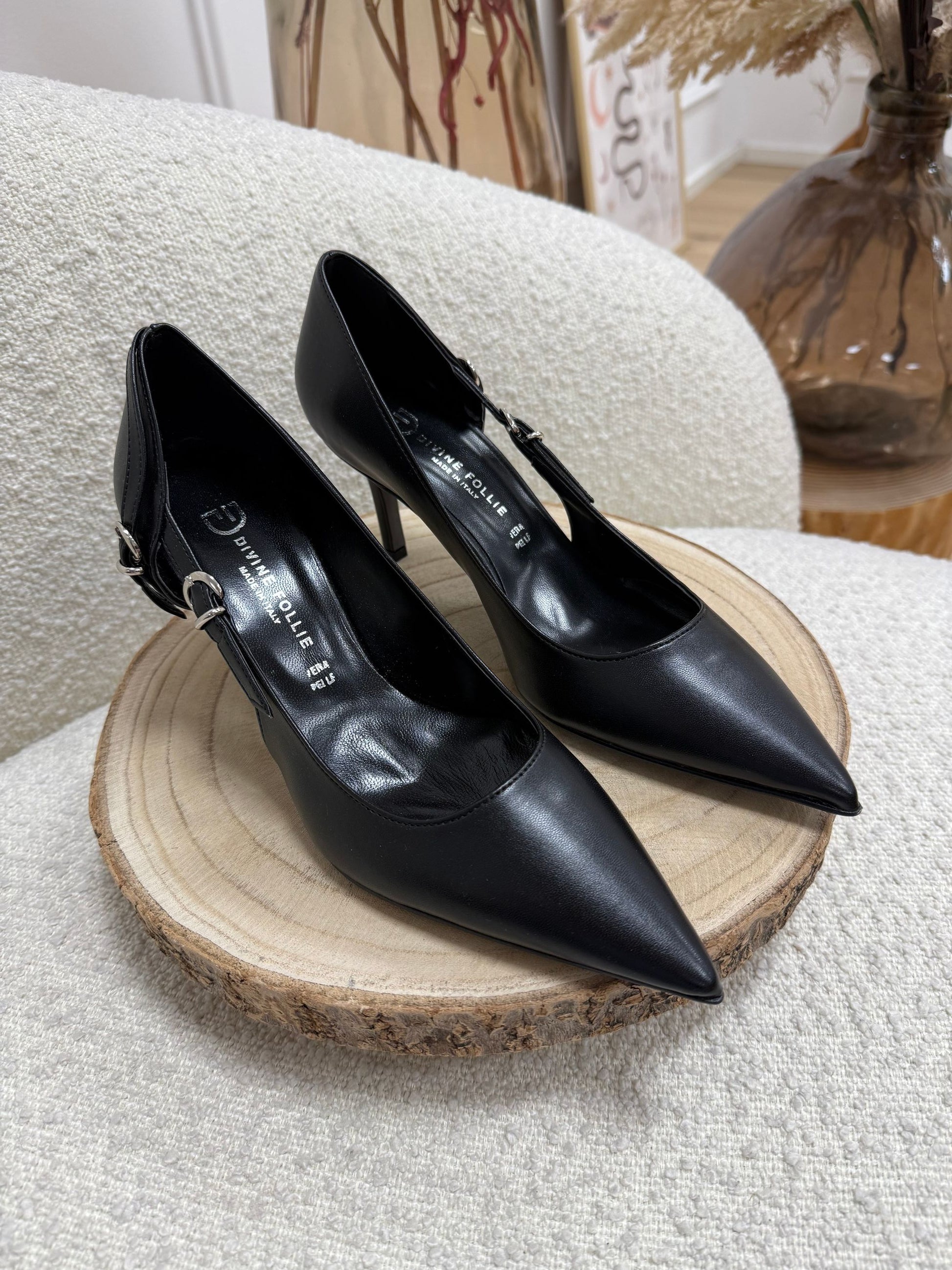 Décolleté color nero in pelle Divine Follie. Modello a punta con tacco a spillo. Dettaglio di fibbie argento con laccetti.