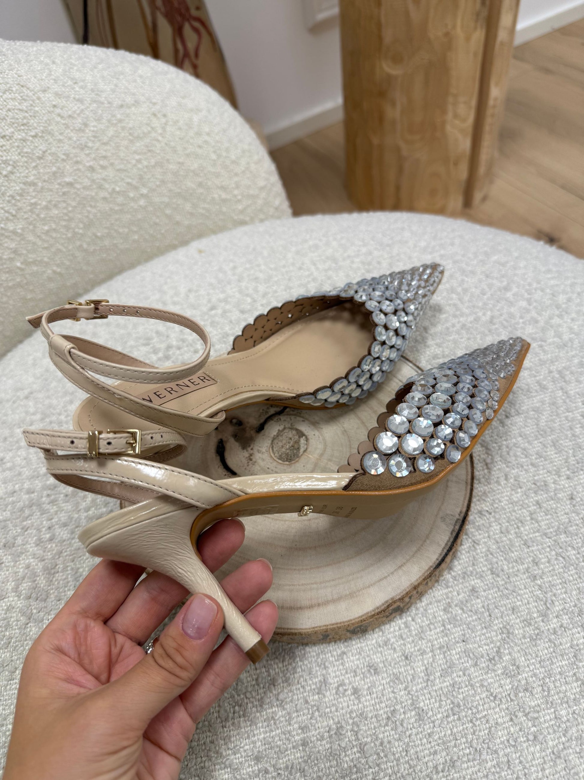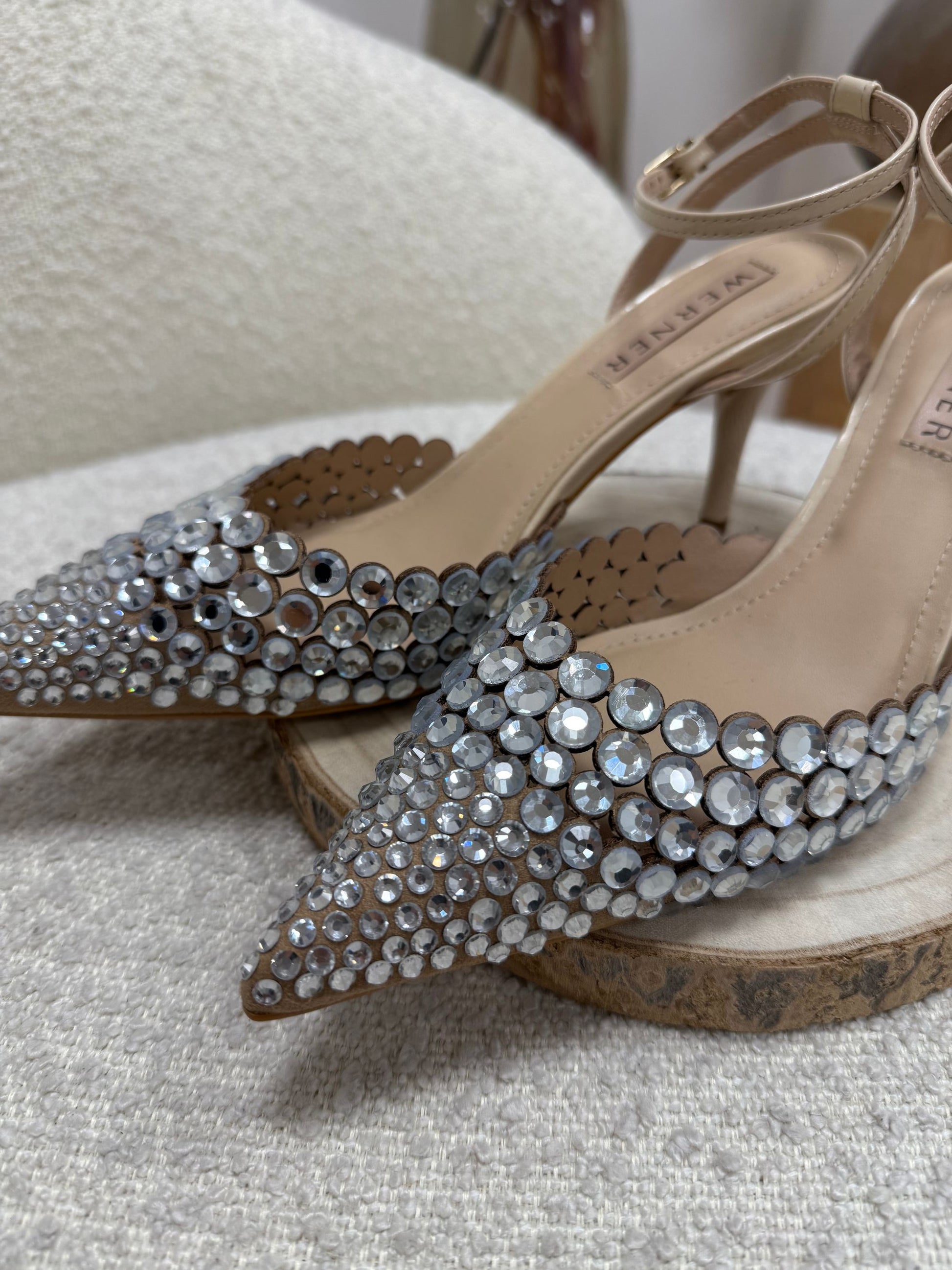 Décolleté color nude Werner. Modello a punta con tacco, dettaglio di strass sulla parte frontale. Laccetto alla caviglia regolabile.