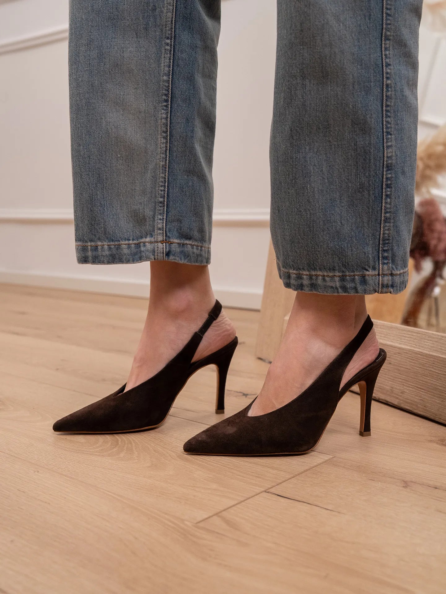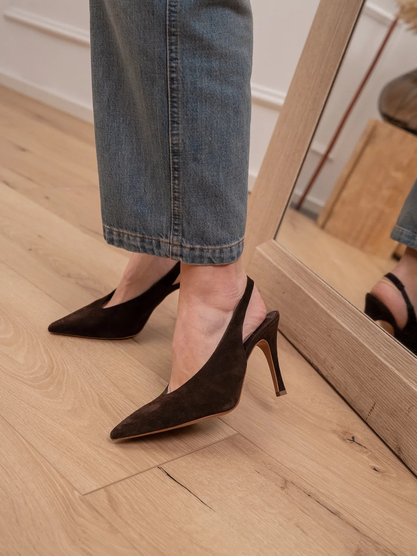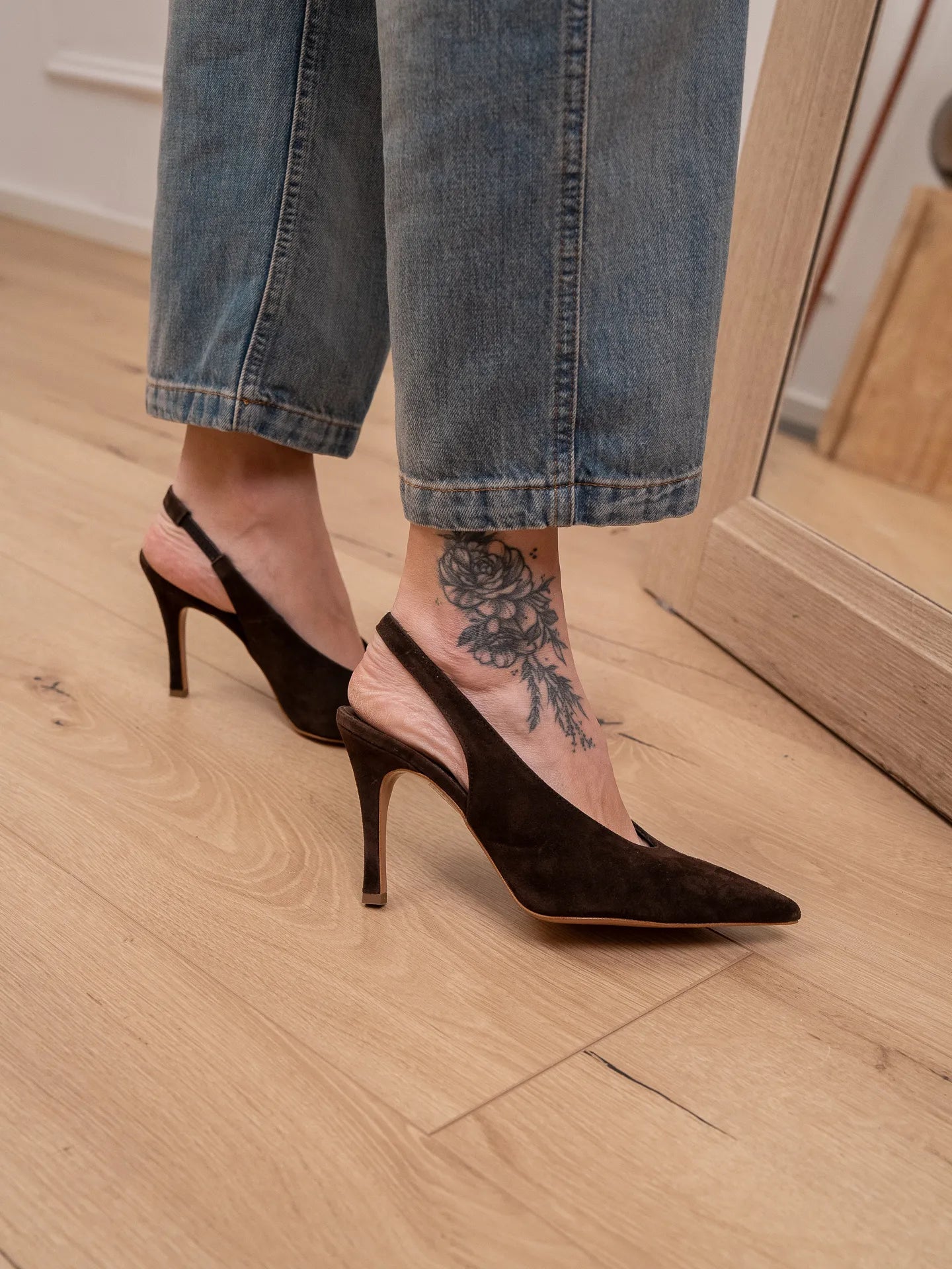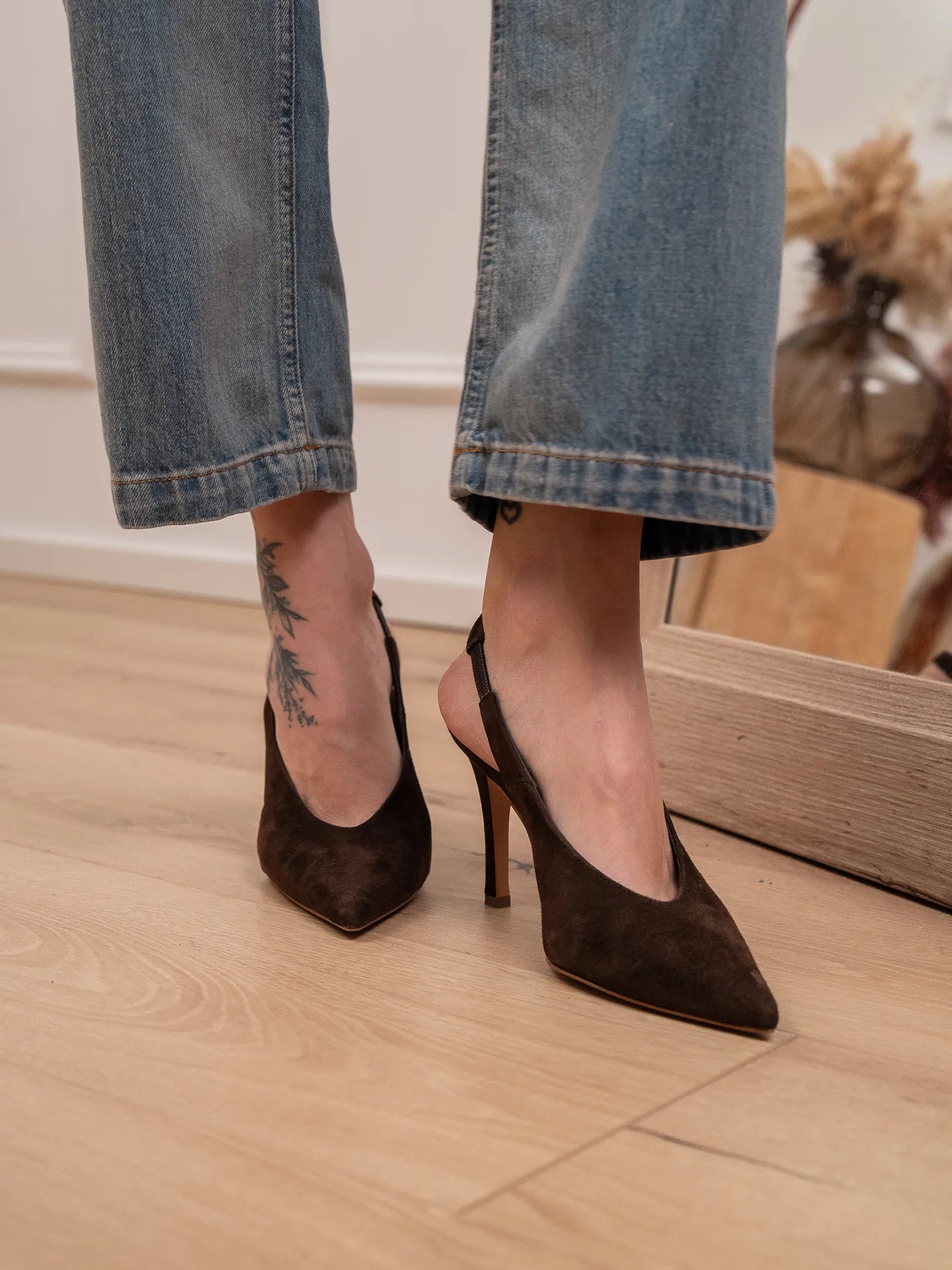 Décolleté scamosciato color moro in pelle Ovyè. Modello scollo profondo con tacco a spillo. Cinturino sul retro del tallone con banda elasticizzata.