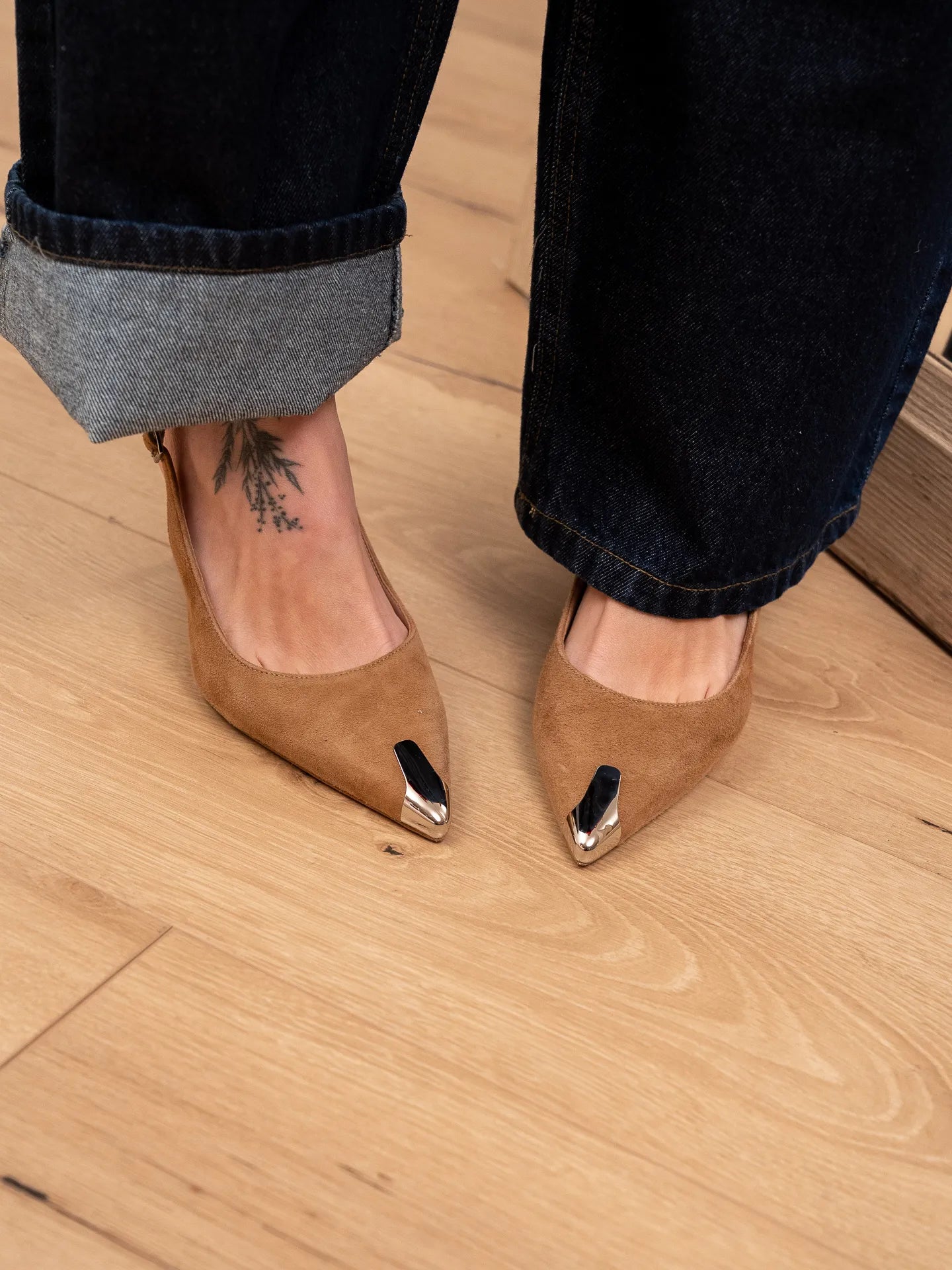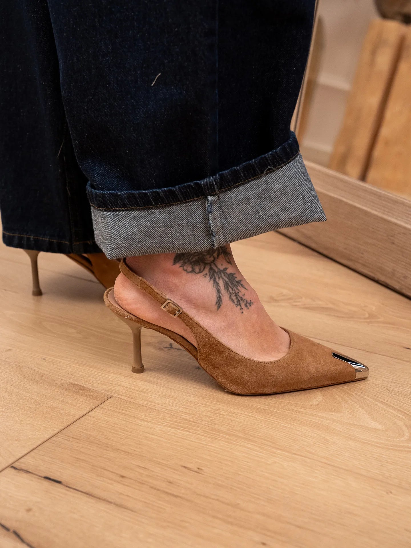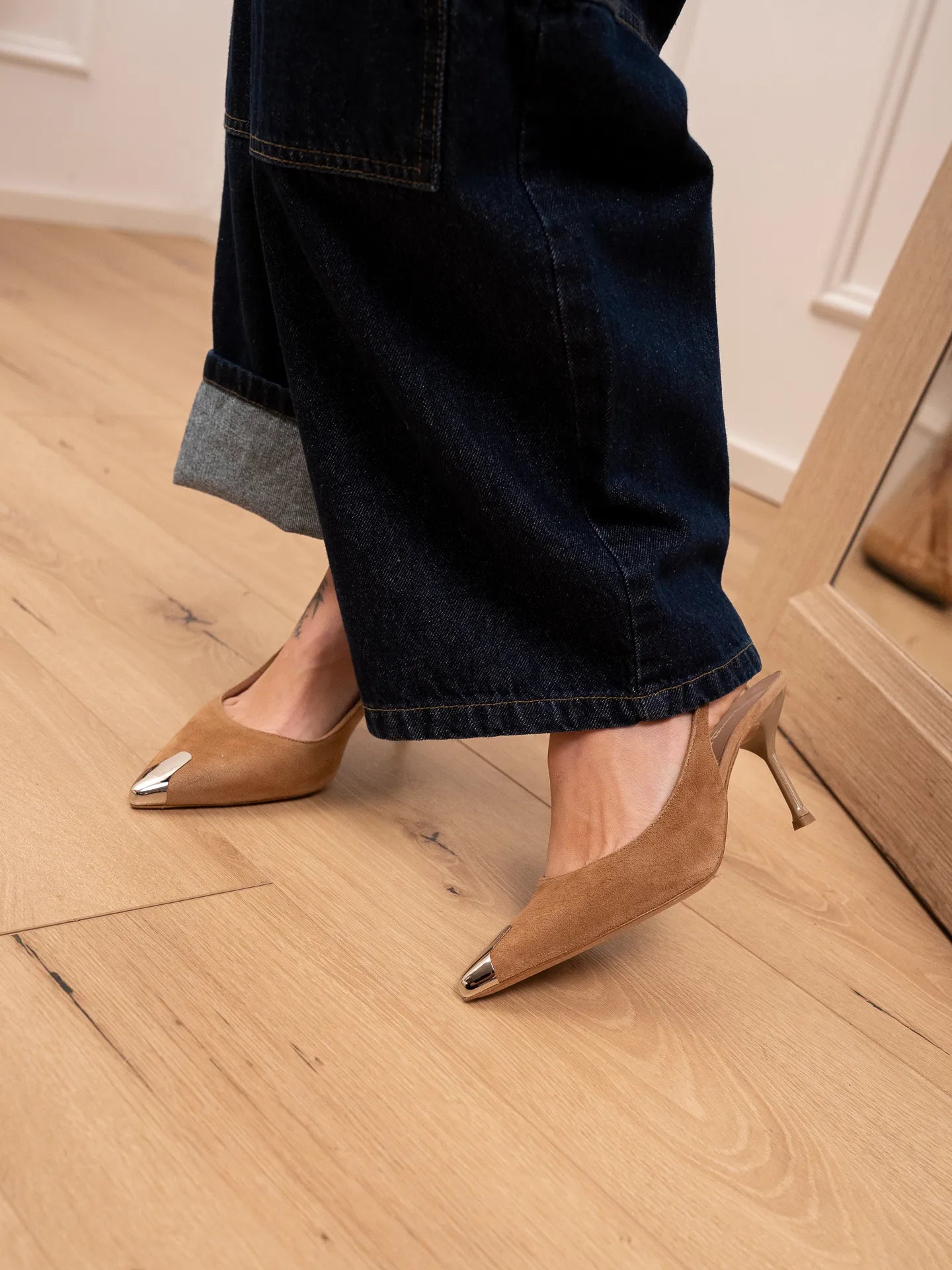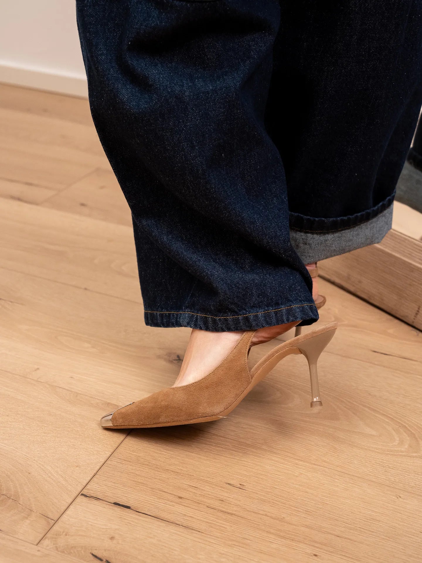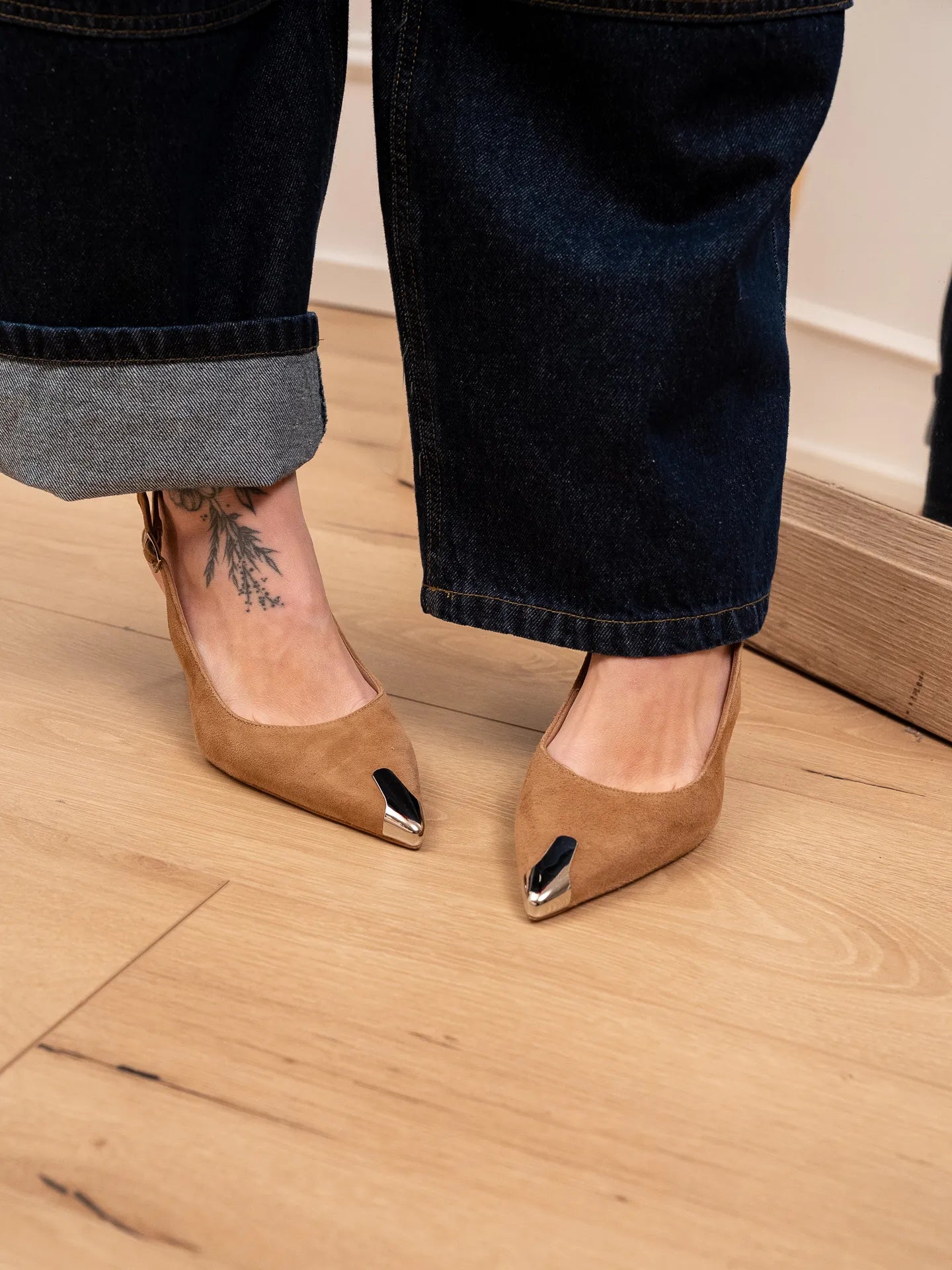 Decolletè slingback in suede sabbia con punta argento - Divine Follie