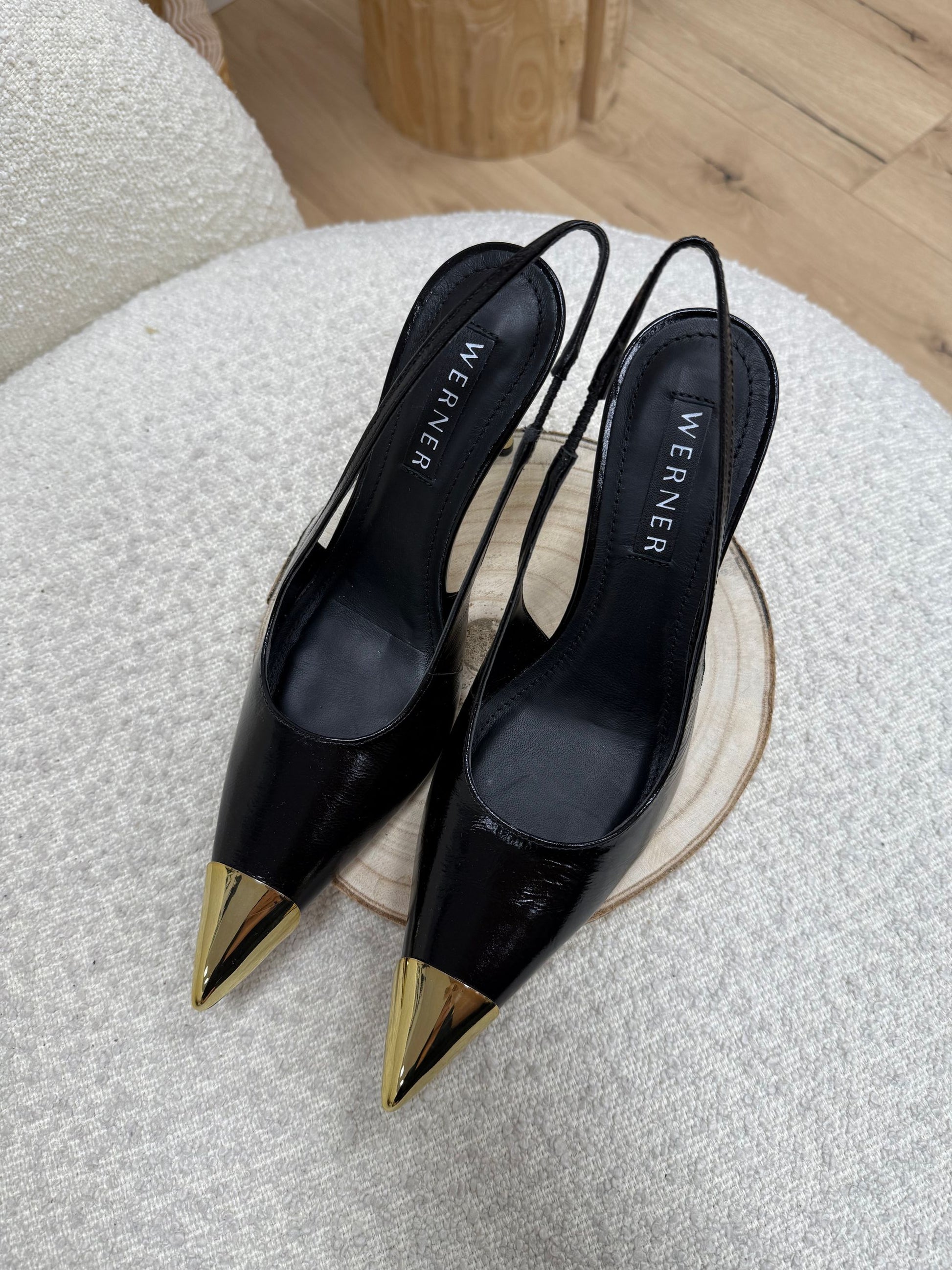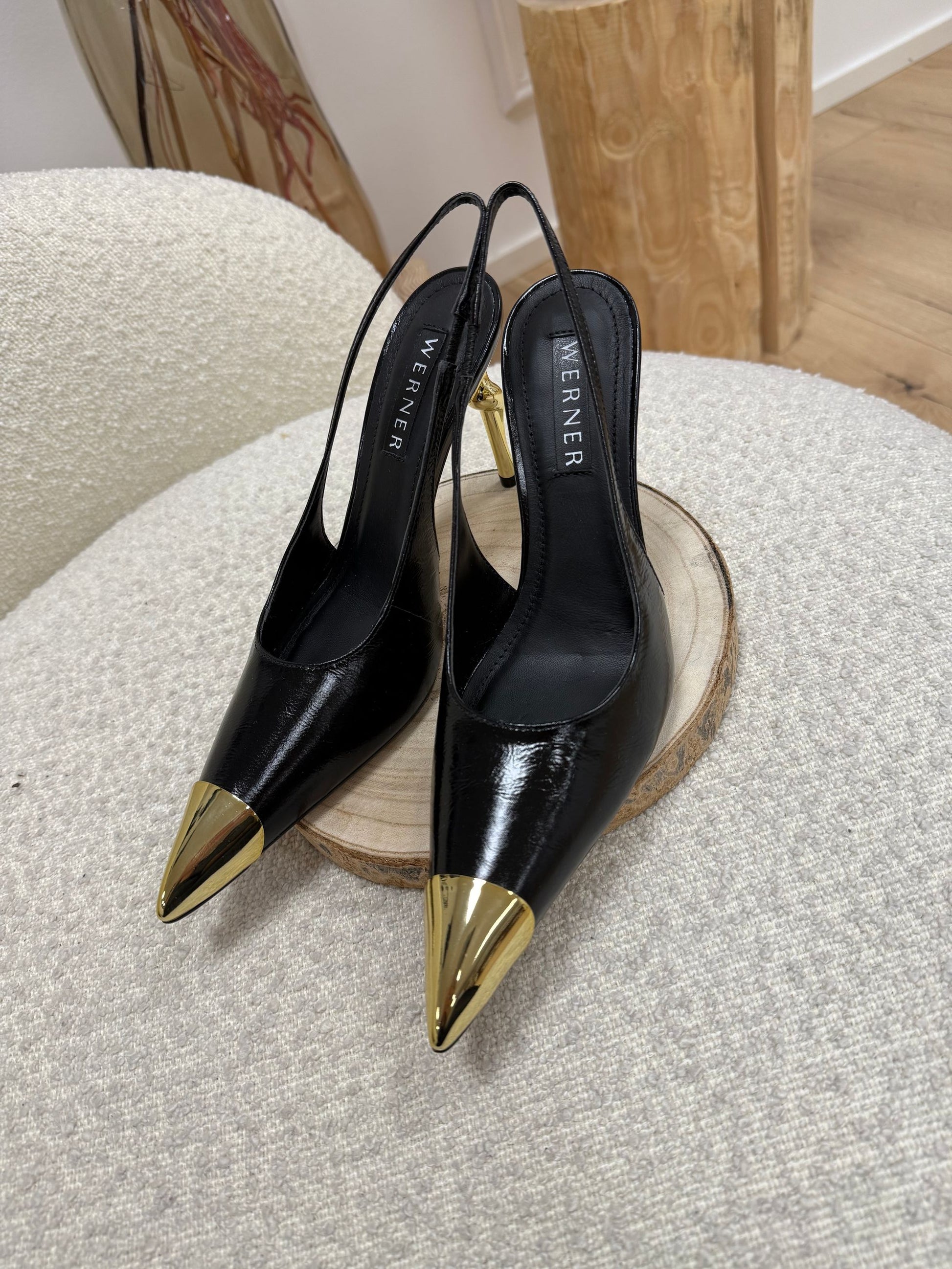 Décolleté slingback color nero Werner. Modello a punta dorata con dettaglio di tacco glam dorato. Laccetto elasticizzato sul retro del tallone.