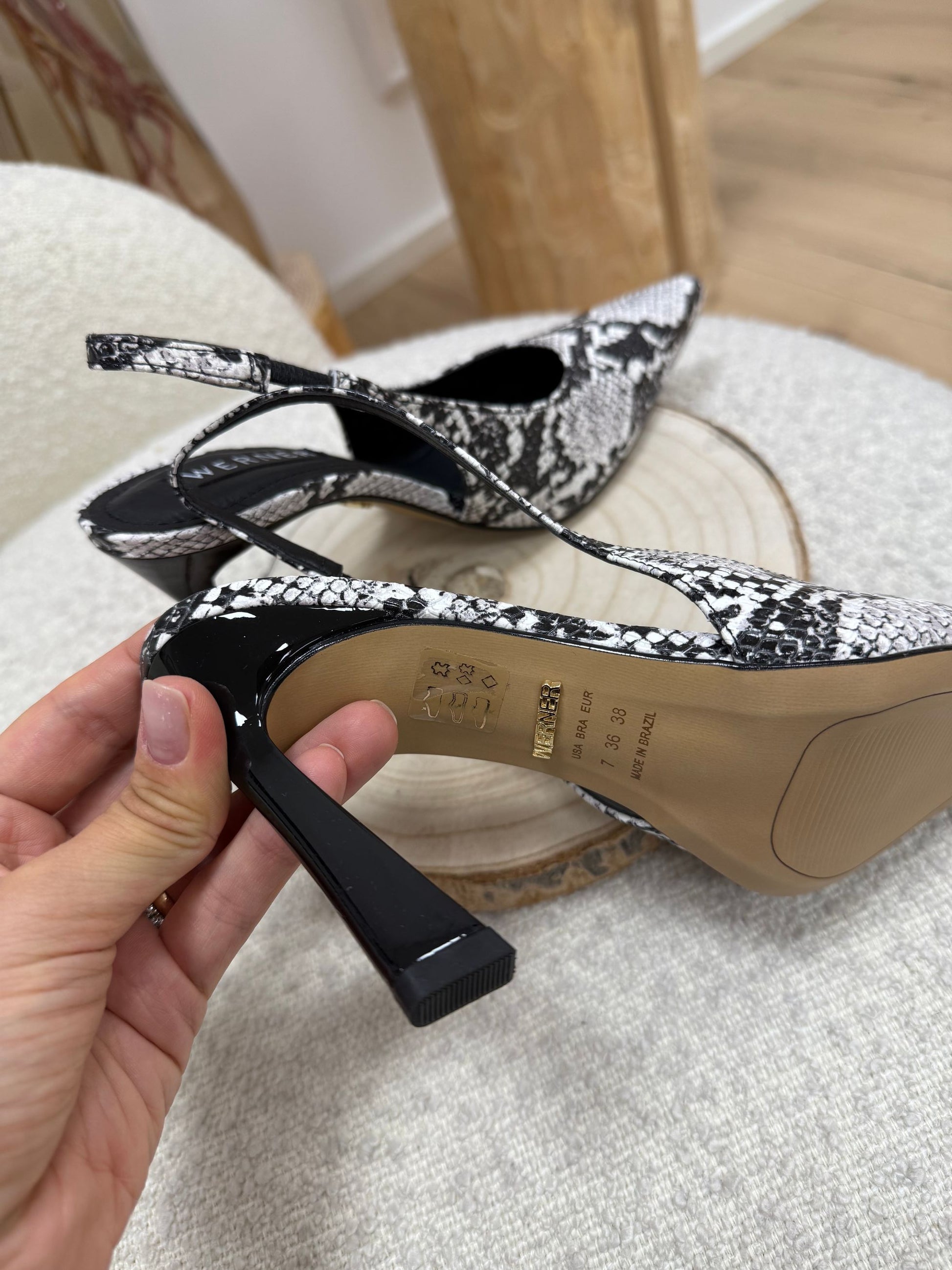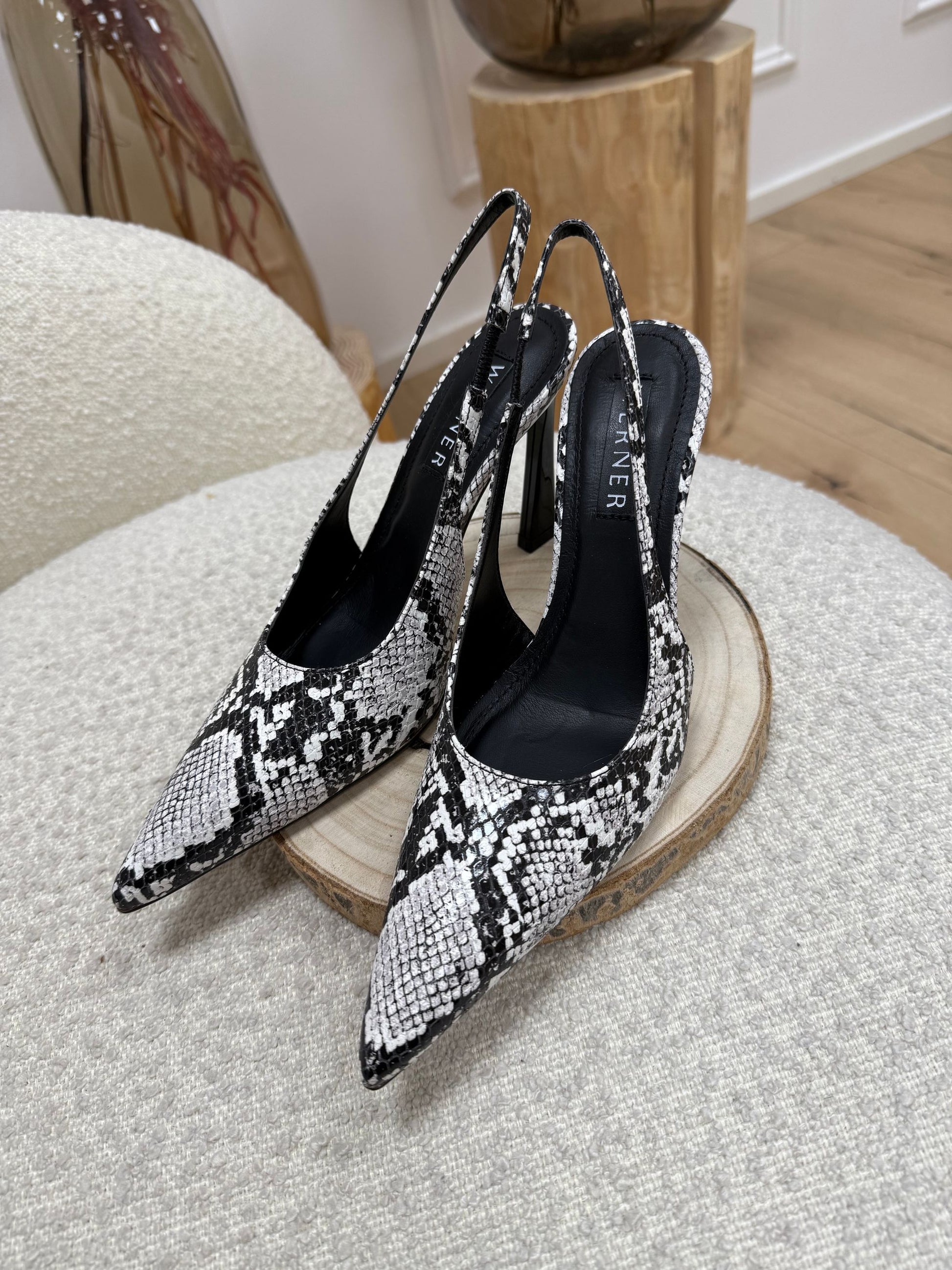 Décolleté slingback pitonato Werner. Modello punta con tacco e laccetto elasticizzato sul retro del tallone.