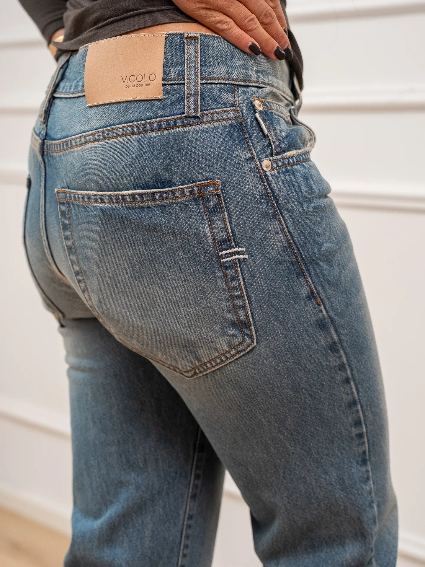 Jeans Zeke lavaggio sabbiato Vicolo. Modello straight relaxed fit a vita medio alta. Chiusura bottone e zip.