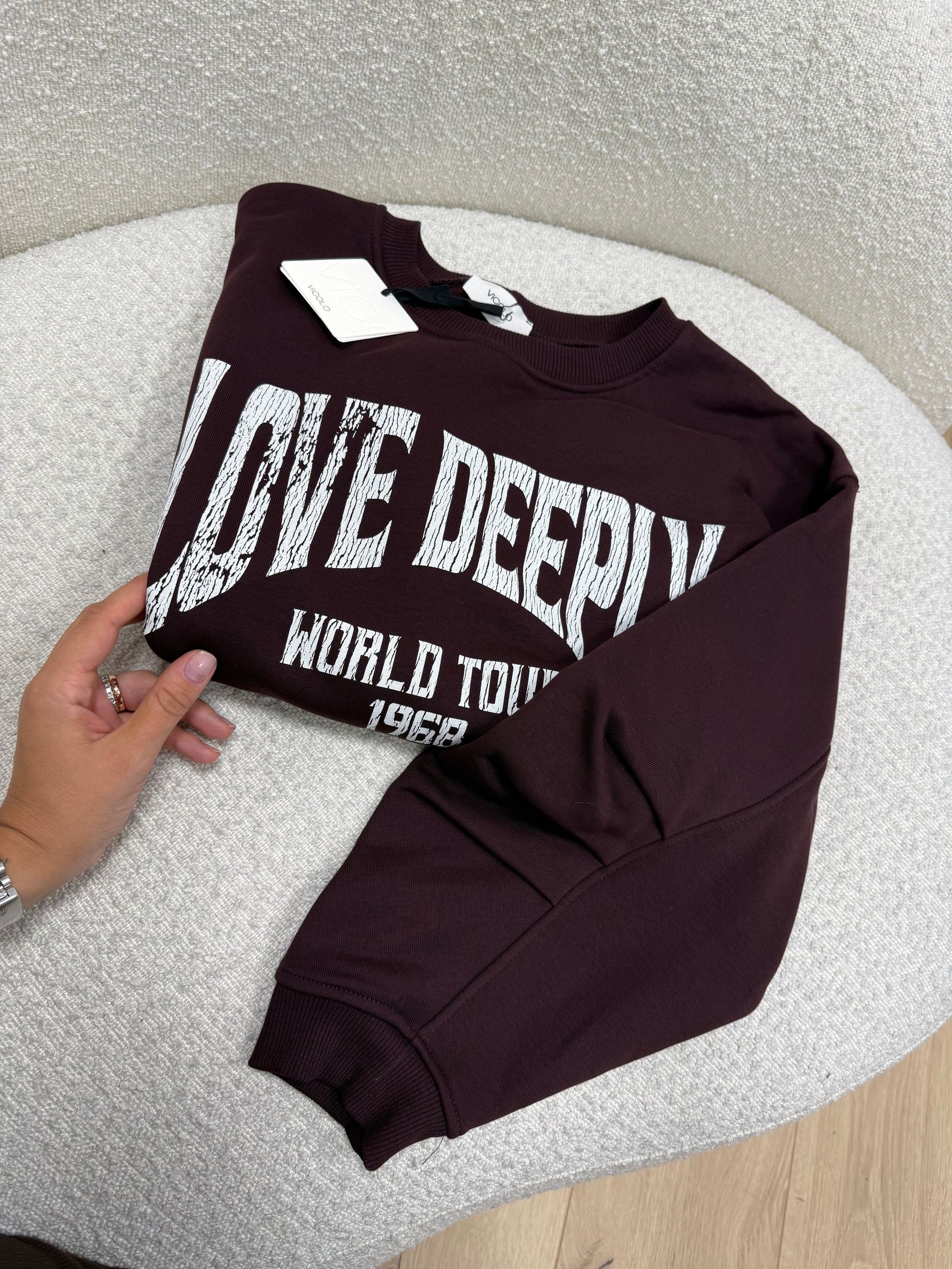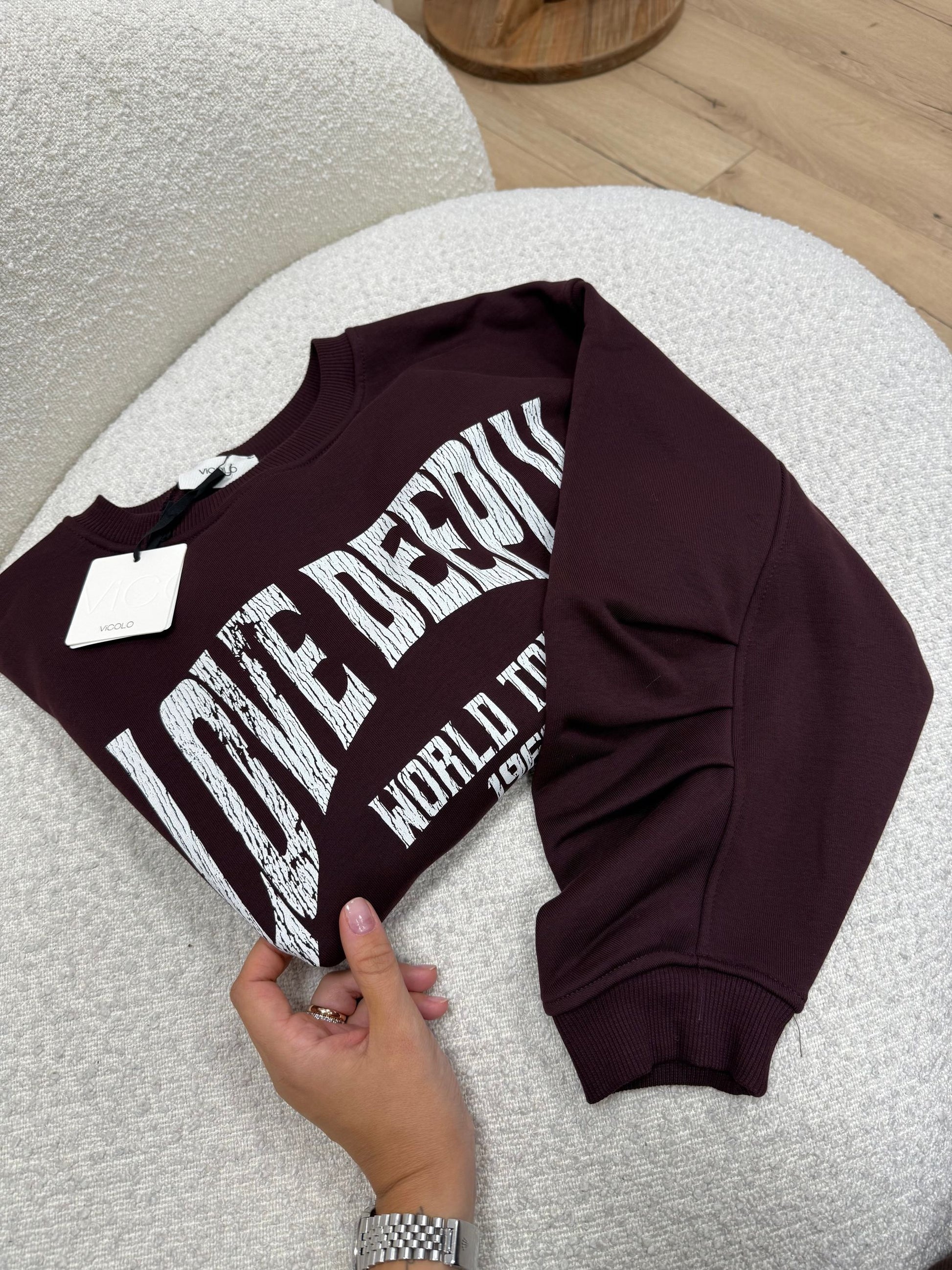 Felpa color bordeaux Vicolo. Modello garzato fit oversize, manica lunga con arriccio sul retro. Dettaglio di stampa Lovely Deeply a contrasto. Finiture a costine.