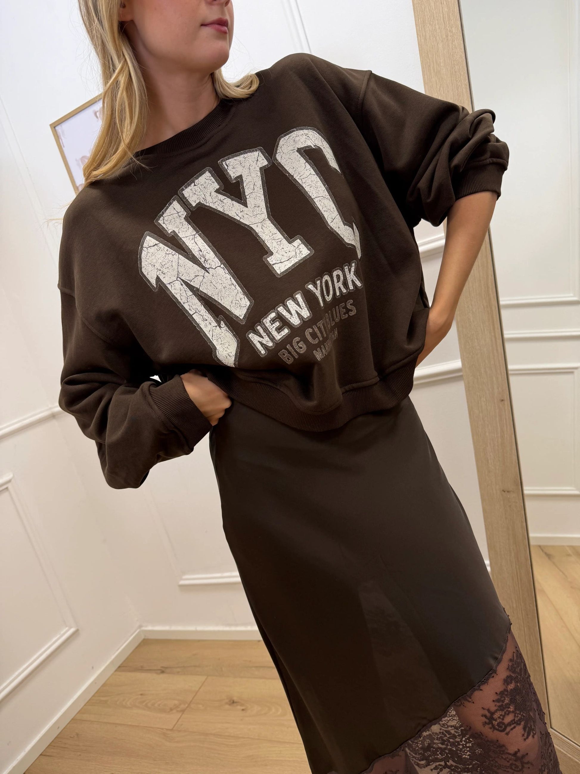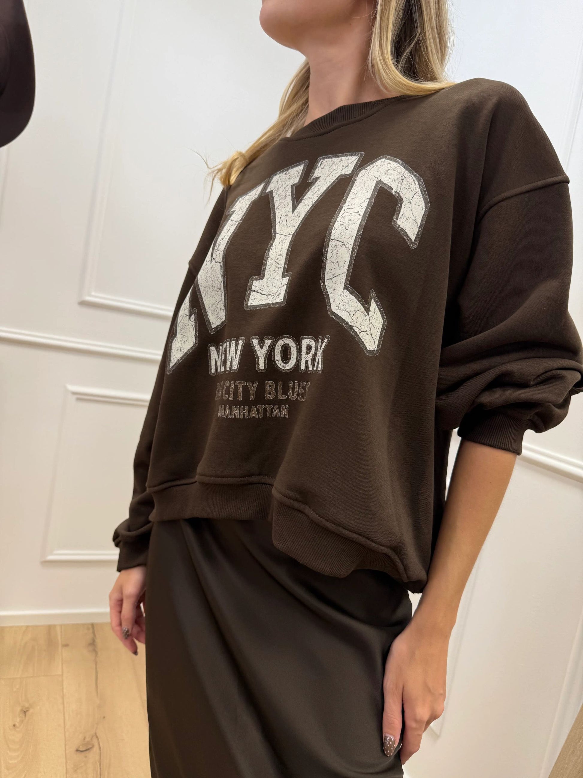 Felpa color caffè Vicolo. Modello garzato fit oversize, manica lunga con arriccio sul retro. Dettaglio di stampa NYC color bianco. Finiture a costine.