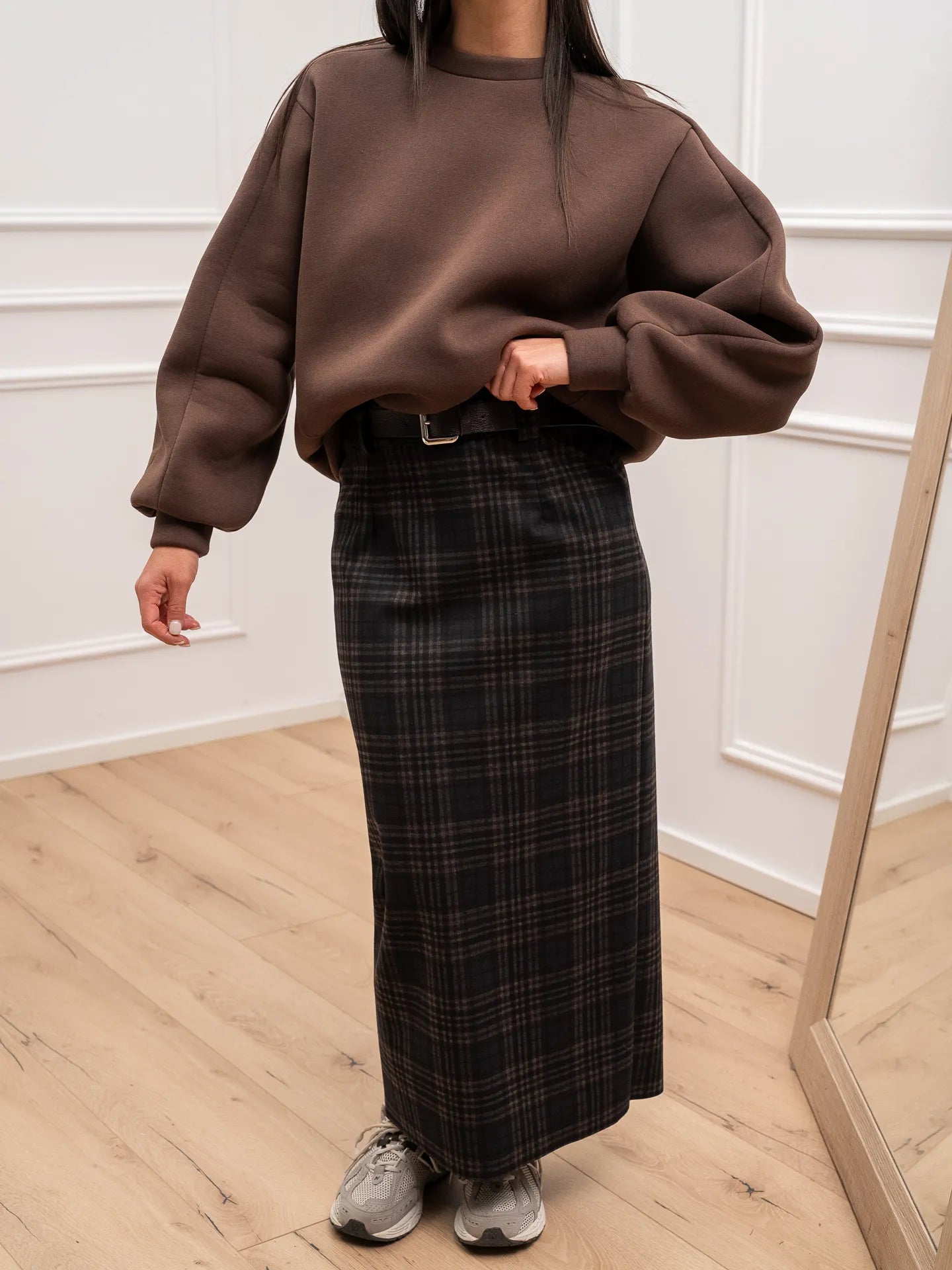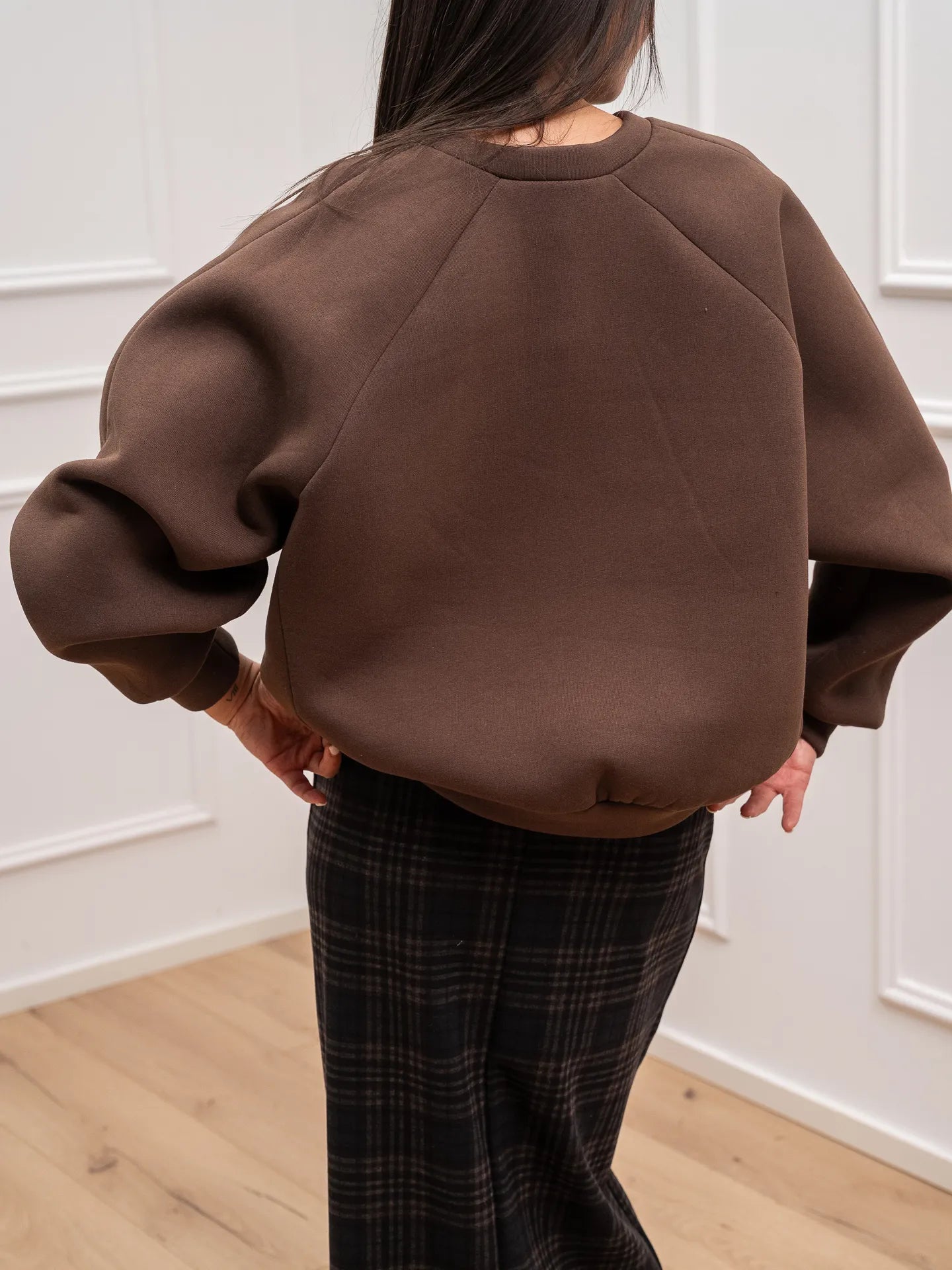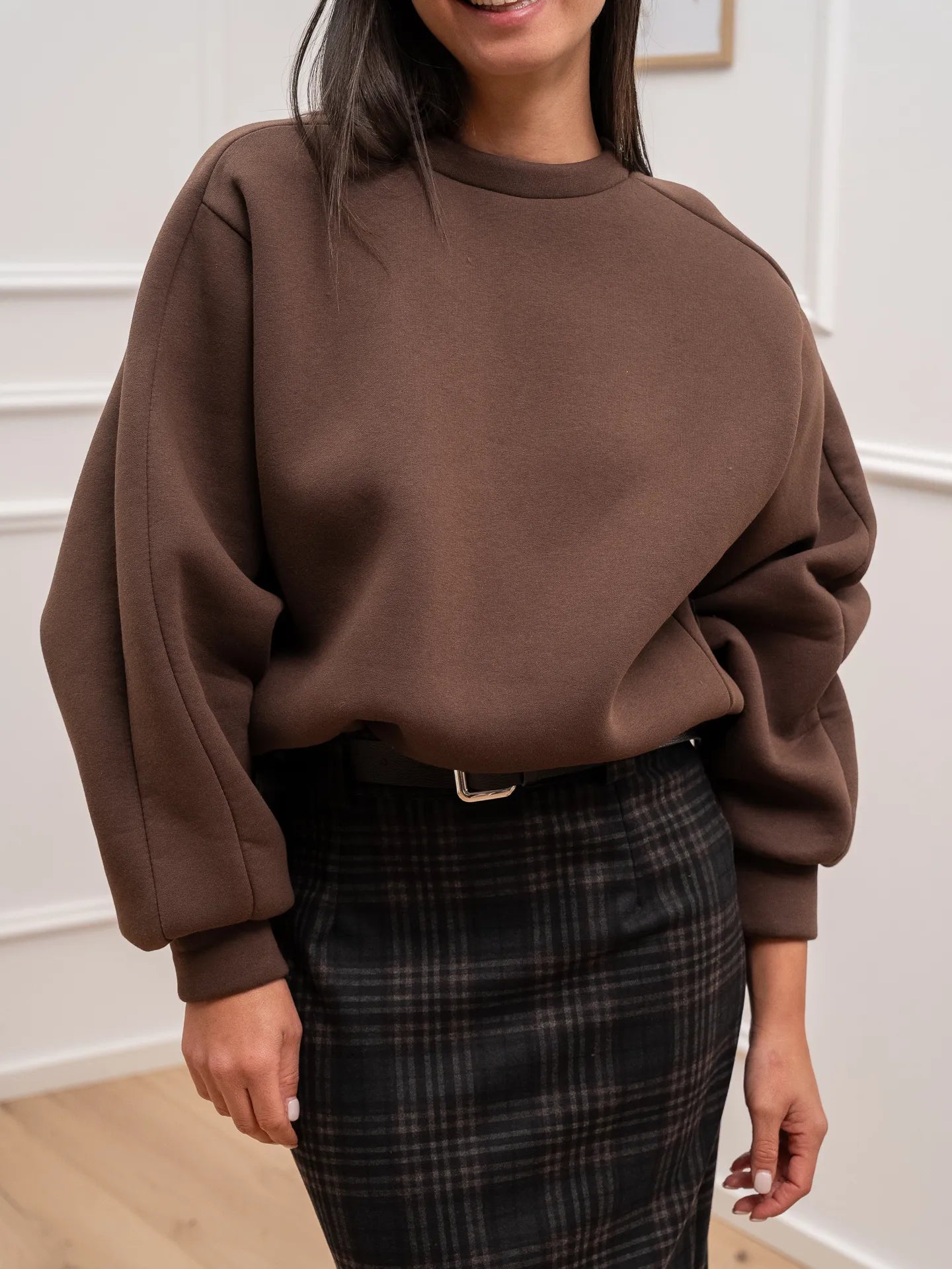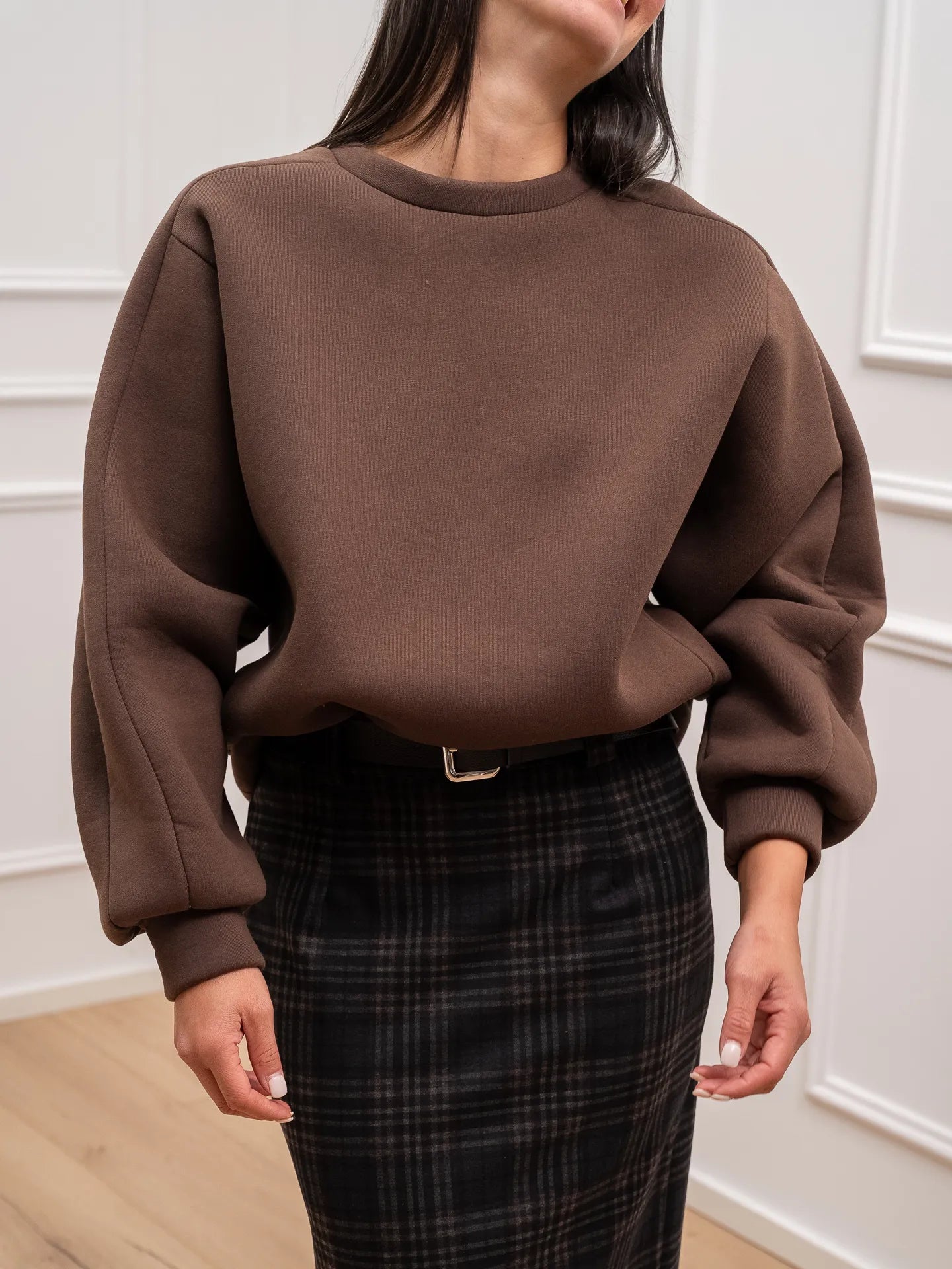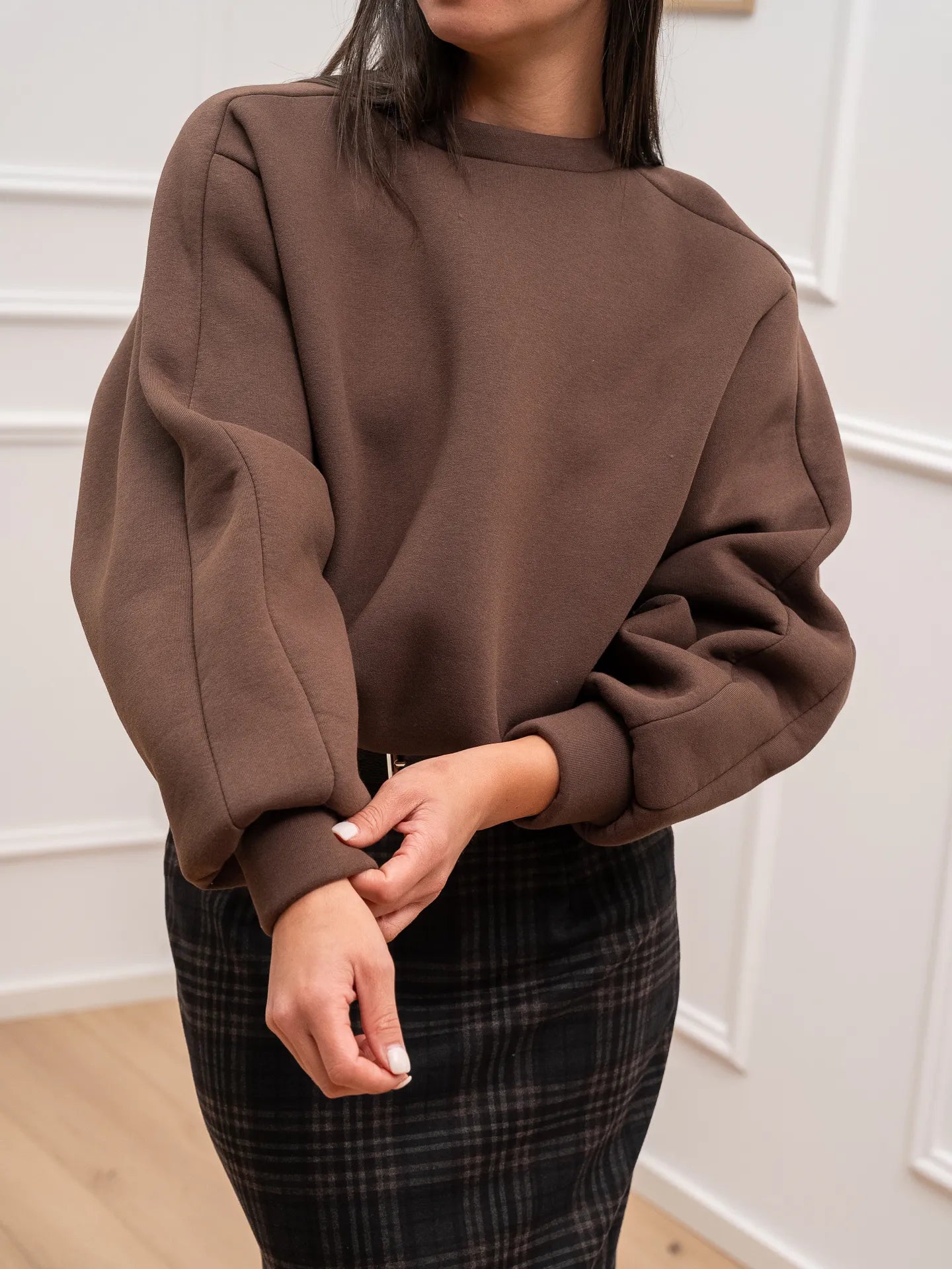 Felpa interno felpato color moro HaveOne. Modello fit over con manica a palloncino, girocollo e maniche lunghe con polsino sul fondo.