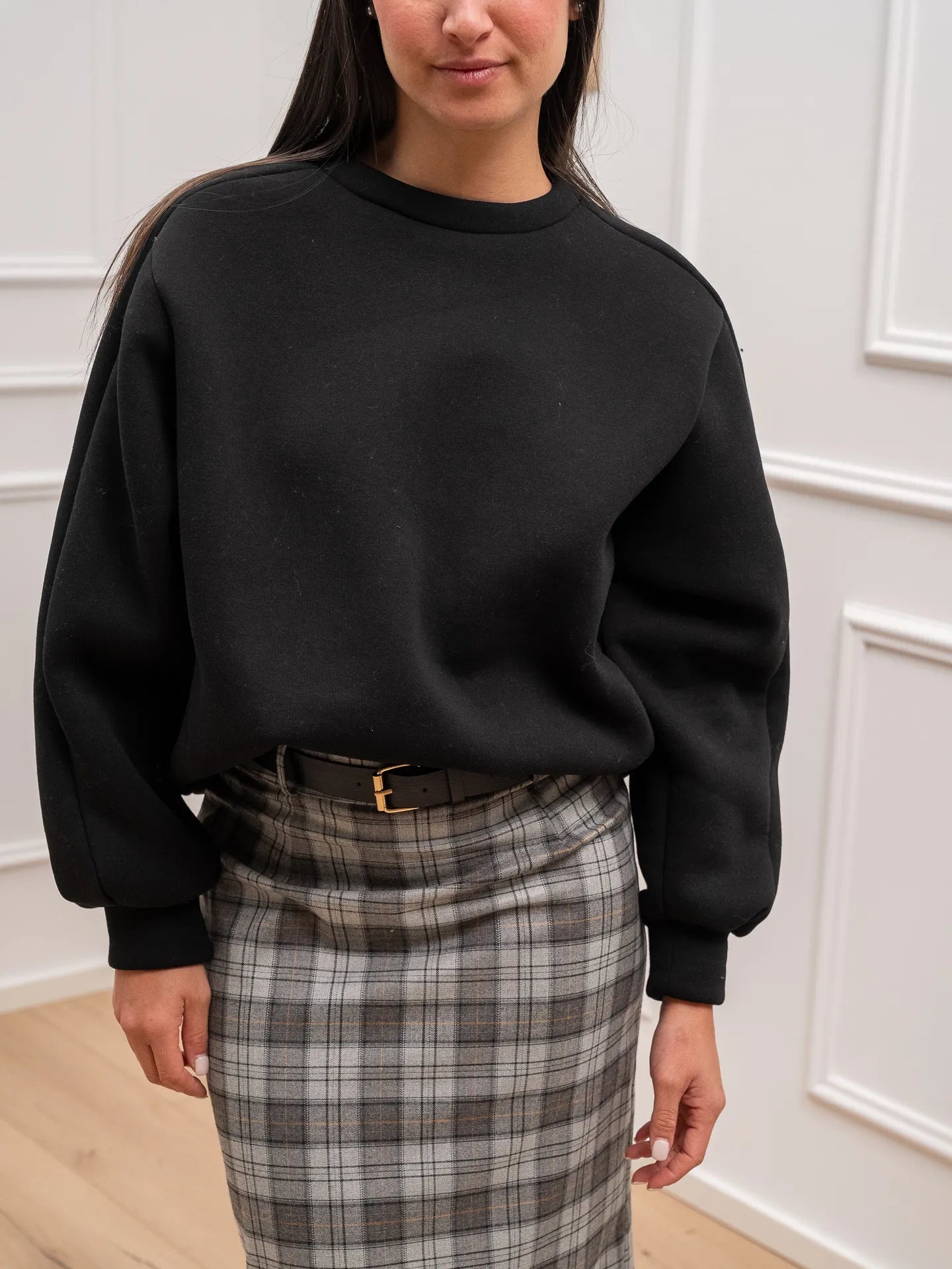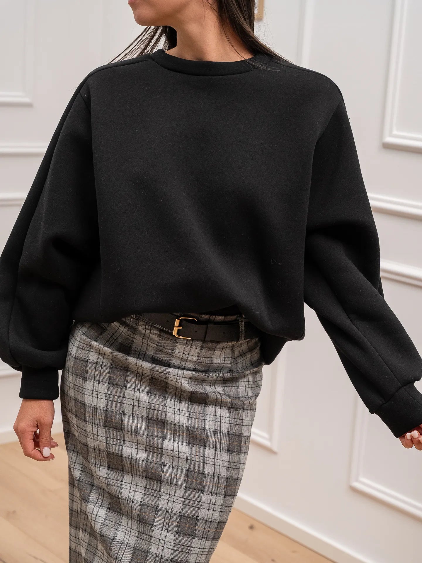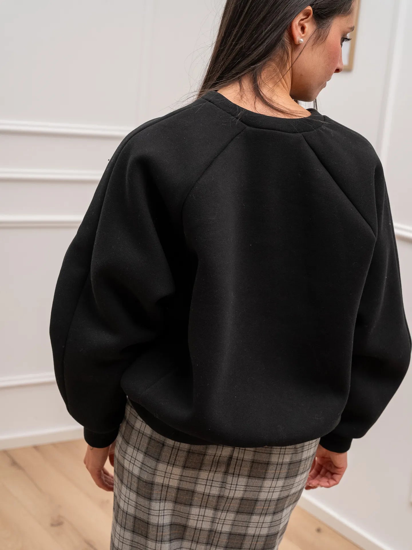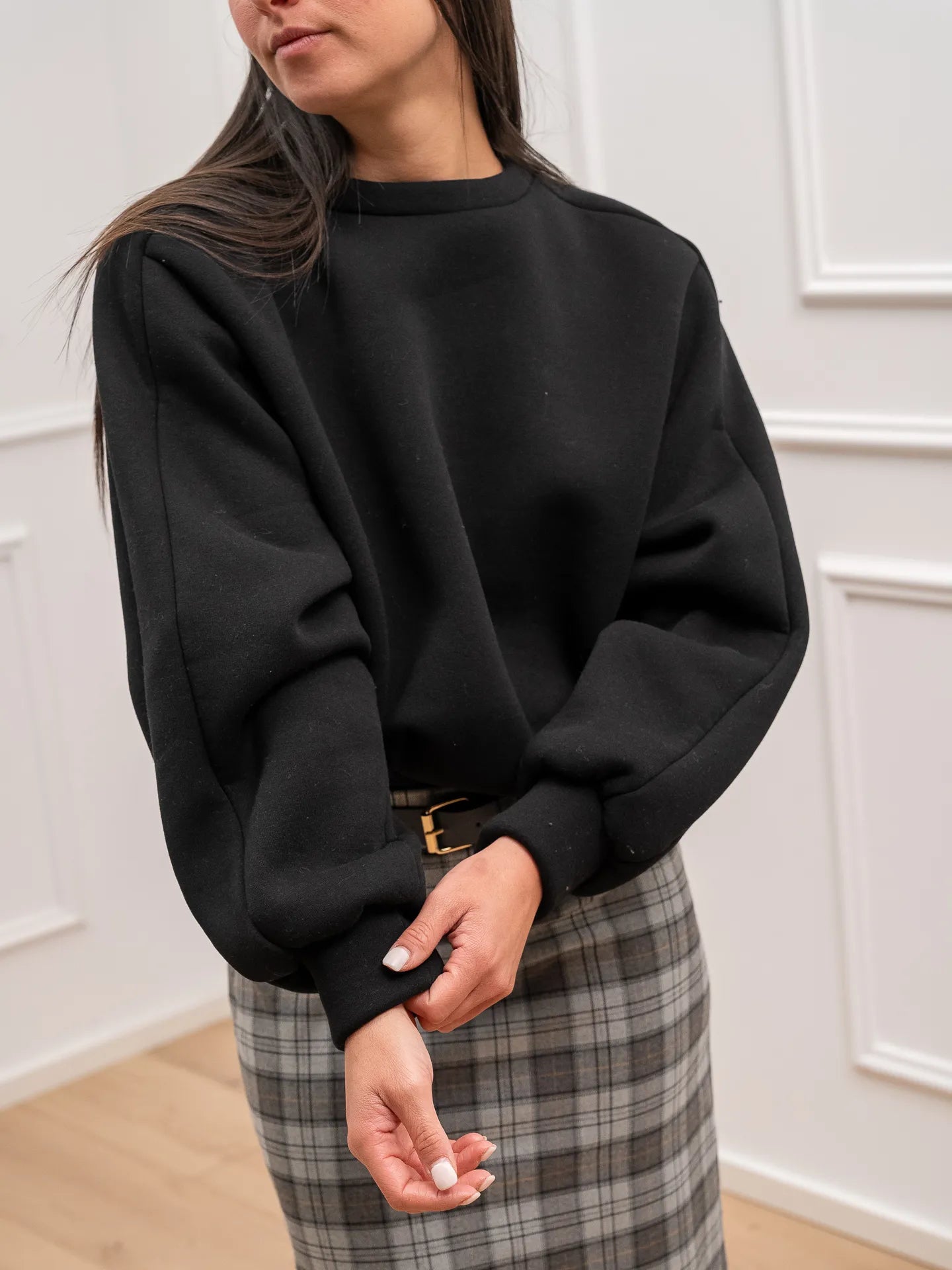 Felpa interno felpato color nero HaveOne. Modello fit over con manica a palloncino, girocollo e maniche lunghe con polsino sul fondo.
