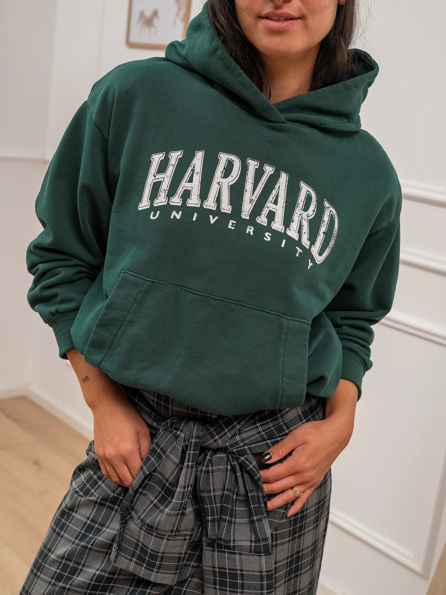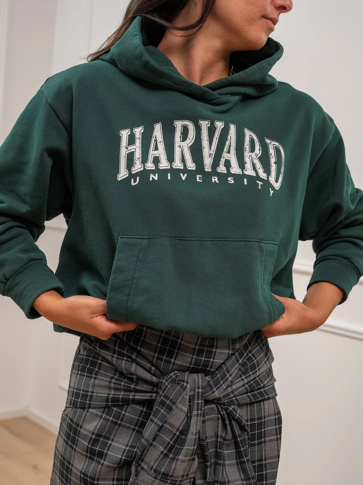 Felpa "Harvard" color verde bosco Vicolo. Modello a palloncino con fondo arricciati. Tasca frontale e cappuccio. Dettaglio di stampa "Harvard" a contrasto. Maniche lunghe con polsino.