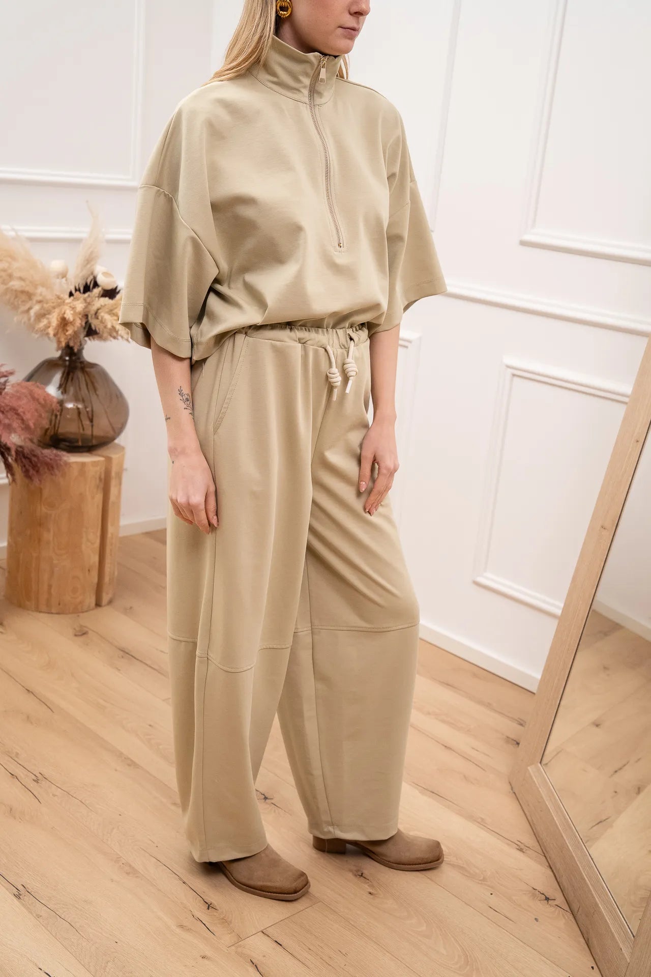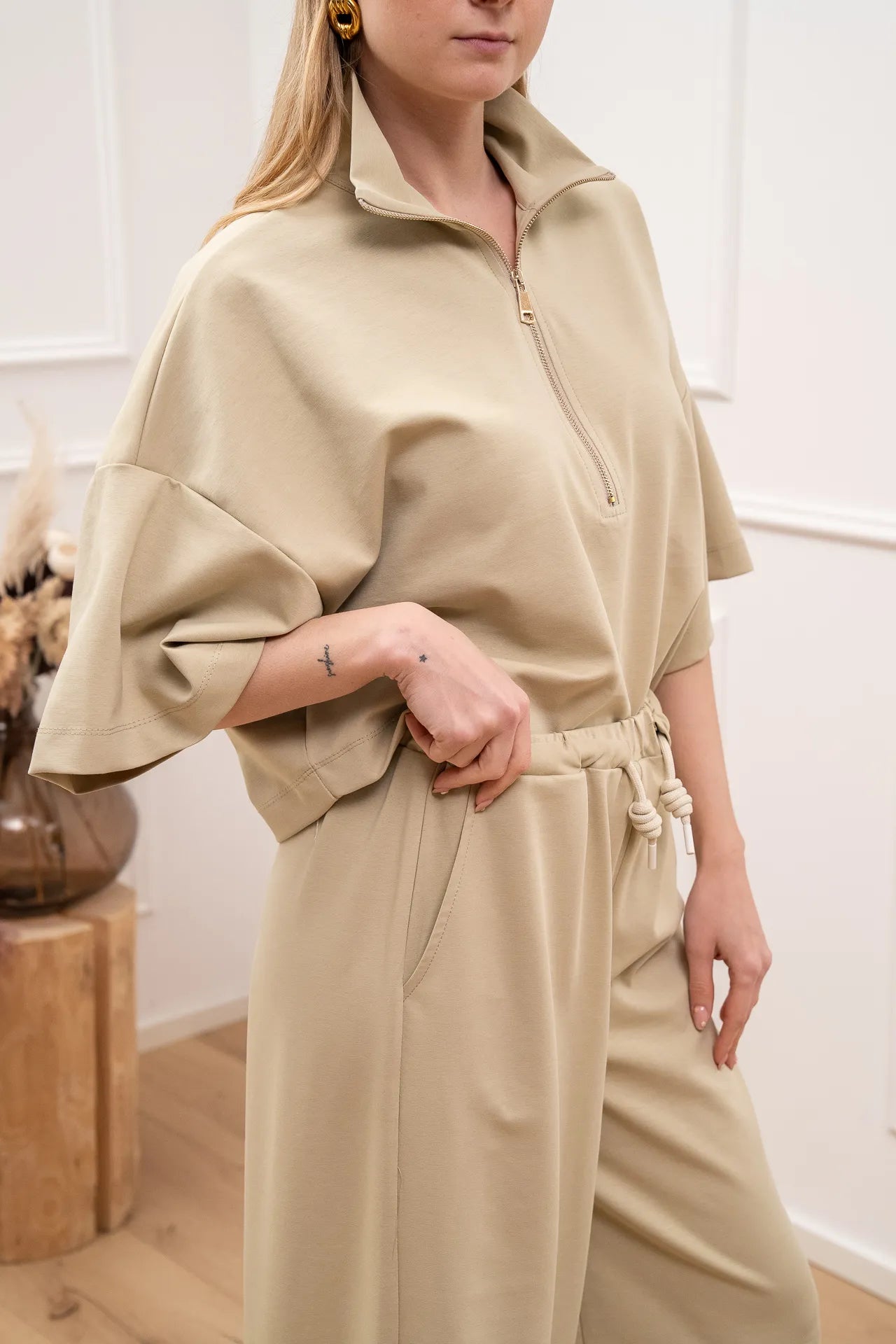 Felpa soft touch color beige Vicolo. Modello con colletto e chiusura con mezza zip. Fit morbido con spalla scesa e mazza manica.