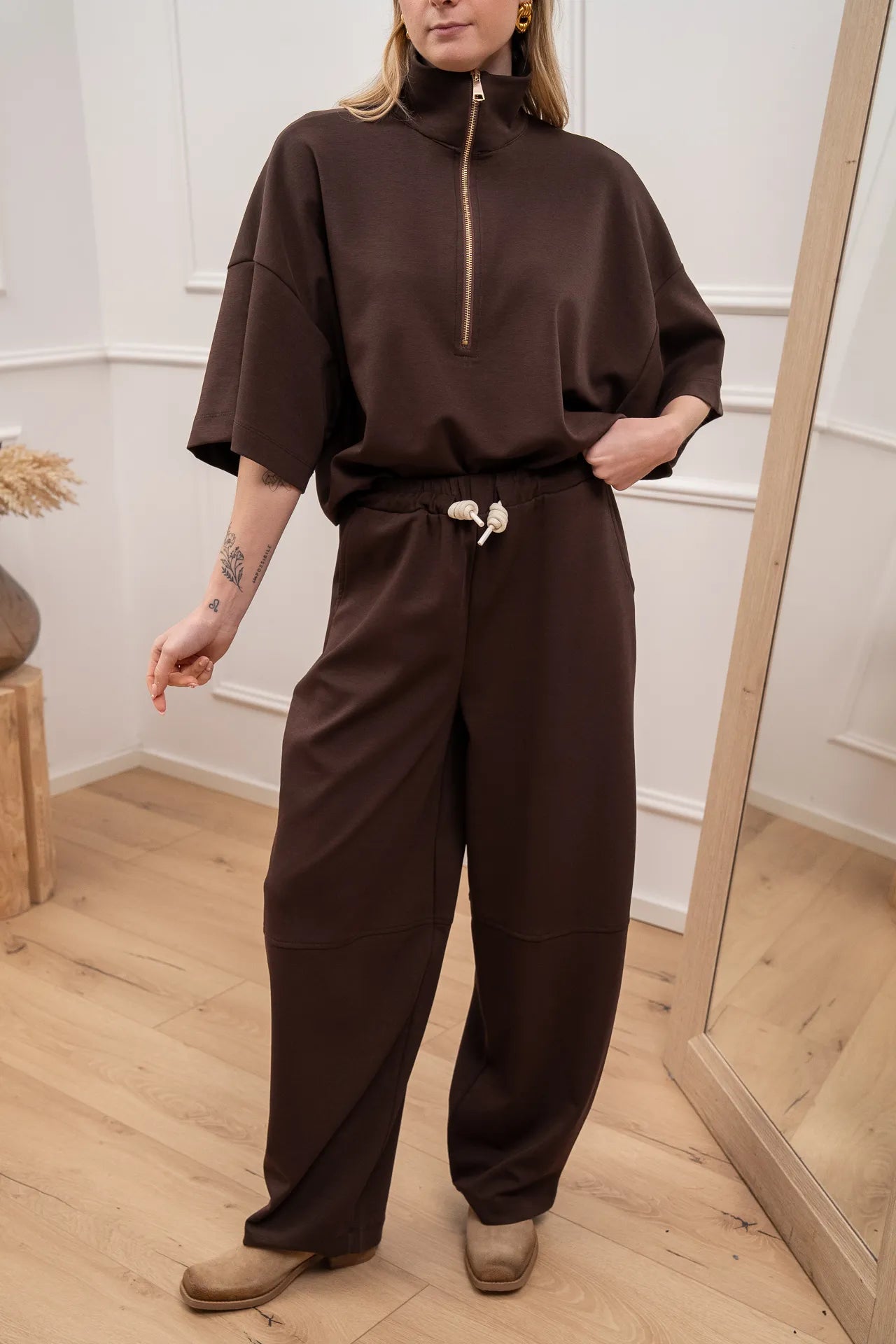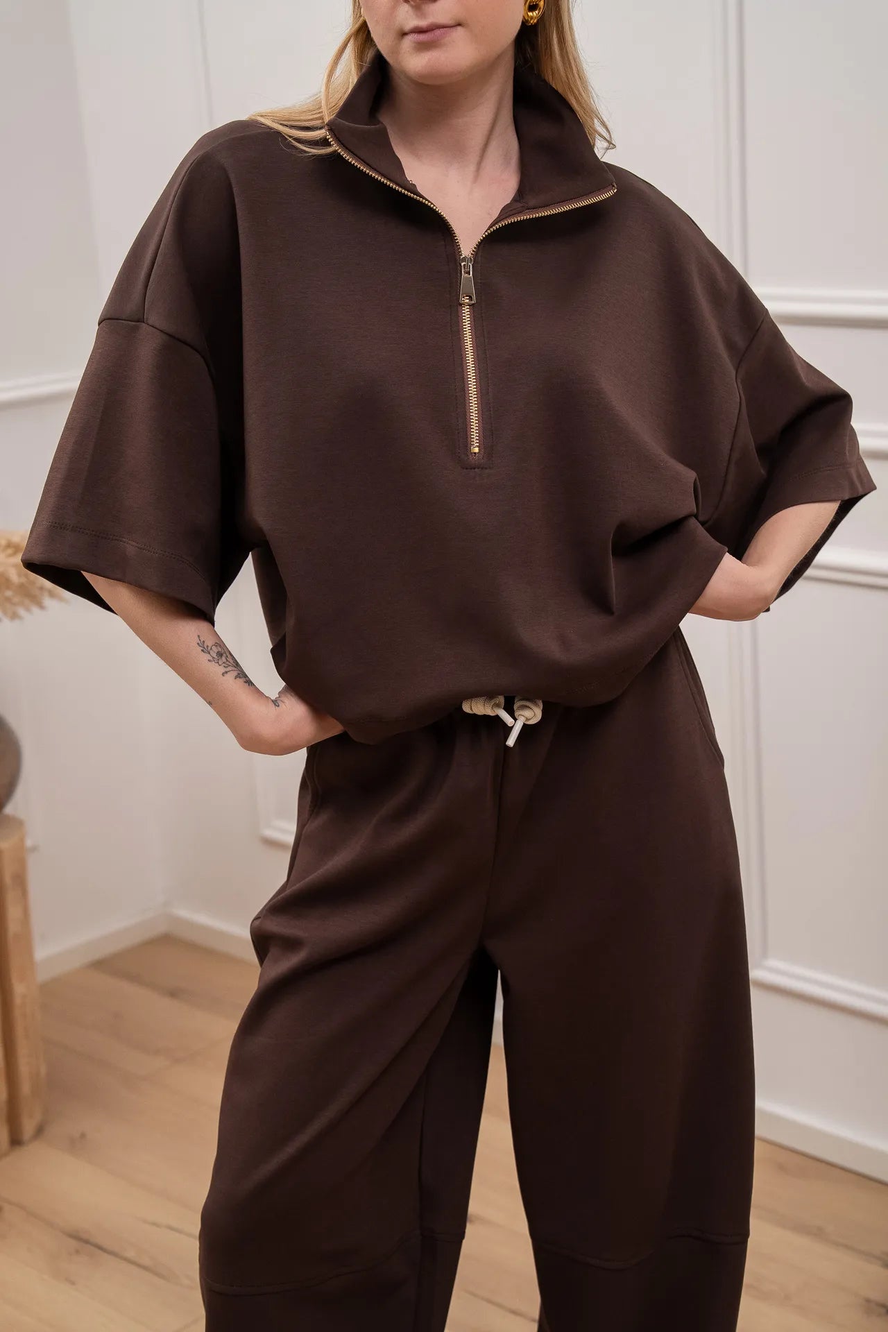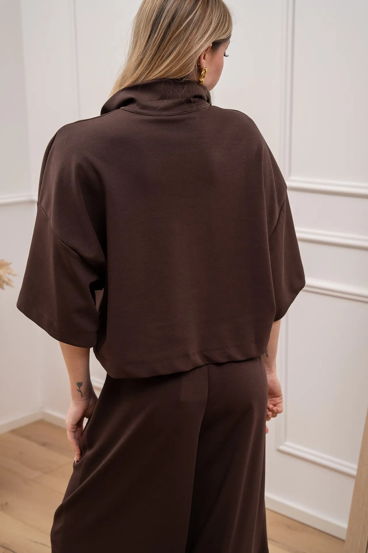 Felpa soft touch color moro Vicolo. Modello con colletto e chiusura con mezza zip. Fit morbido con spalla scesa e mazza manica.