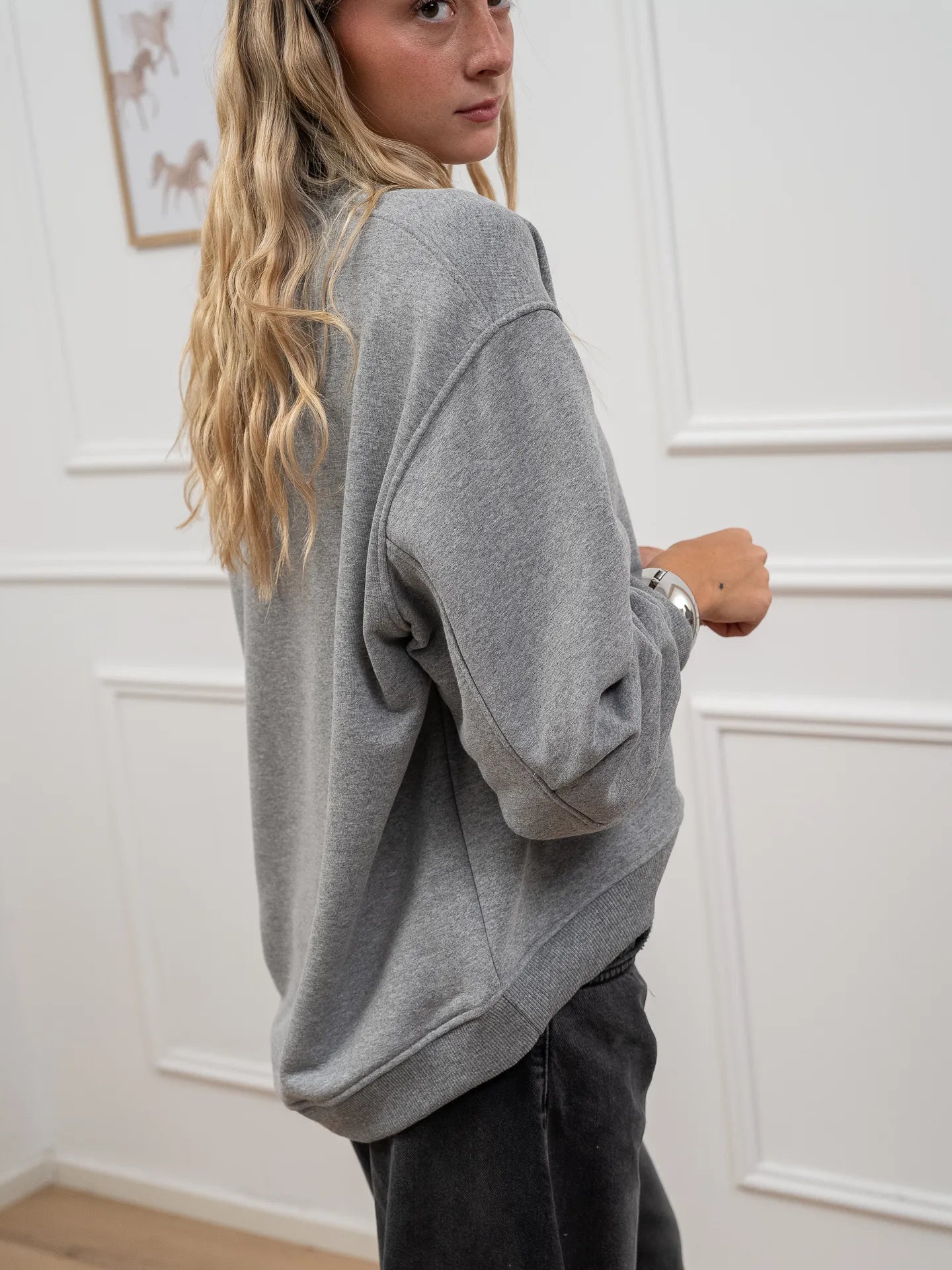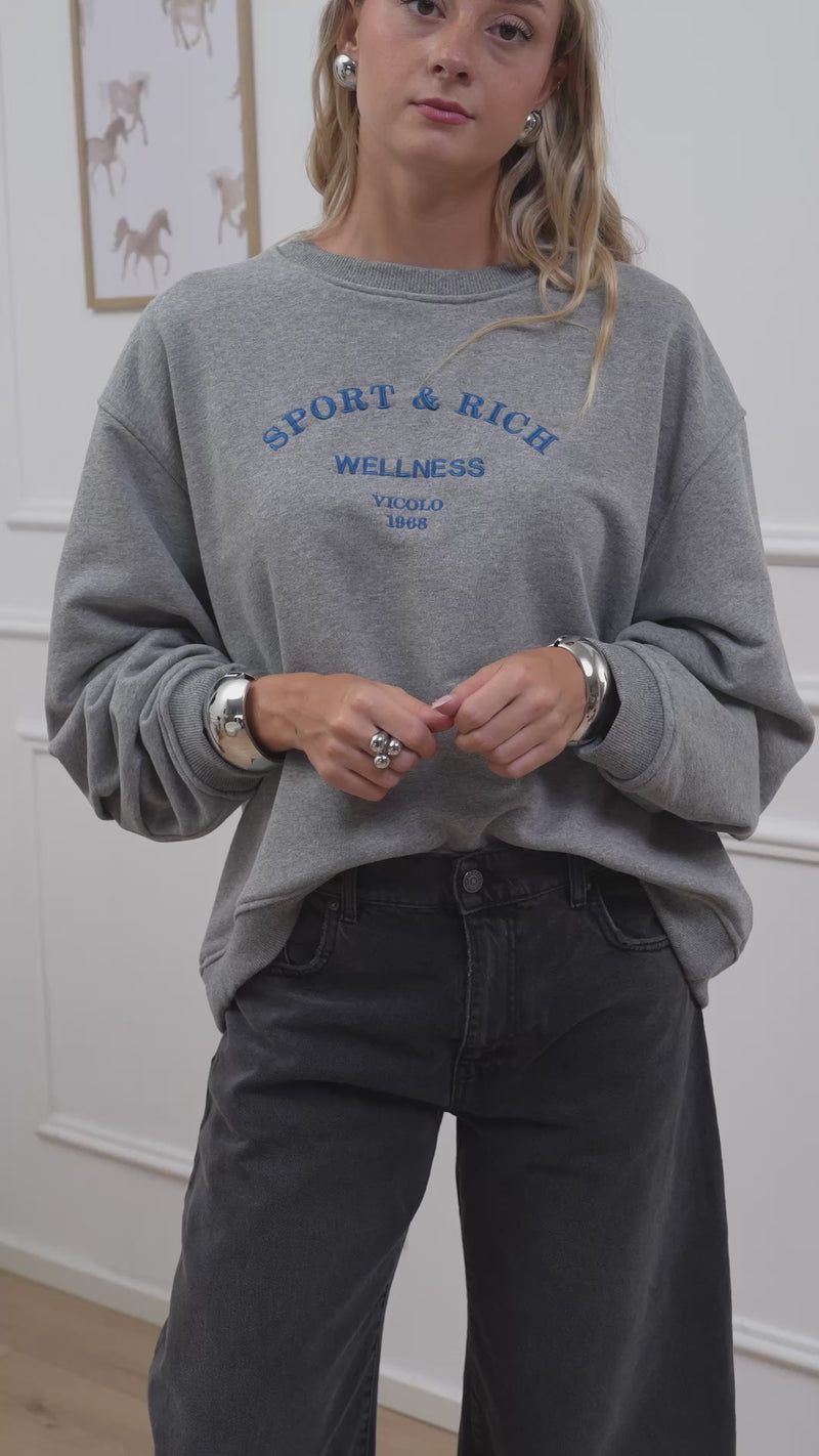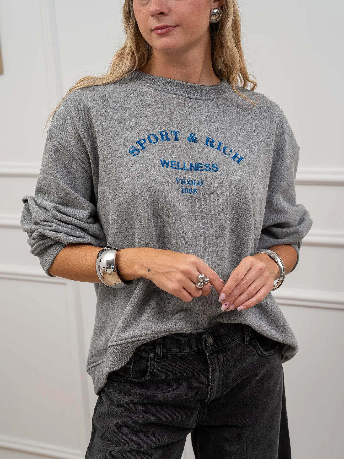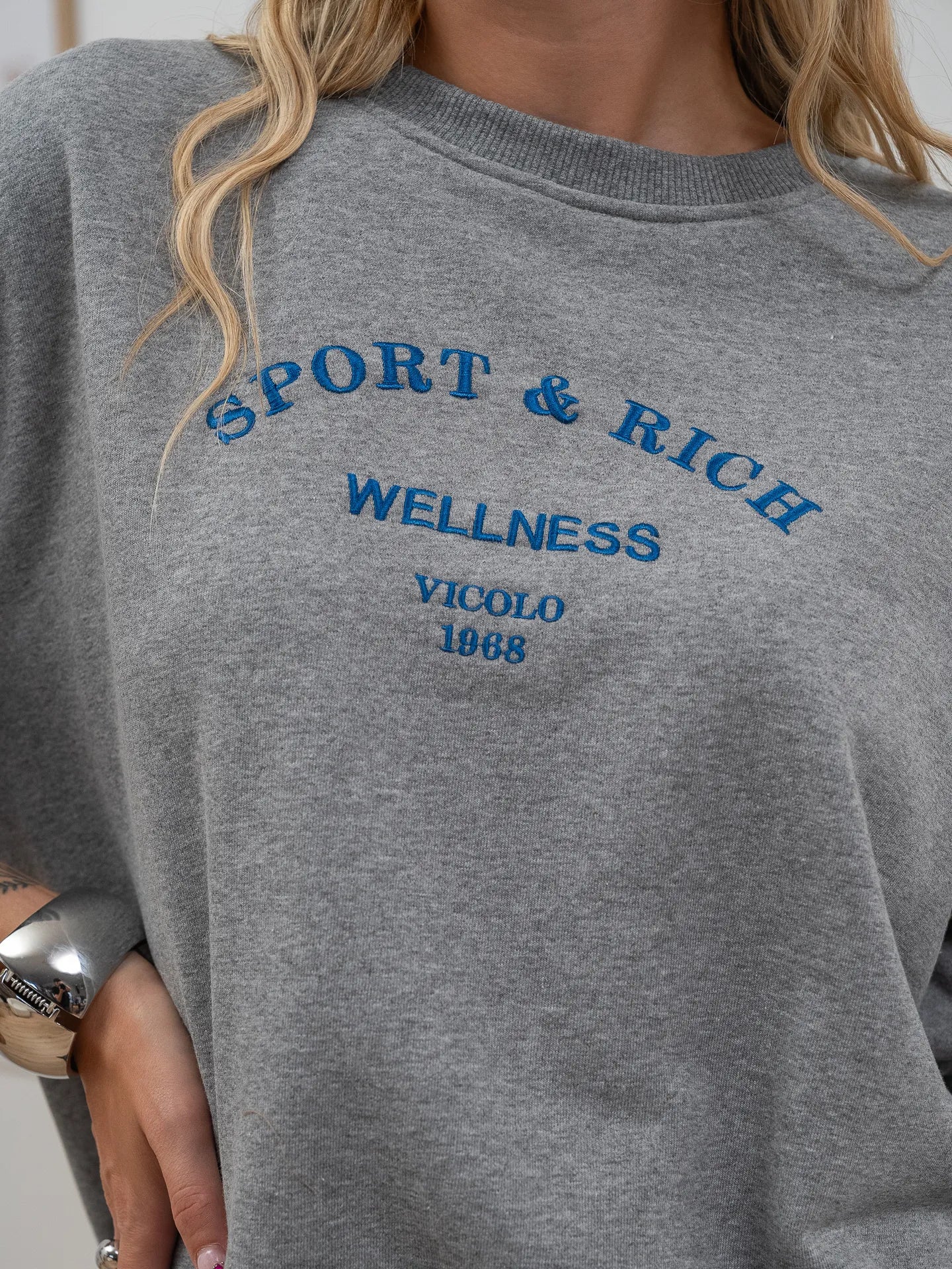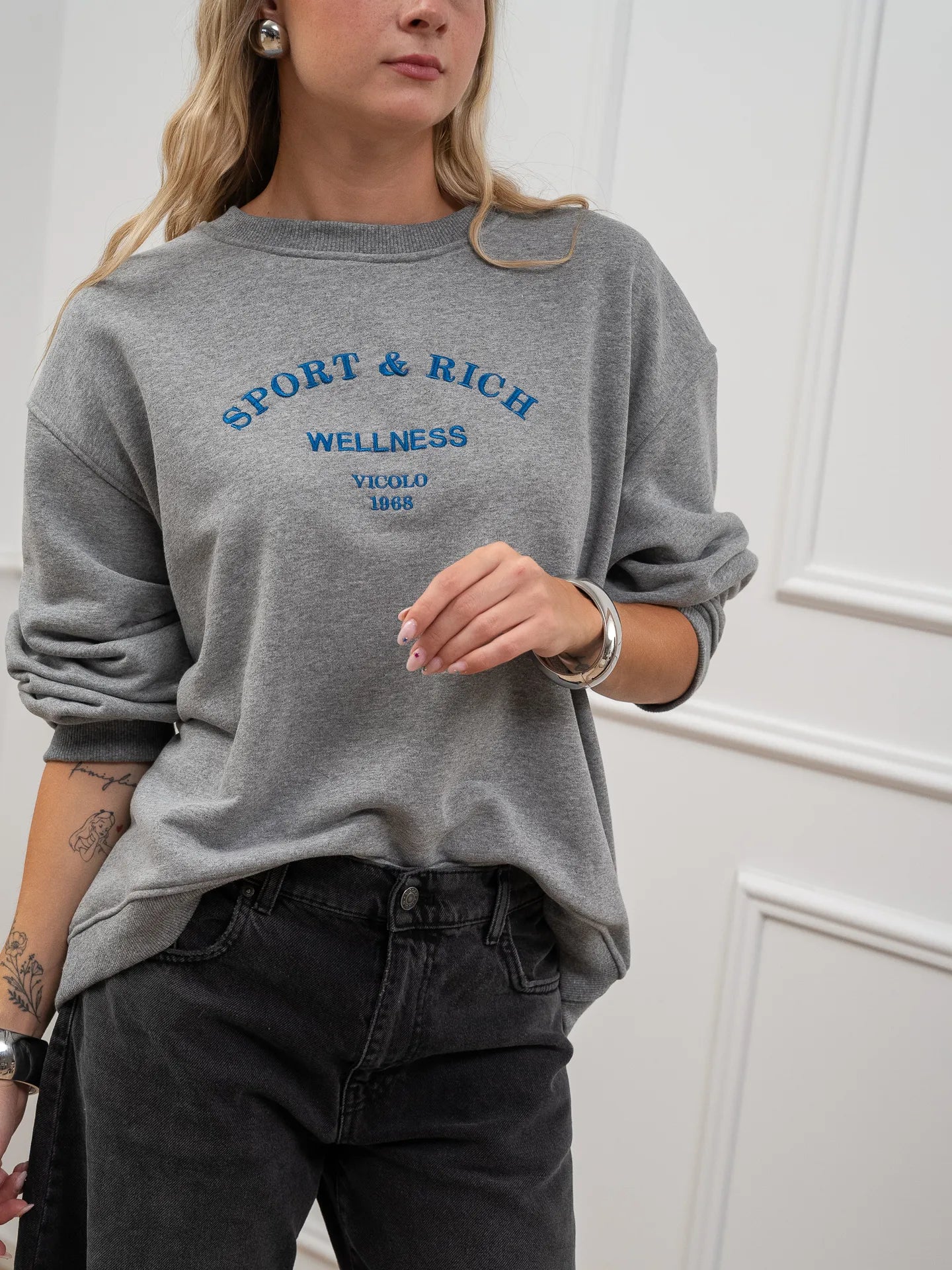 Felpa color grigio mélange Vicolo. Modello basic fit oversize girocollo a manica lunga con dettaglio di arricciatura sul retro. Ricamo frontale a contrasto "Sport & Rich".