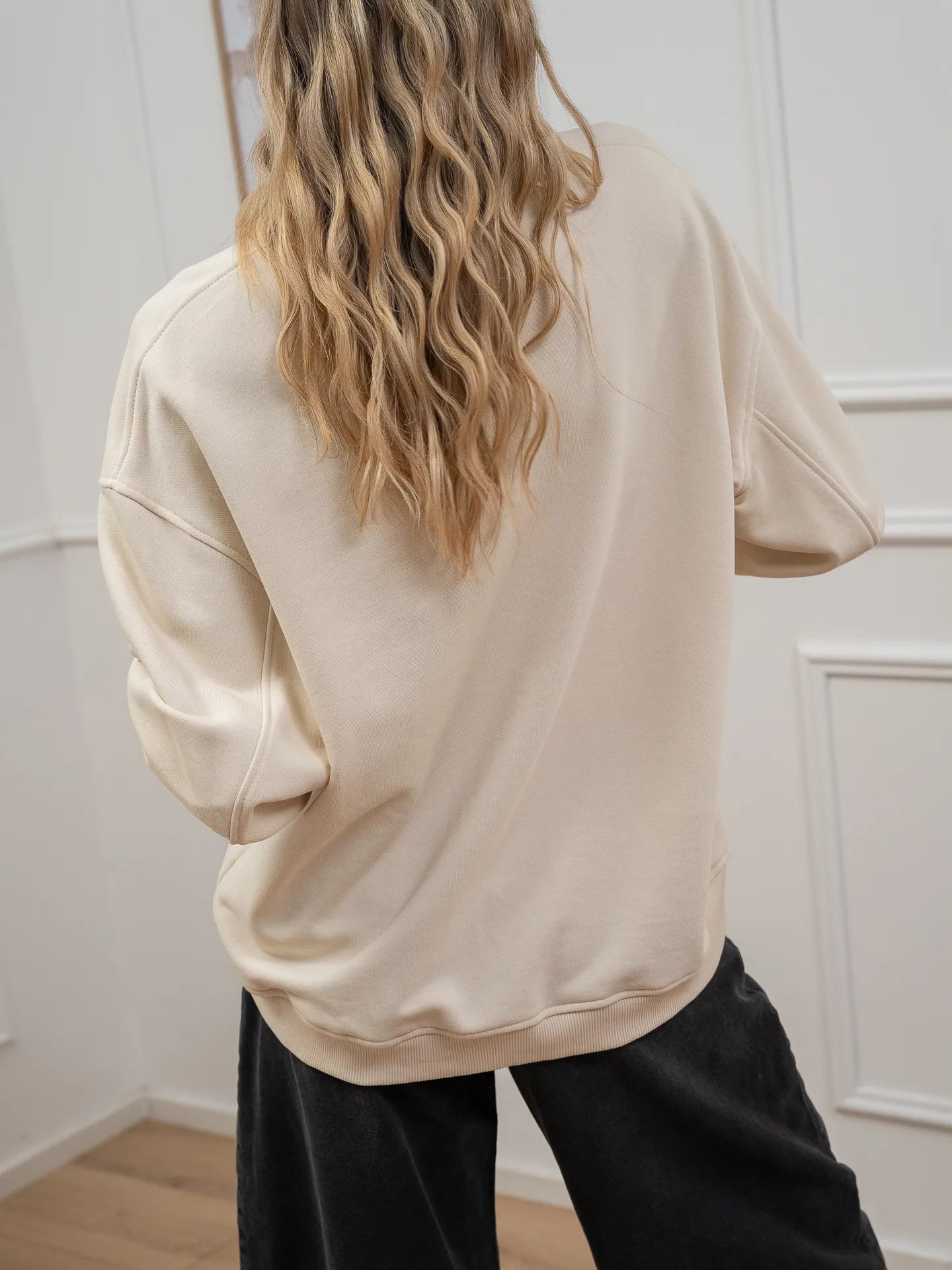 Felpa color vaniglia Vicolo. Modello basic fit oversize girocollo a manica lunga con dettaglio di arricciatura sul retro. Ricamo frontale a contrasto "Sport & Rich".
