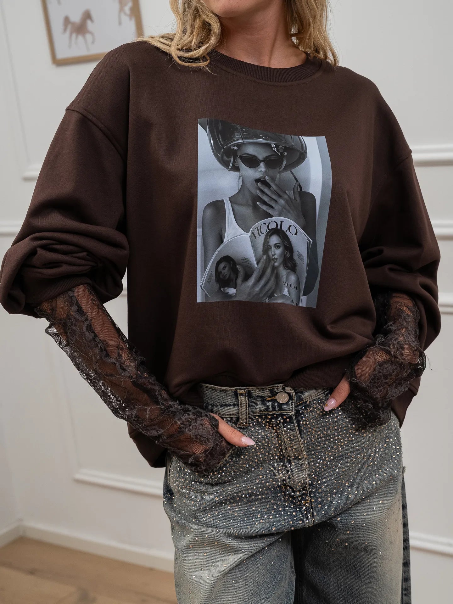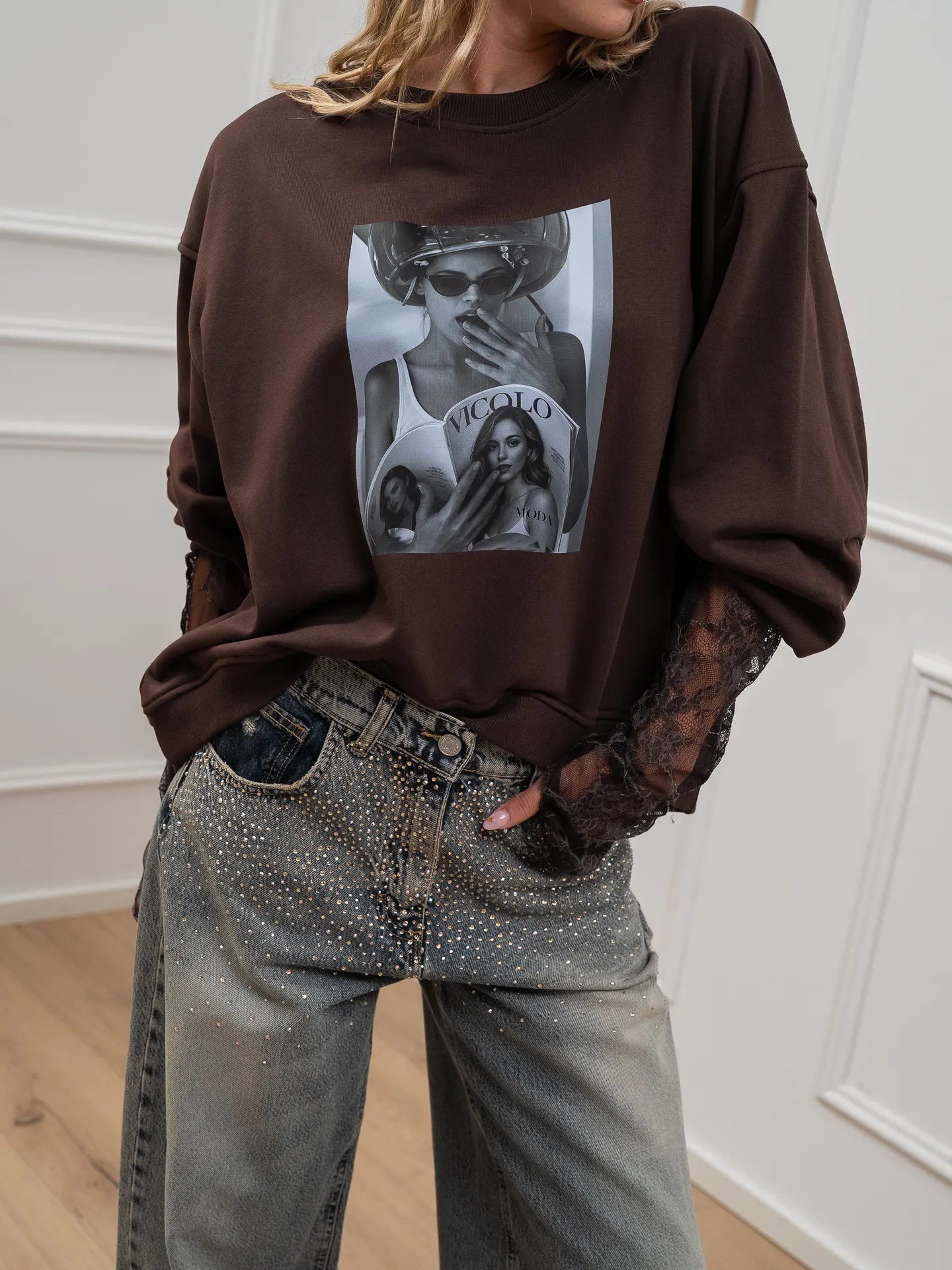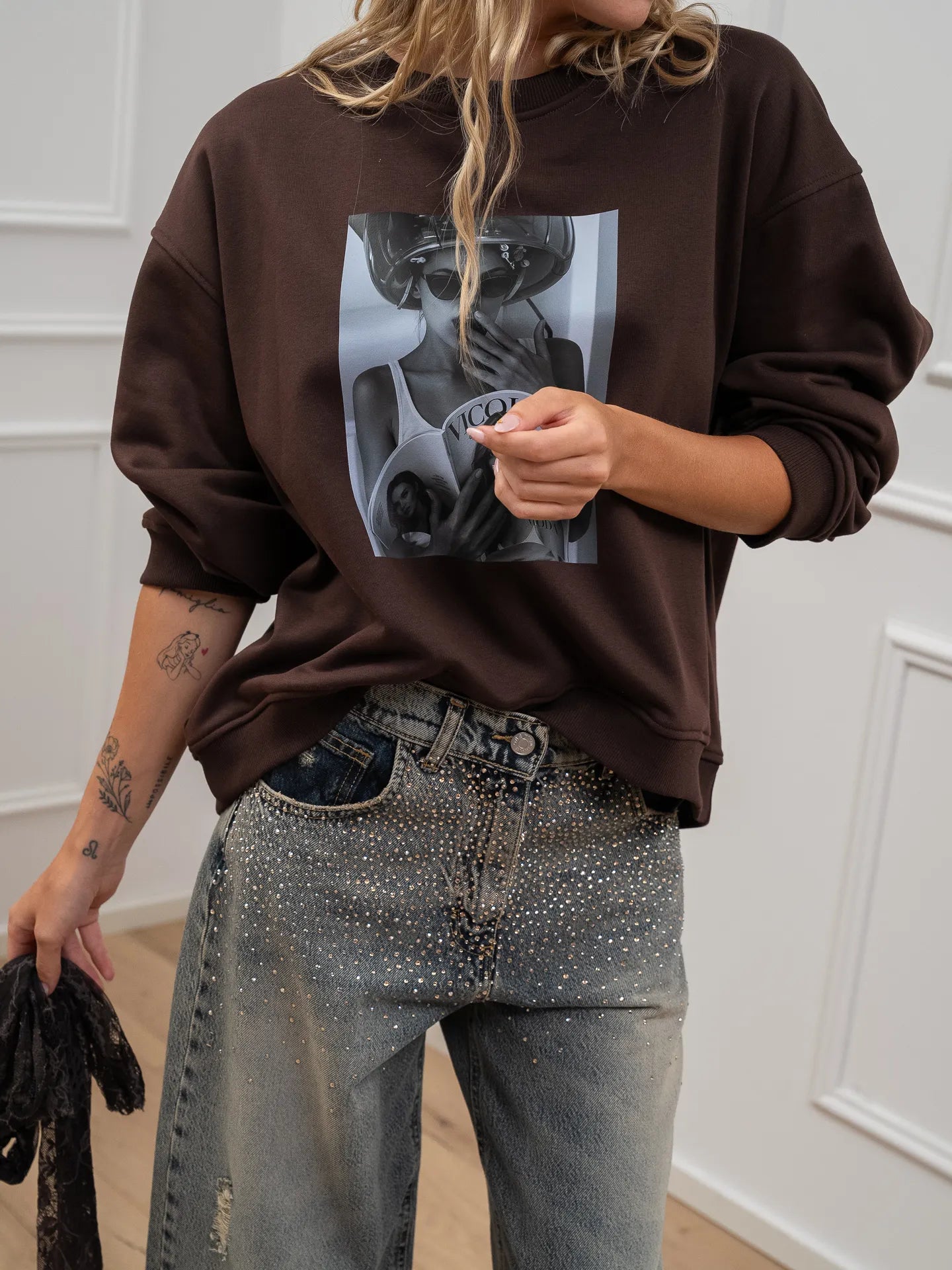 Felpa color moro in cotone Vicolo. Modello a manica lunga girocollo con dettaglio di stampa Vanity frontale.