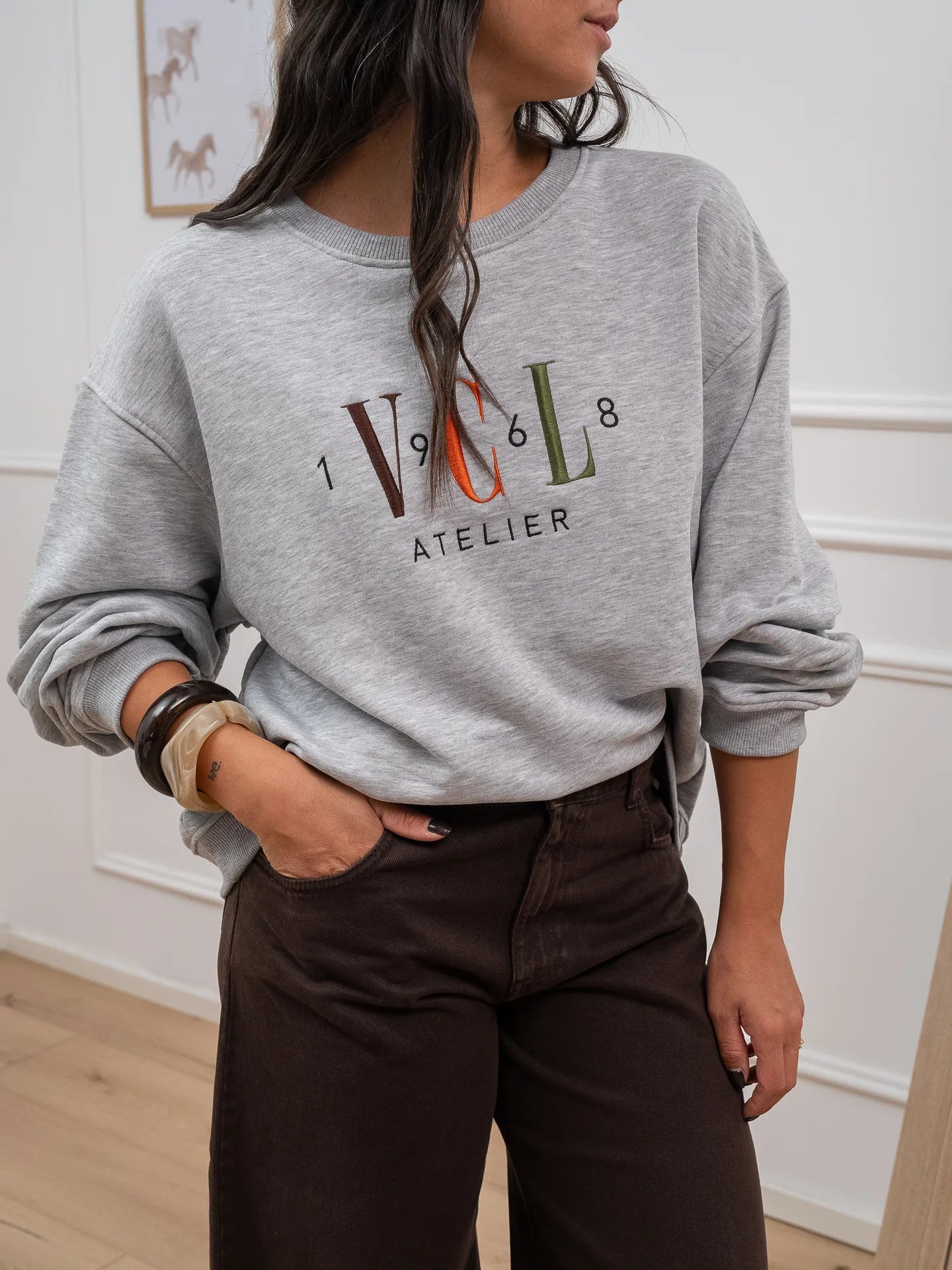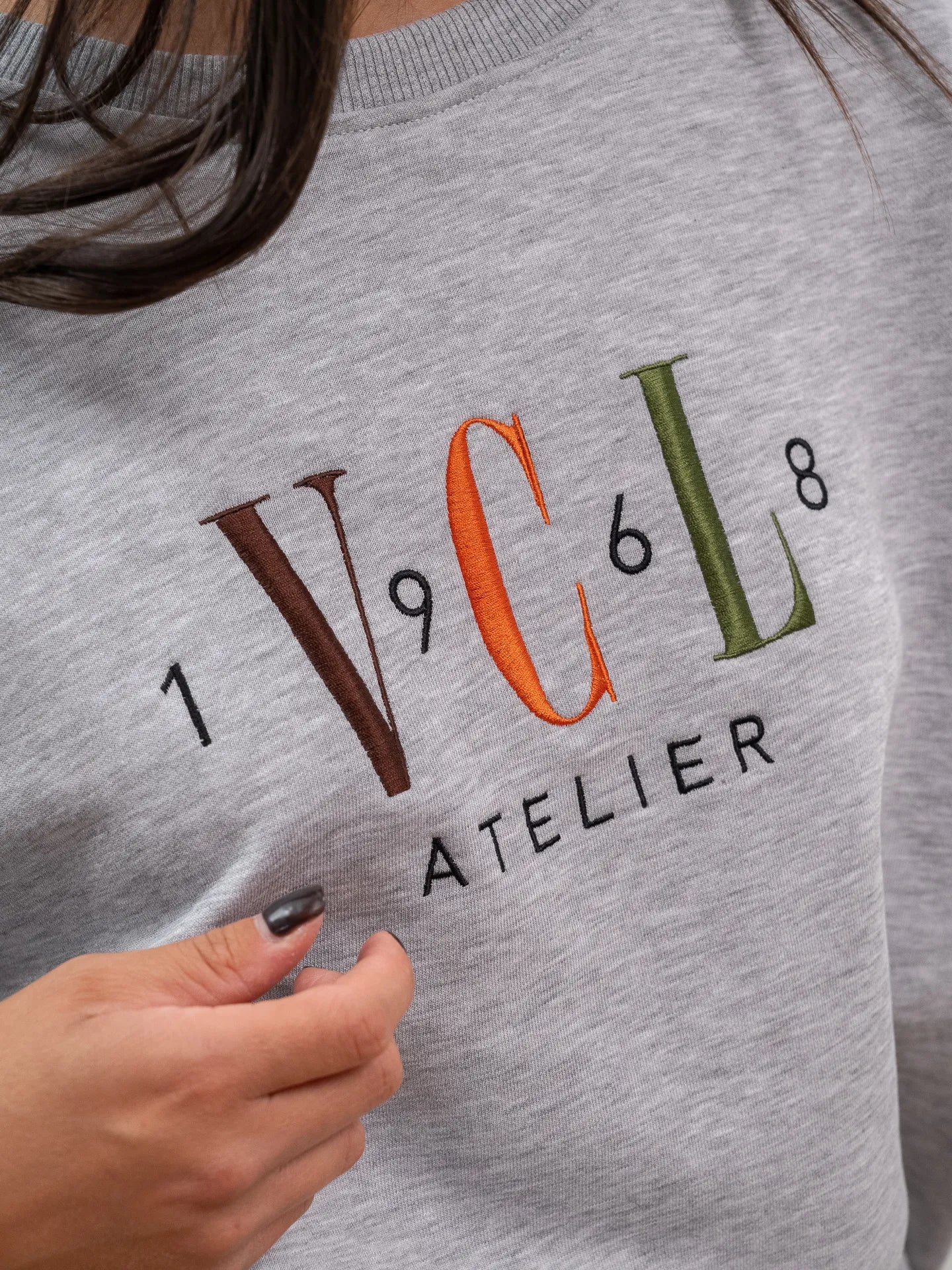 Felpa "VCL atelier" color grigio Vicolo. Modello fit oversize girocollo a manica lunga con dettaglio di arriccio sul retro. Ricamo frontale multicolor "VCL atelier". Finiture a costine.