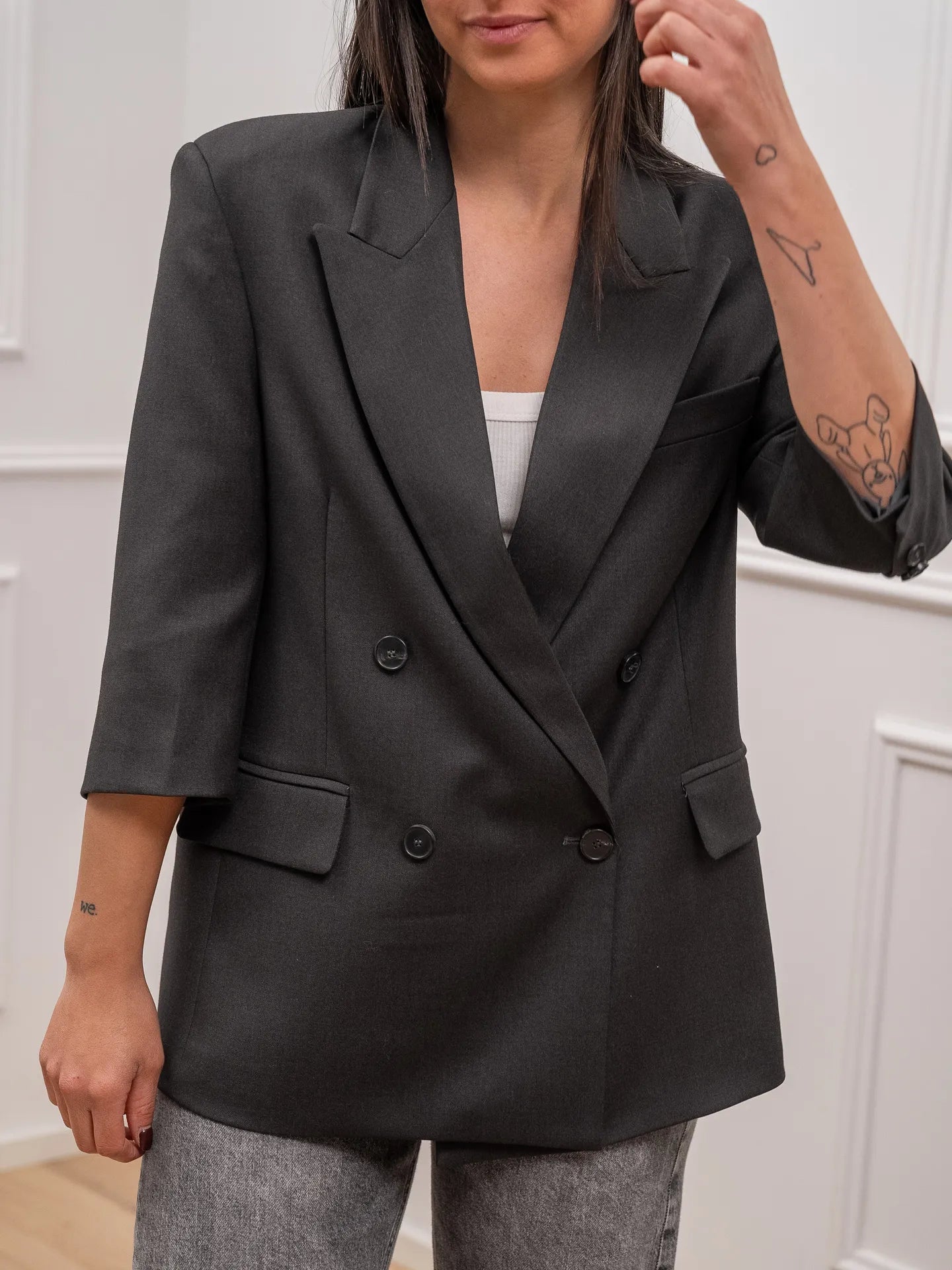 Giacca Audrey color grigio piombo Vicolo. Modello con chiusura frontale doppiopetto e mezza manica. Dettaglio di guanti in ecopelle rimovibili. Tasche con patta.