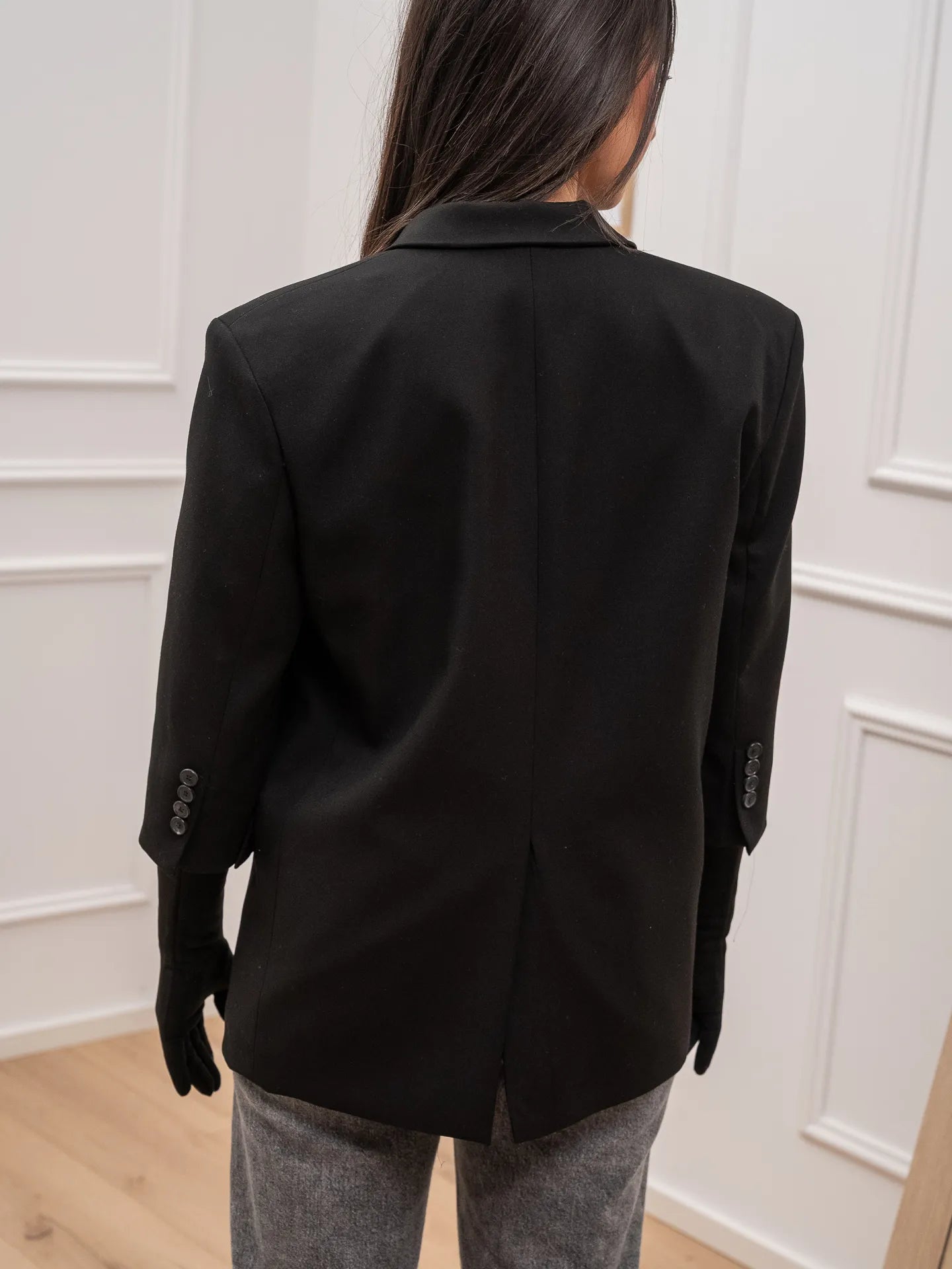 Giacca Audrey color nero Vicolo. Modello con chiusura frontale doppiopetto e mezza manica. Dettaglio di guanti in ecopelle rimovibili. Tasche con patta.