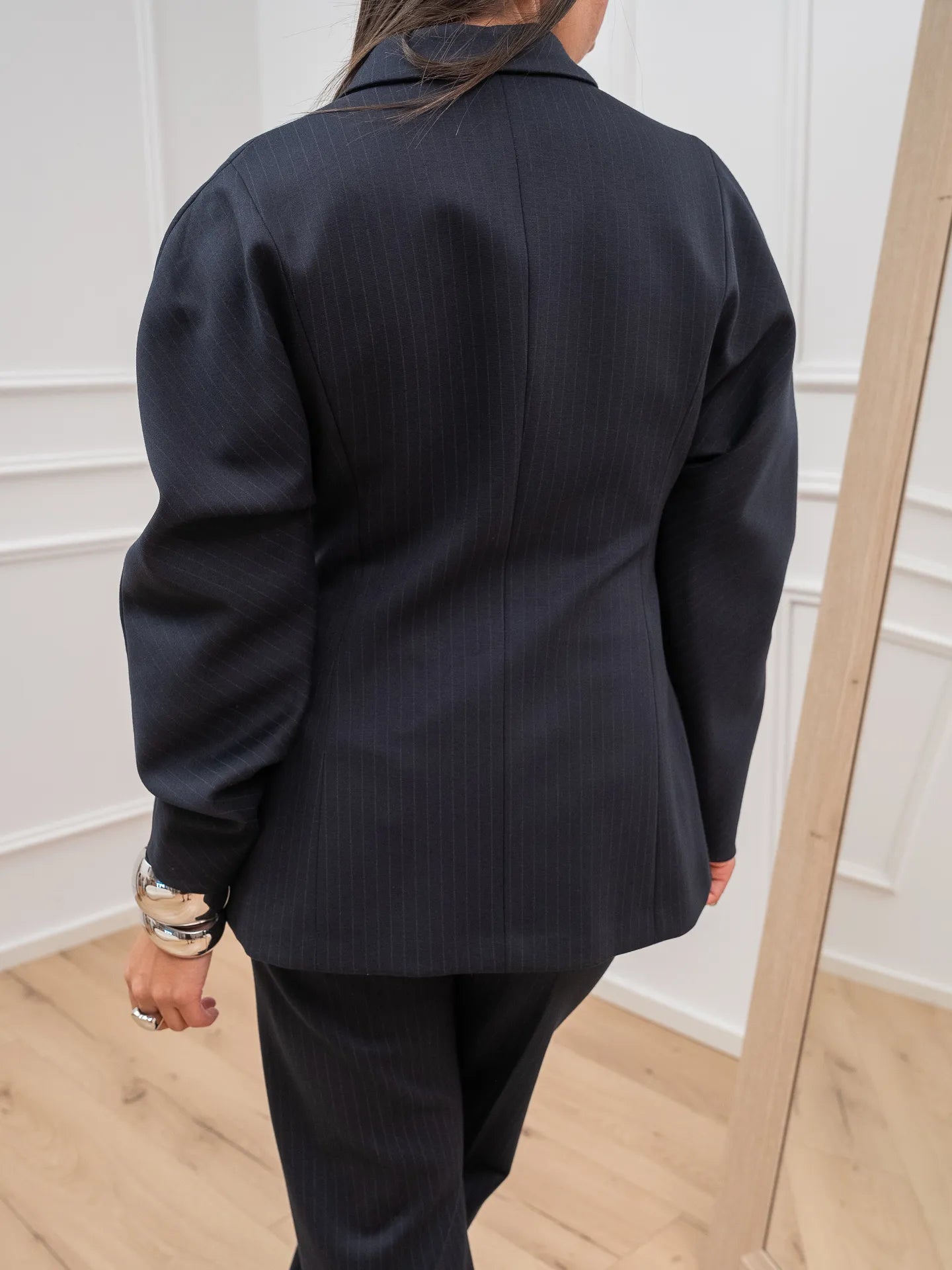 Giacca blu gessata in punto milano Vicolo. Modello chiusura frontale monopetto a tre bottoni. Collo revers e maniche a prosciutto. Tasche a filetto frontali.
